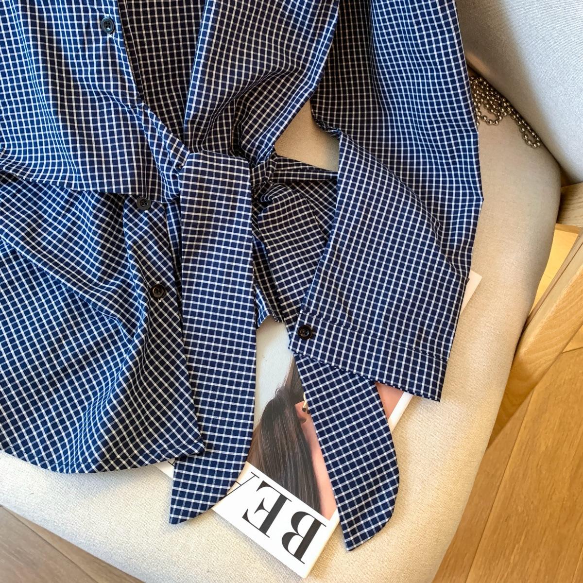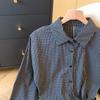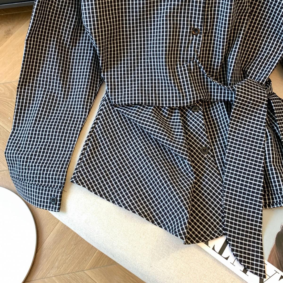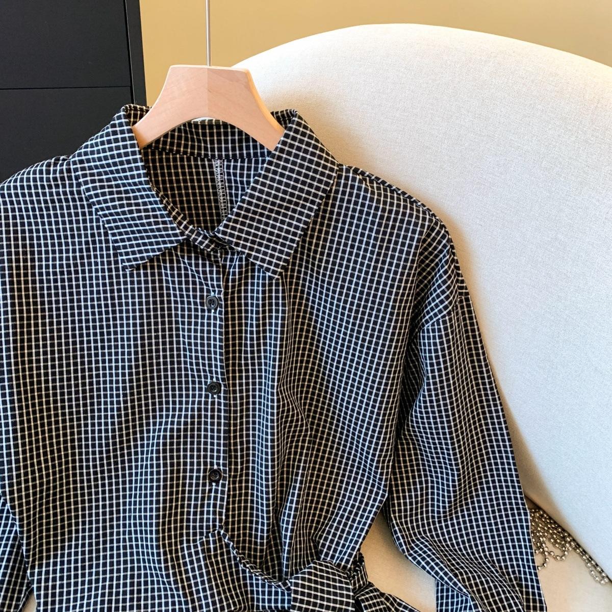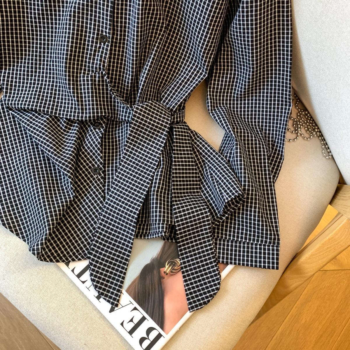 Foto Real Camisa de Cuadros Retro a la Moda Mujer 2025 Otoño Nueva Cuello Polo Diseño con Lazo Recogido en la Cintura Top de Manga Larga