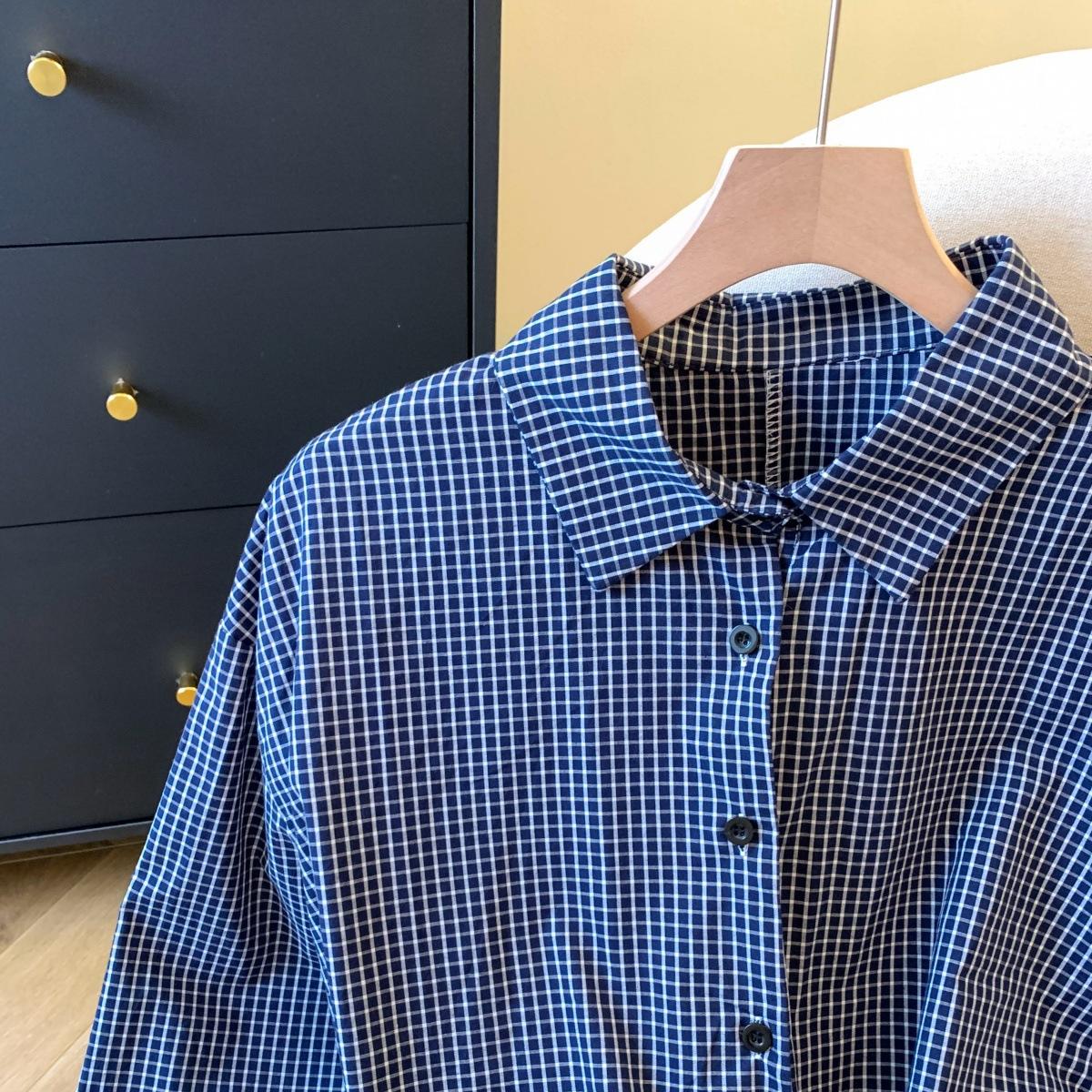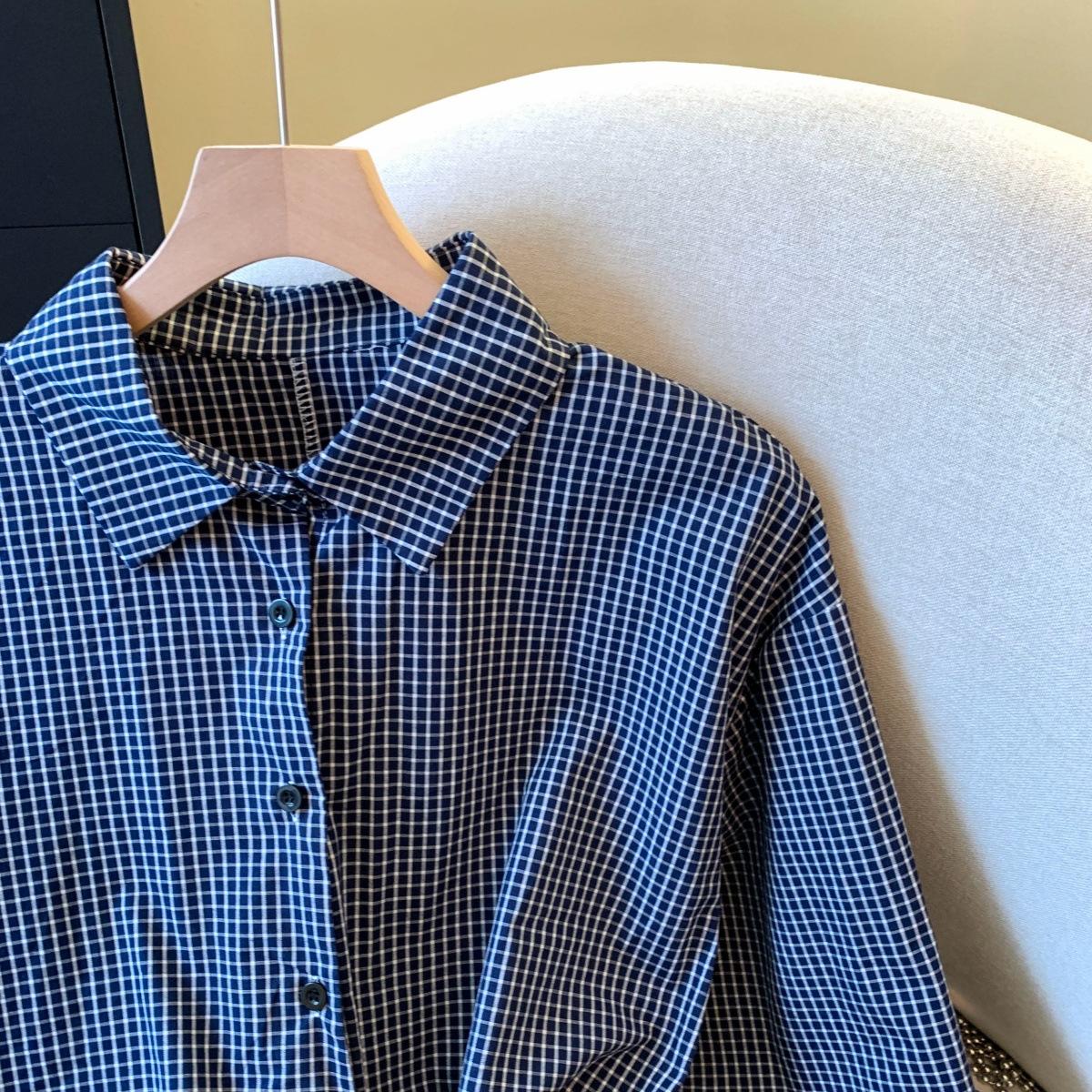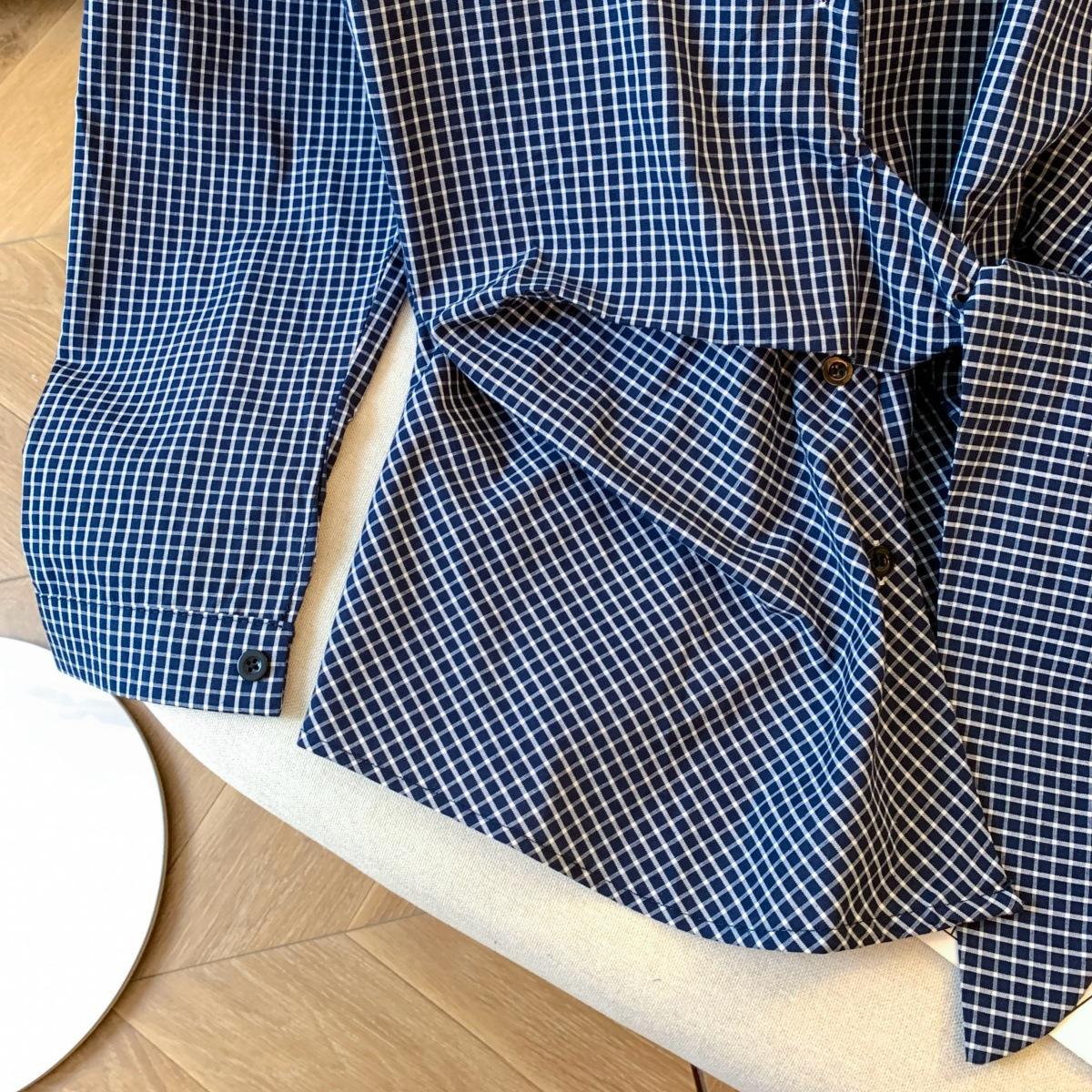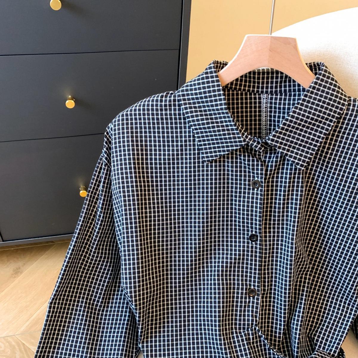 Foto Real Camisa de Cuadros Retro a la Moda Mujer 2025 Otoño Nueva Cuello Polo Diseño con Lazo Recogido en la Cintura Top de Manga Larga