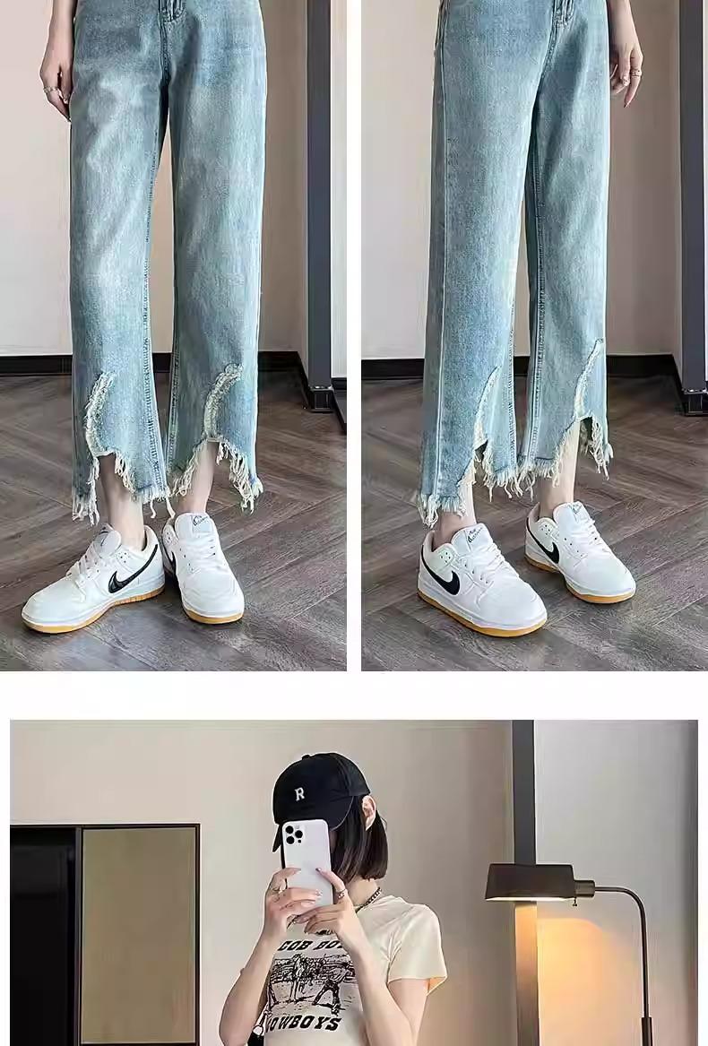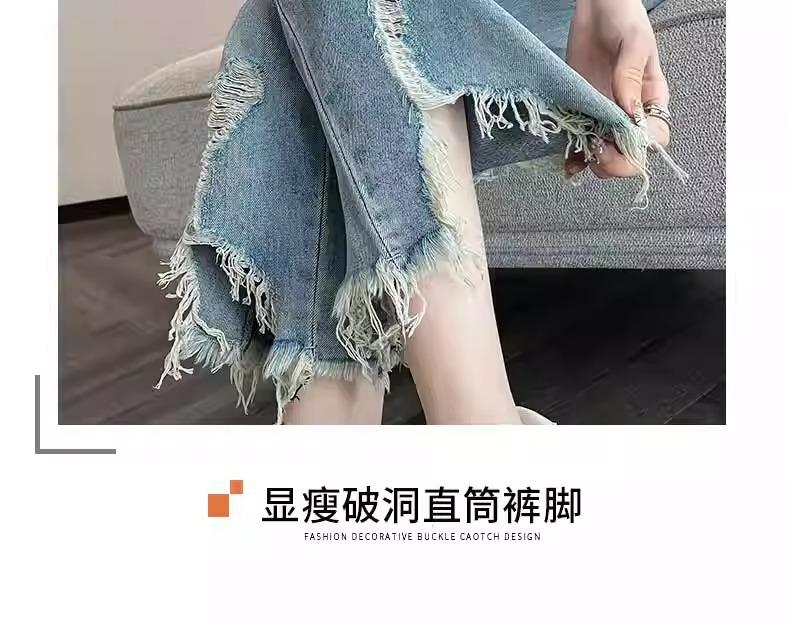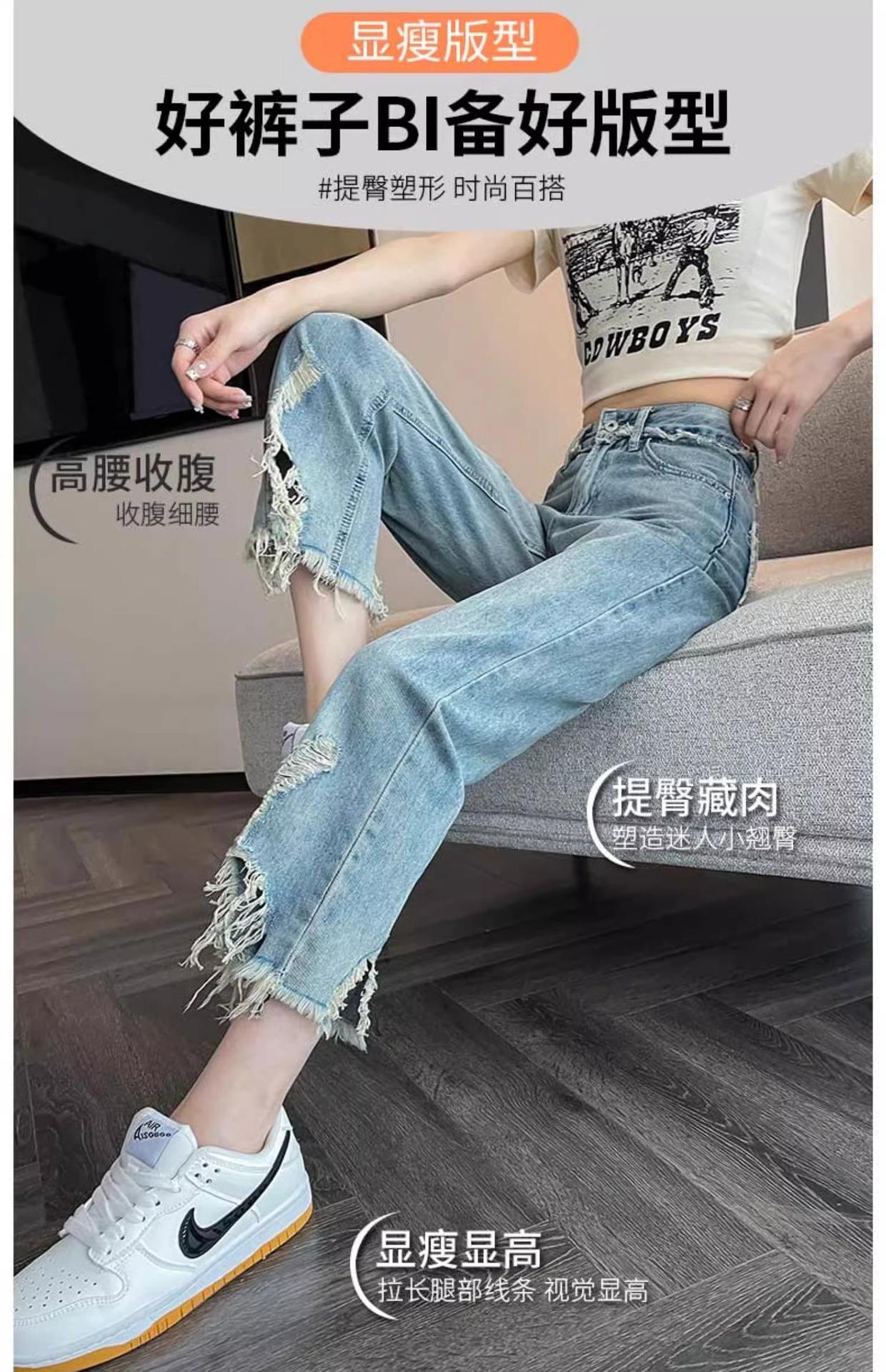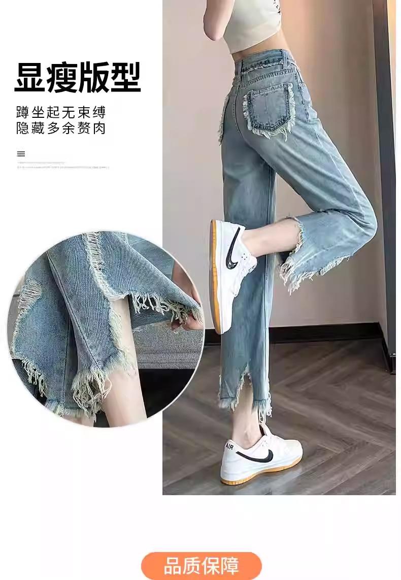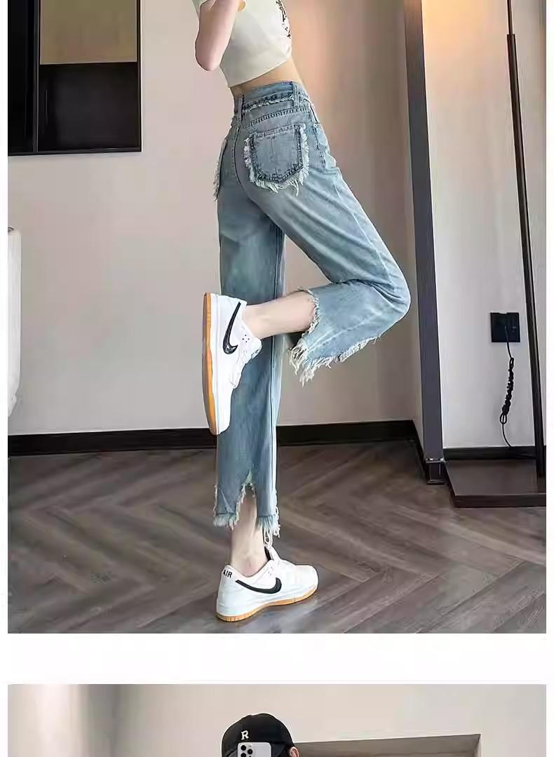 Jeans de Pierna Ancha para Mujer 9 Puntos Pequeño 150cm Vestido de Verano 8 Puntos Cintura Alta Sueltos Rotos Mendigo Pantalones Rectos