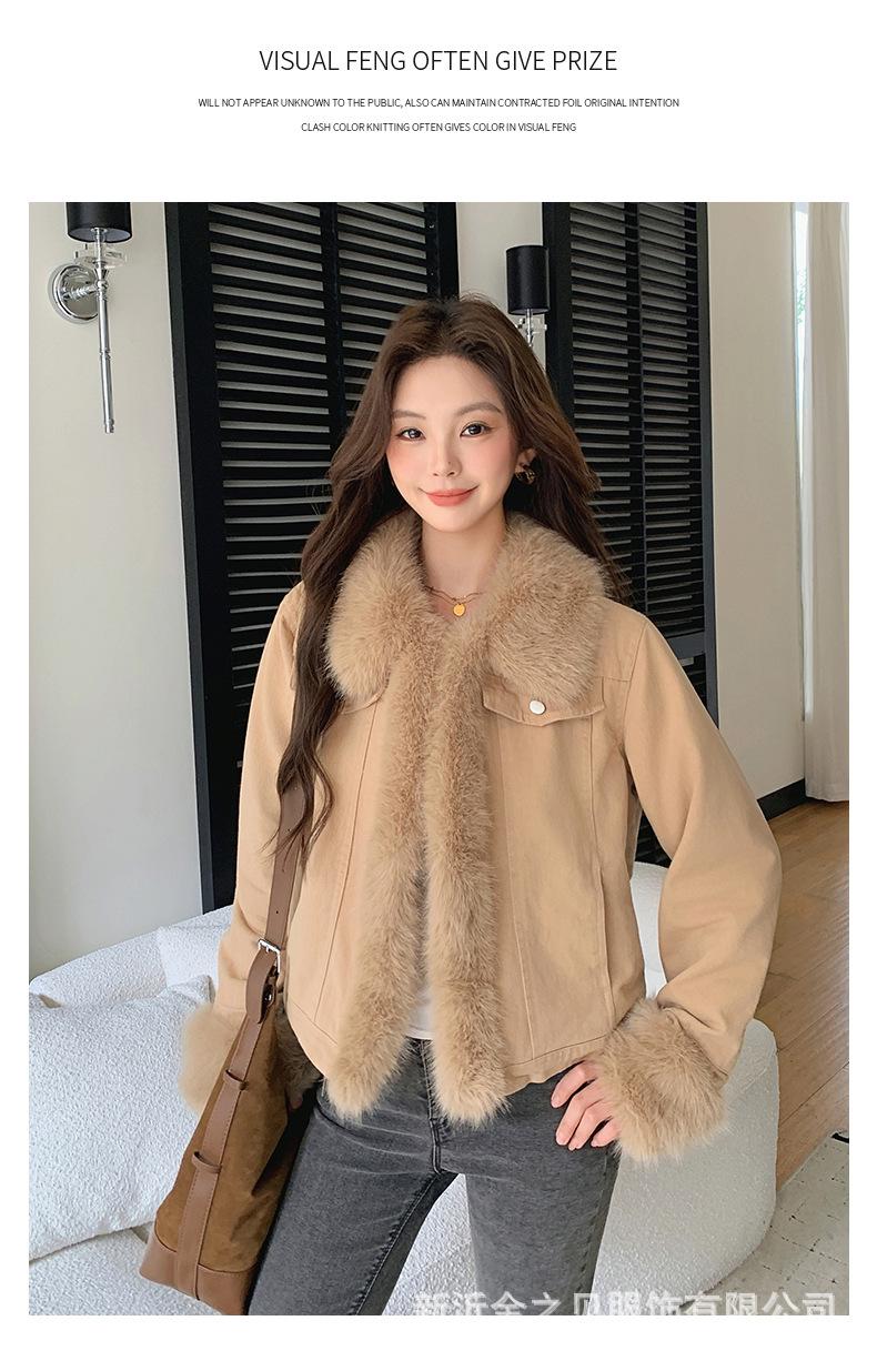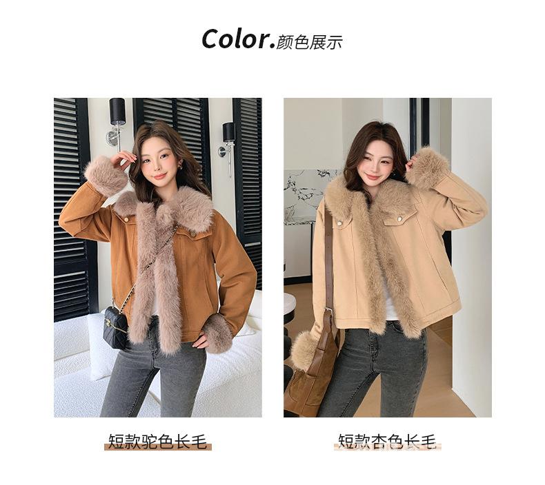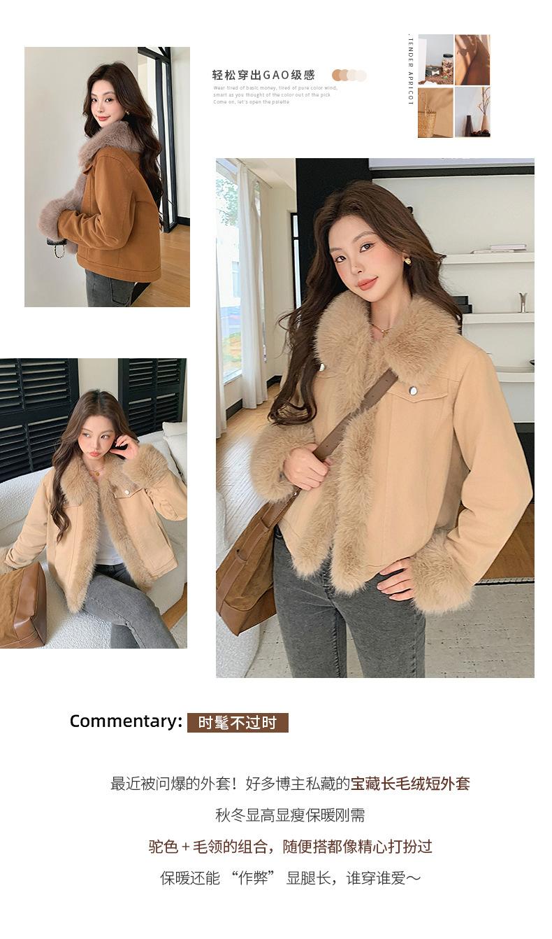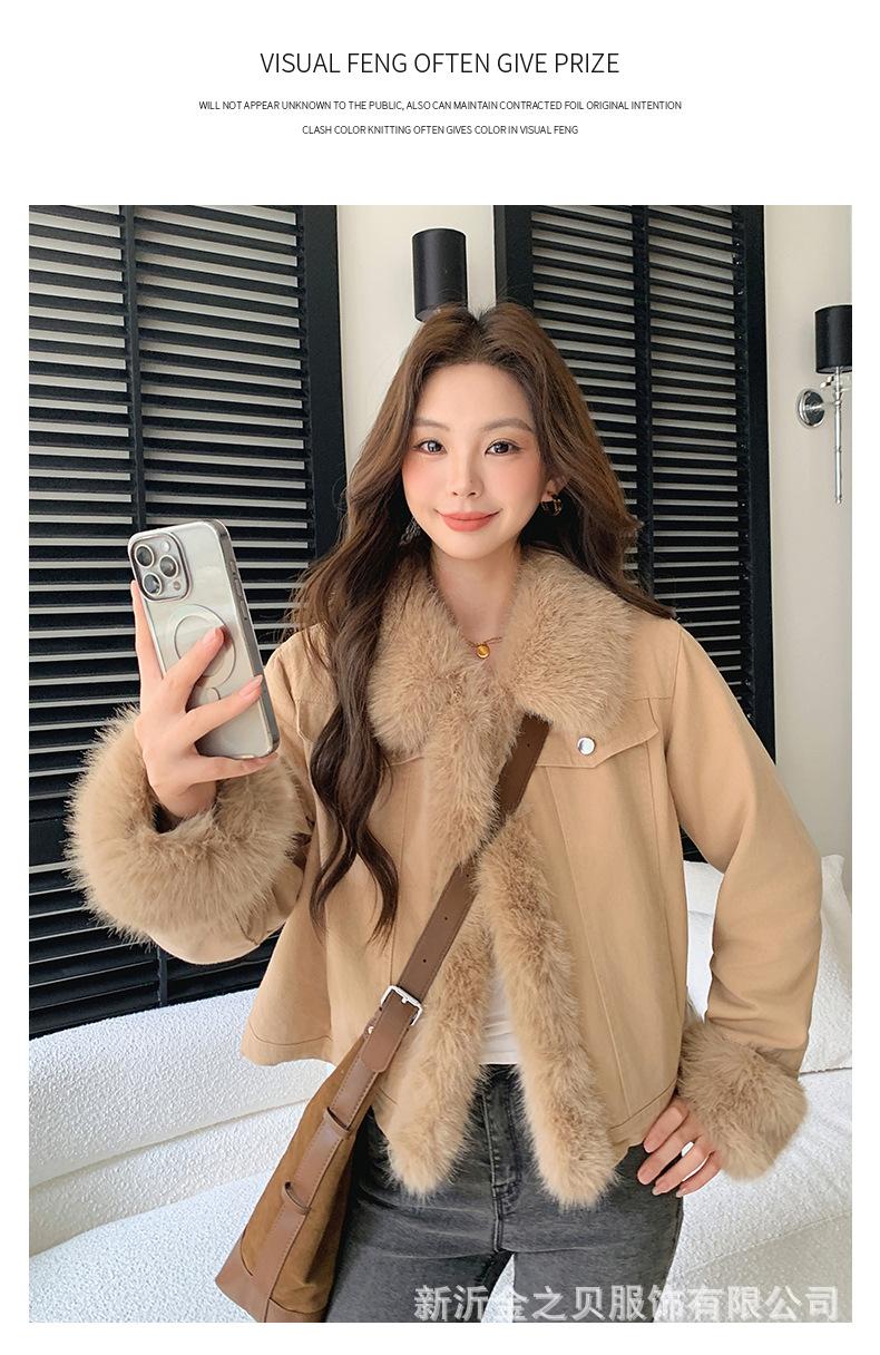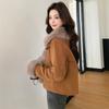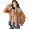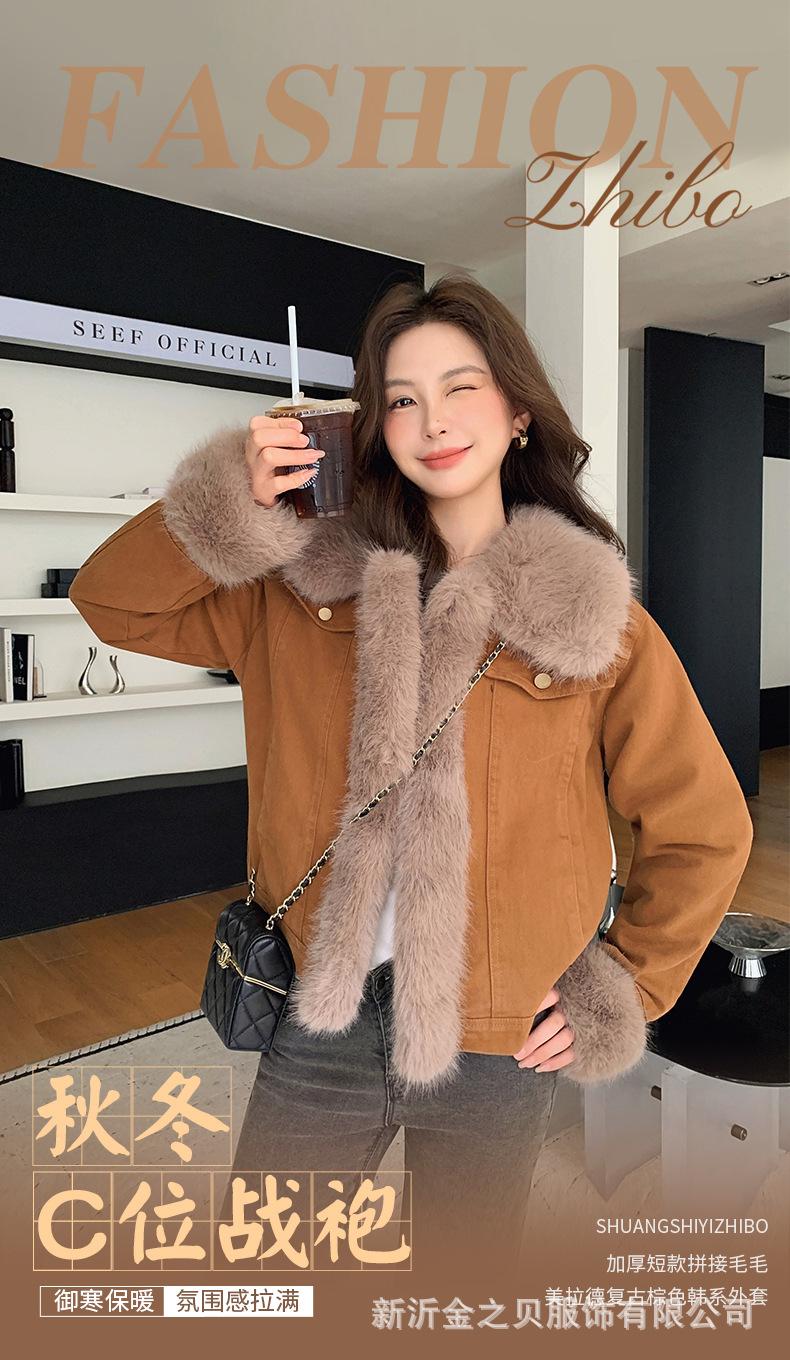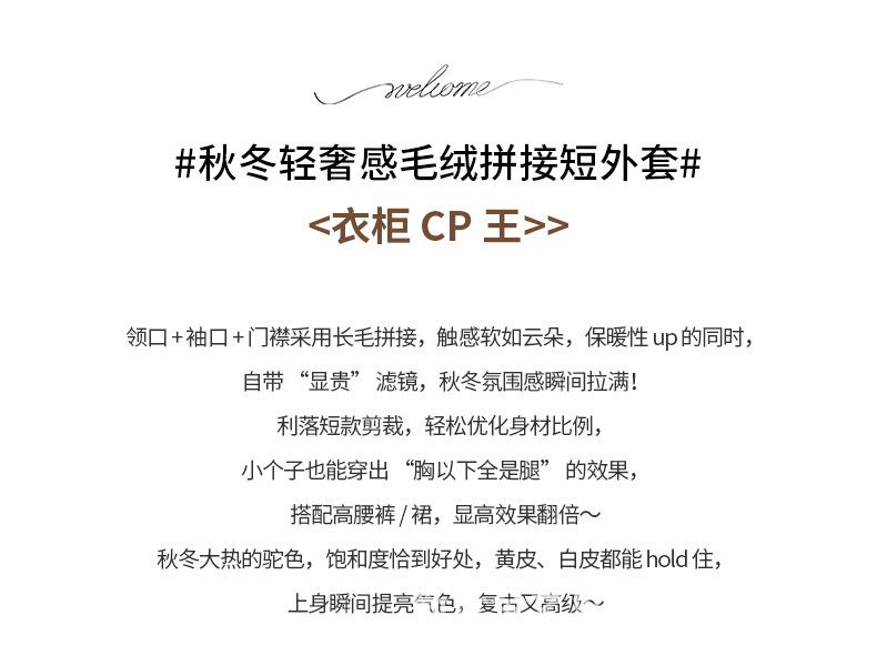 Abrigo de patchwork de felpa de lujo ligero de otoño e invierno, estilo celebridad, piel, moda petite, cálido cuello de piel, corto, ropa de mujer al por mayor
