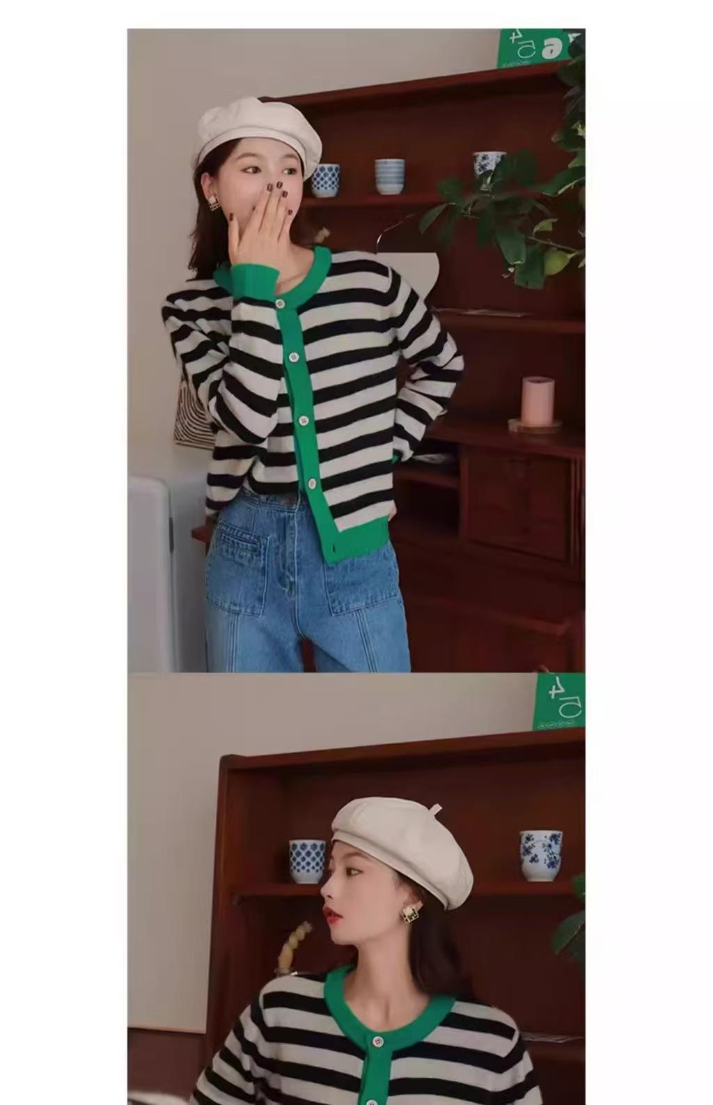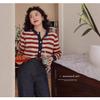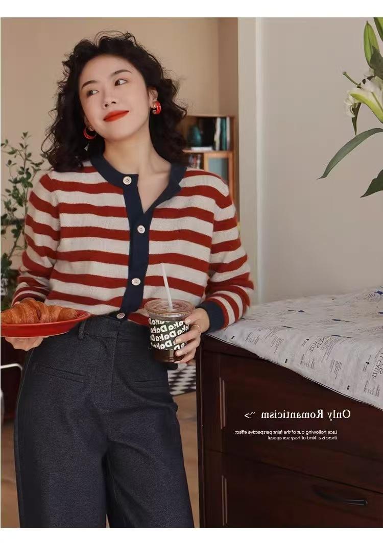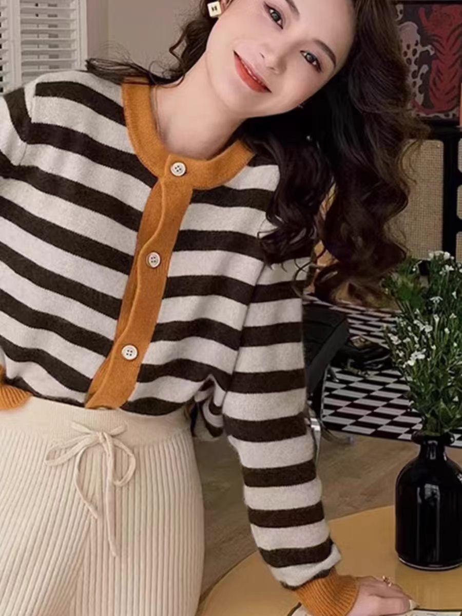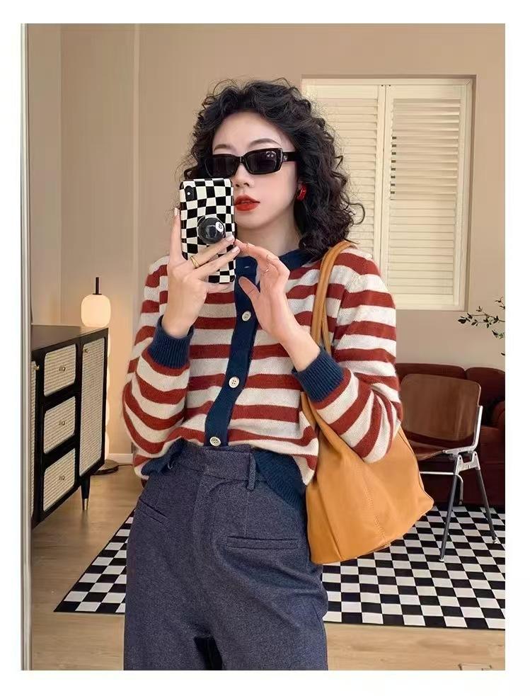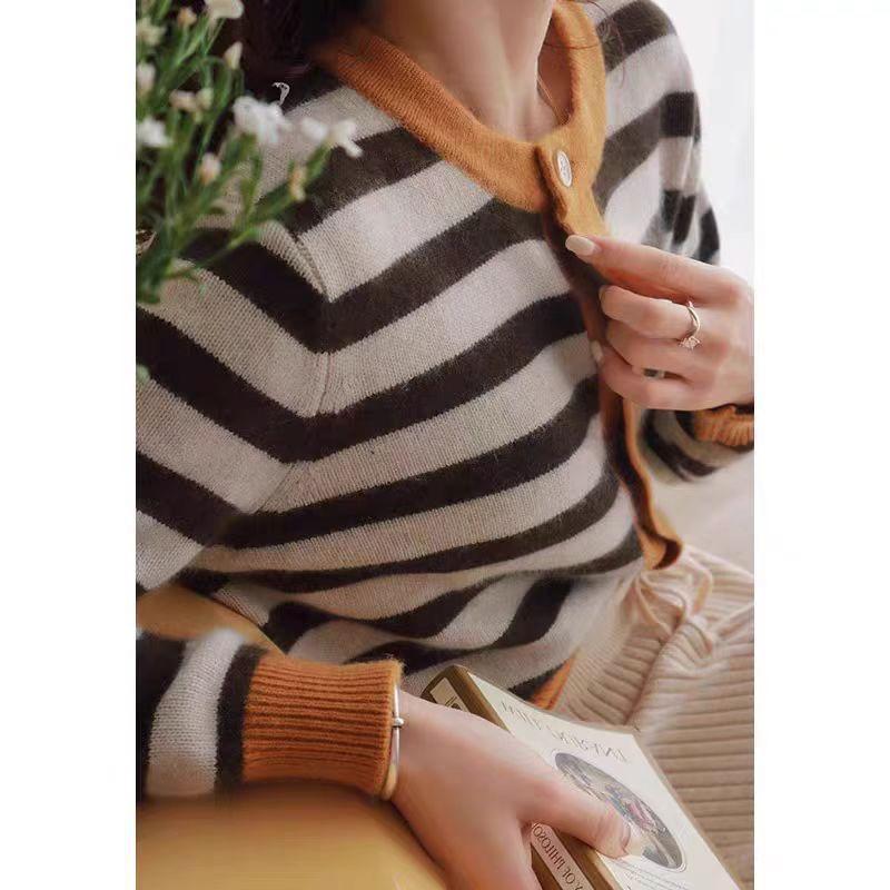 Chaqueta Cárdigan de Lana Pura para Mujer Cuello Redondo Manga Larga Ropa Exterior Otoño e Invierno Nuevo Diseño Francés de Bloques de Color a Rayas Camisa Pequeña