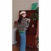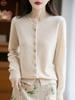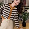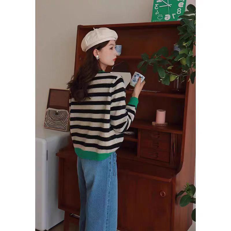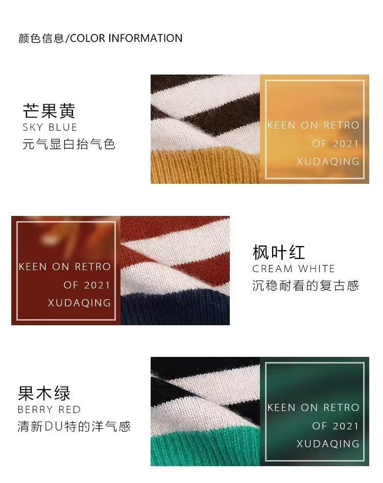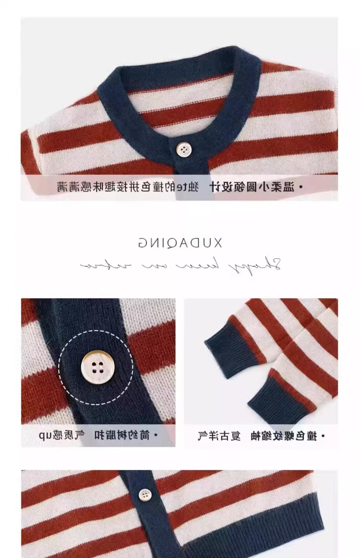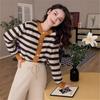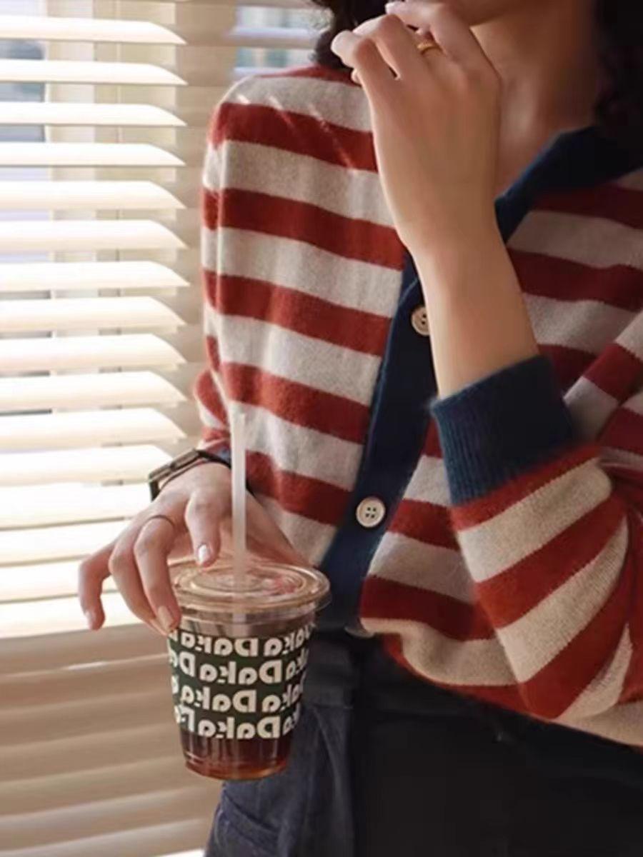 Chaqueta Cárdigan de Lana Pura para Mujer Cuello Redondo Manga Larga Ropa Exterior Otoño e Invierno Nuevo Diseño Francés de Bloques de Color a Rayas Camisa Pequeña