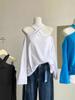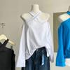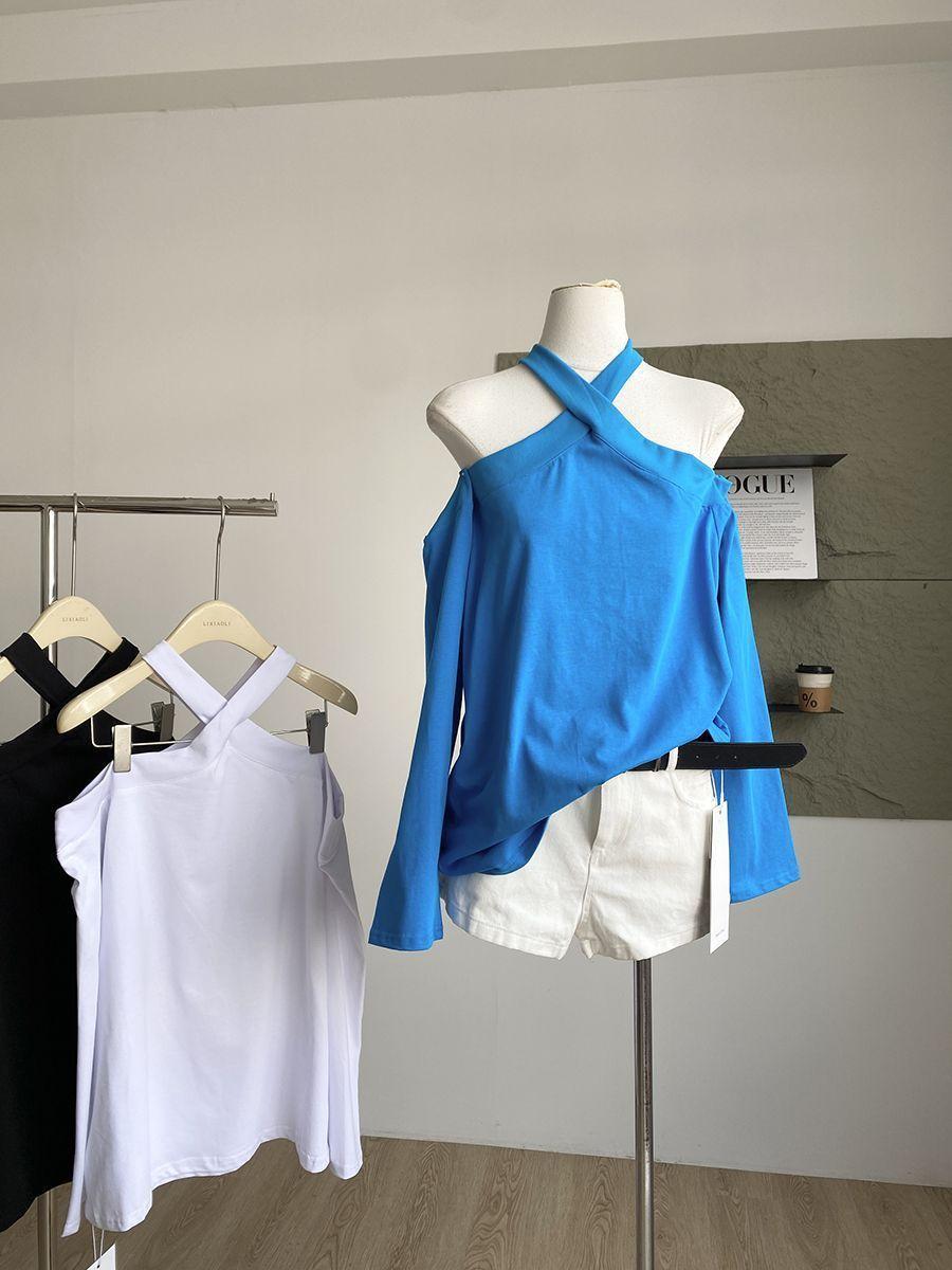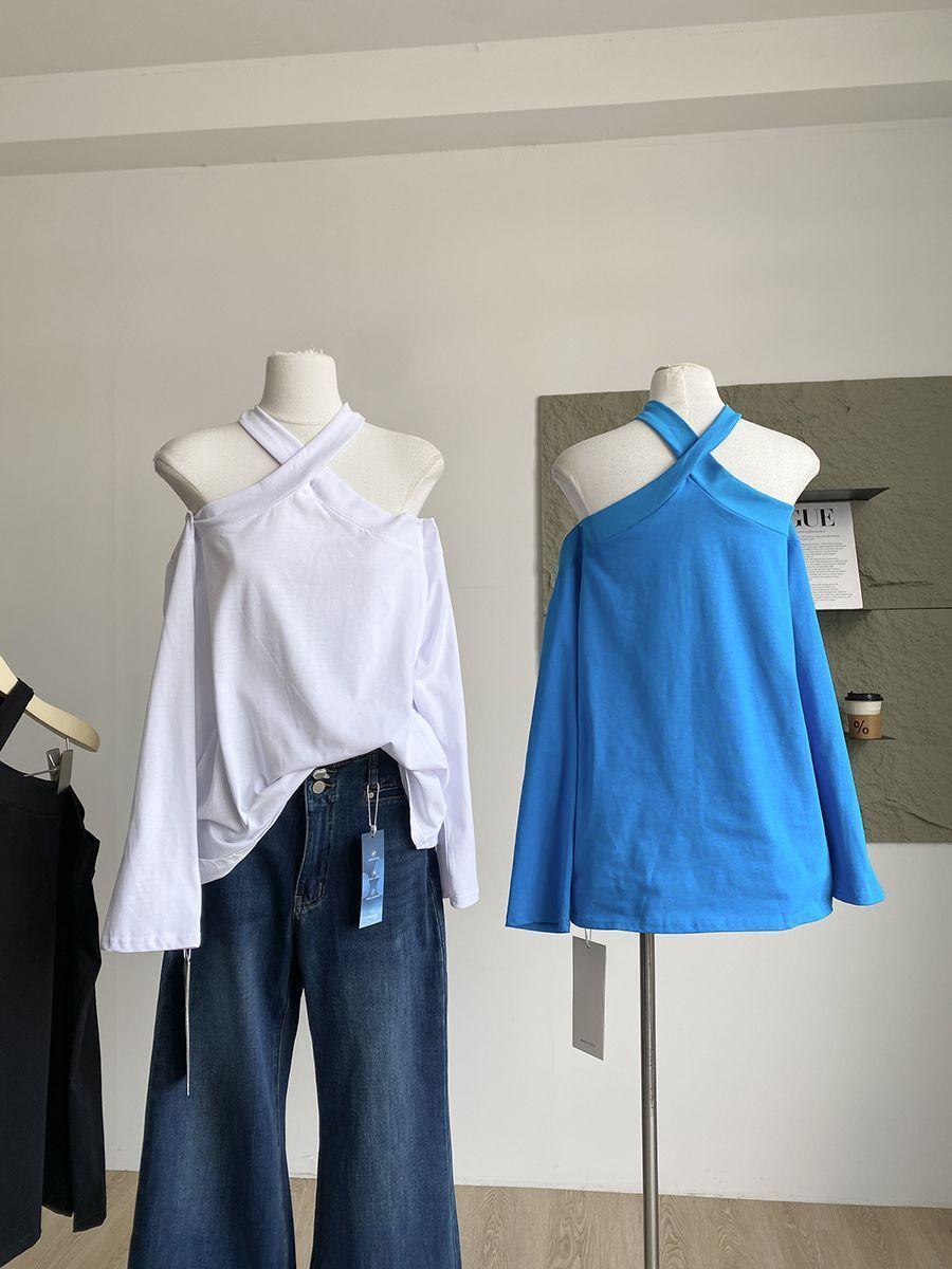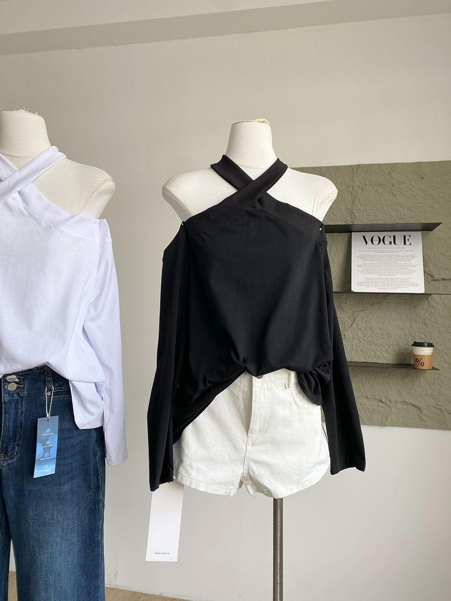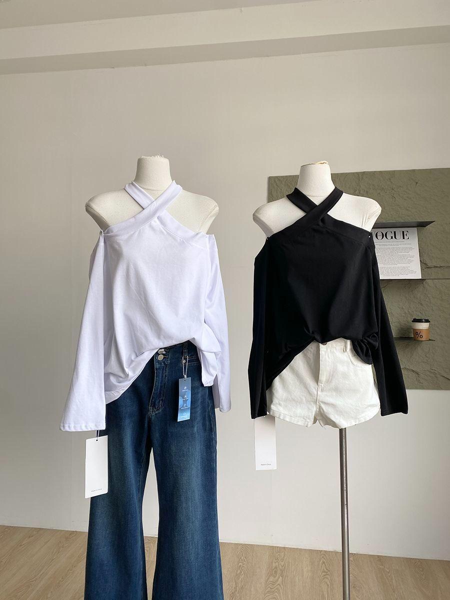 Otoño 2025 Nuevo Diseño de Moda Coreana Halter Hombro Descubierto Manga Larga Camiseta para Mujer Nicho Holgada Casual Top Tendencia