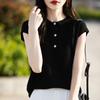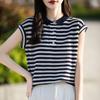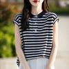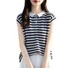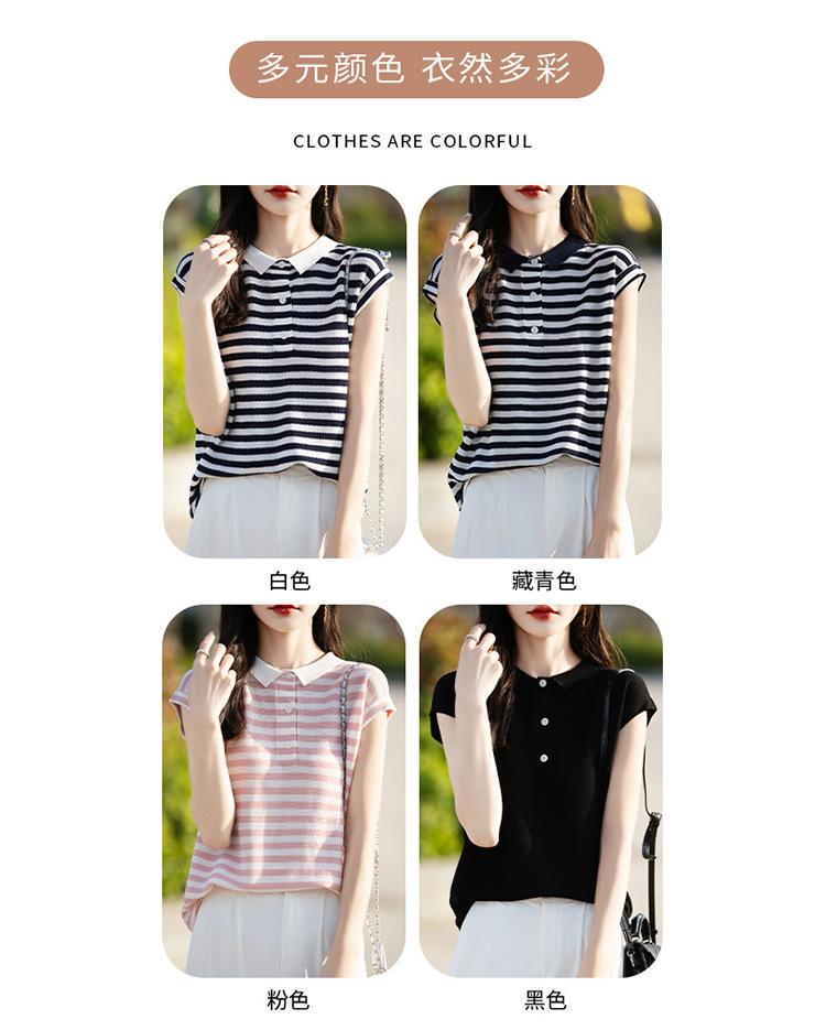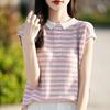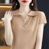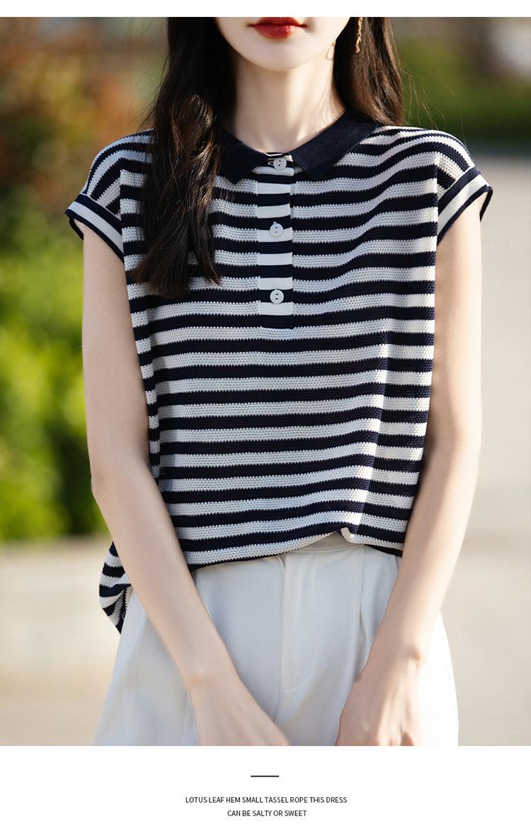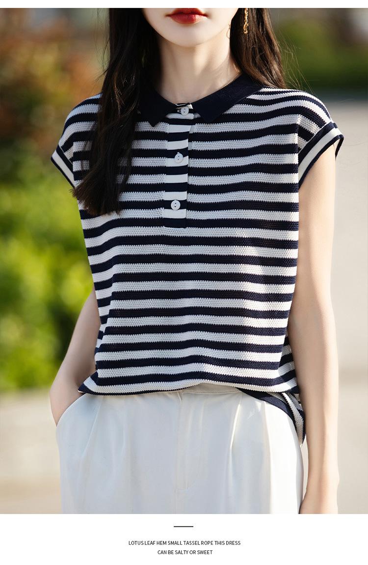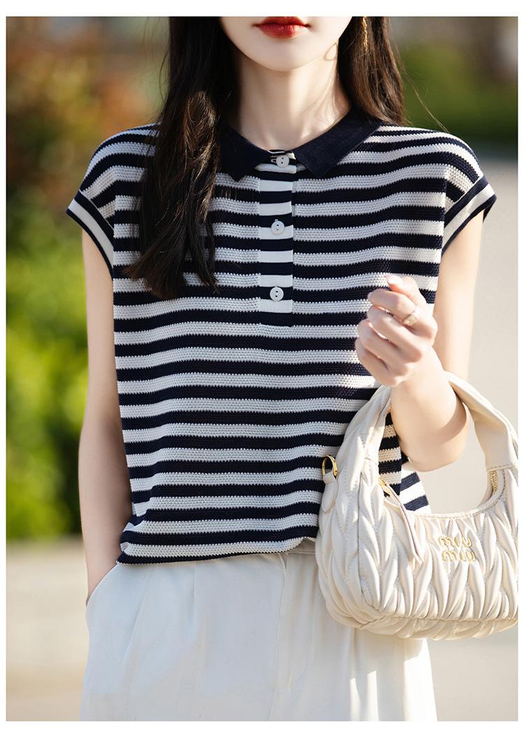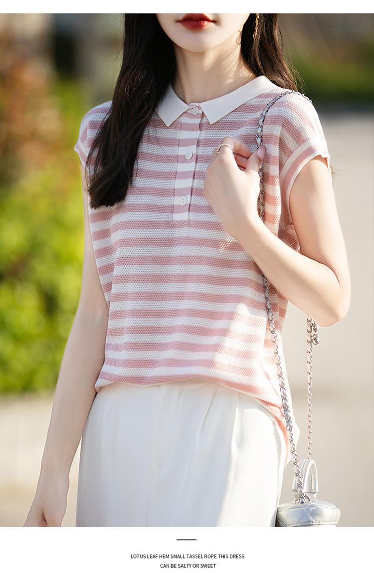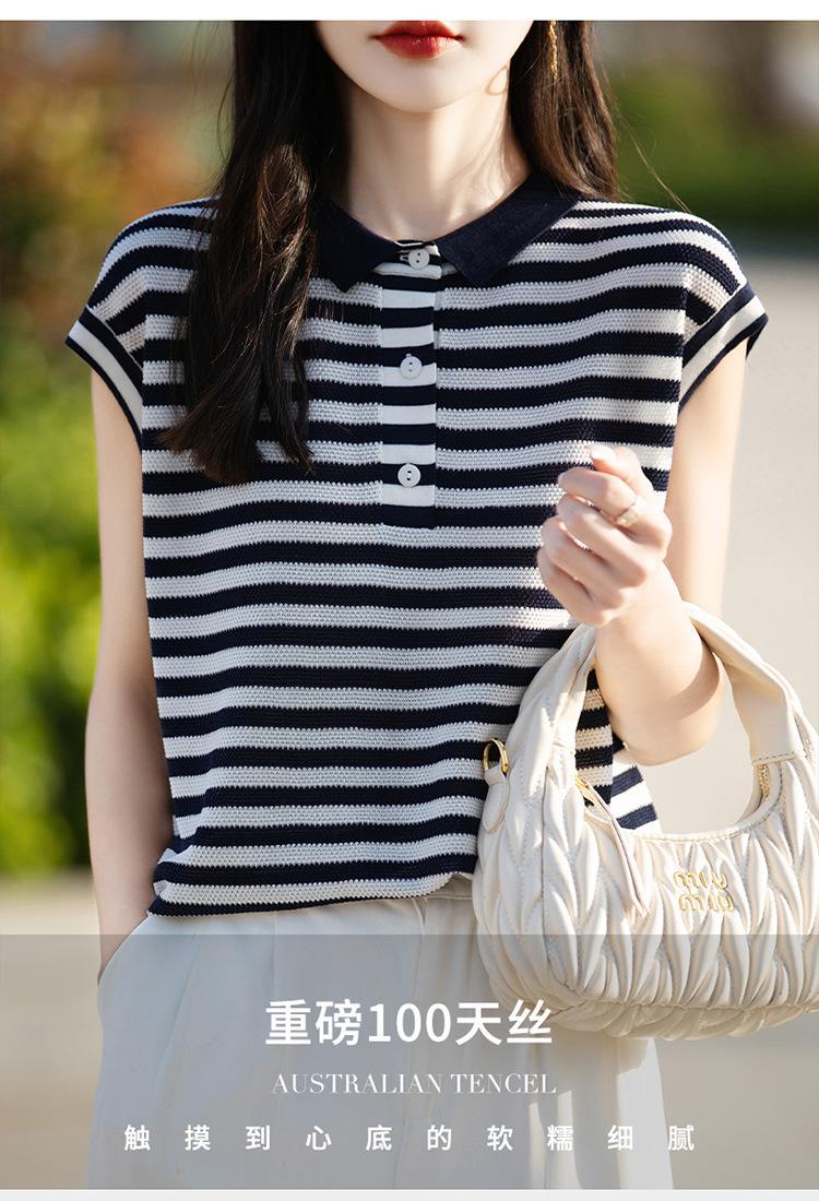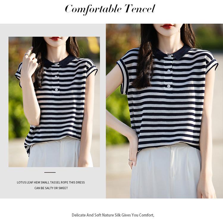 Suéter de Verano 2024 Nuevo Cuello Polo Tencel Color Rayado Camiseta de Manga Corta para Mujer Holgada Combinable Top