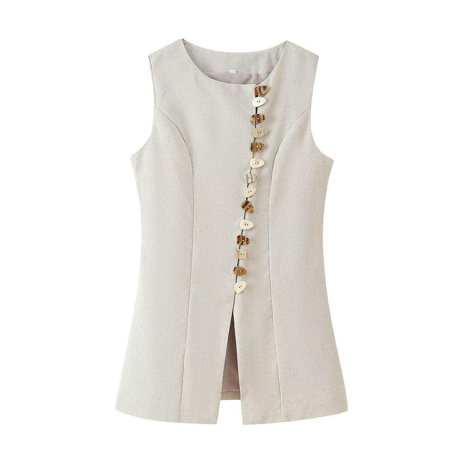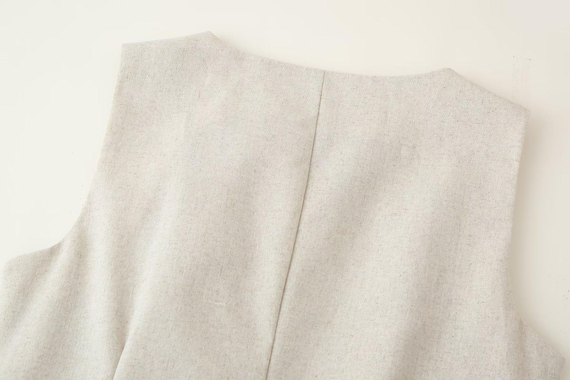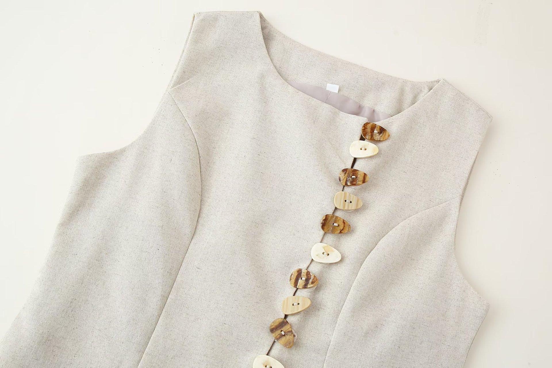 Conjunto de Top Chaleco de Cuello Redondo con Doble Botonadura Estilo Europeo y Americano Transfronterizo para Comercio Exterior al Mayoreo + Falda de Cintura Alta Decorada con Bolsillos