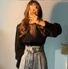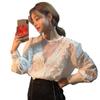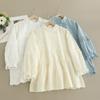 Camisa Top Coreana Retro Francesa de Cuello Redondo con Parches de Encaje Crochet Calado Transparente Holgada Manga Abullonada