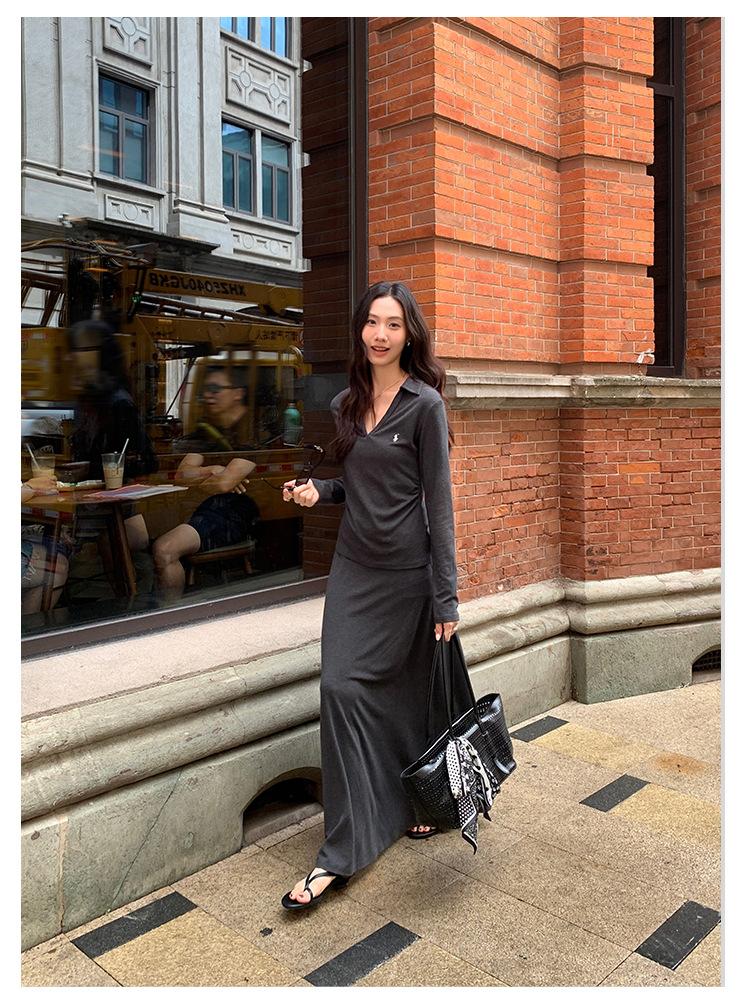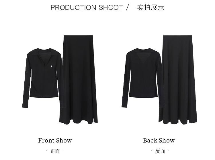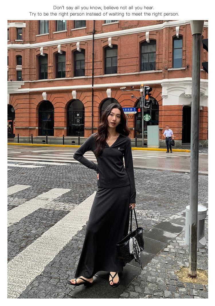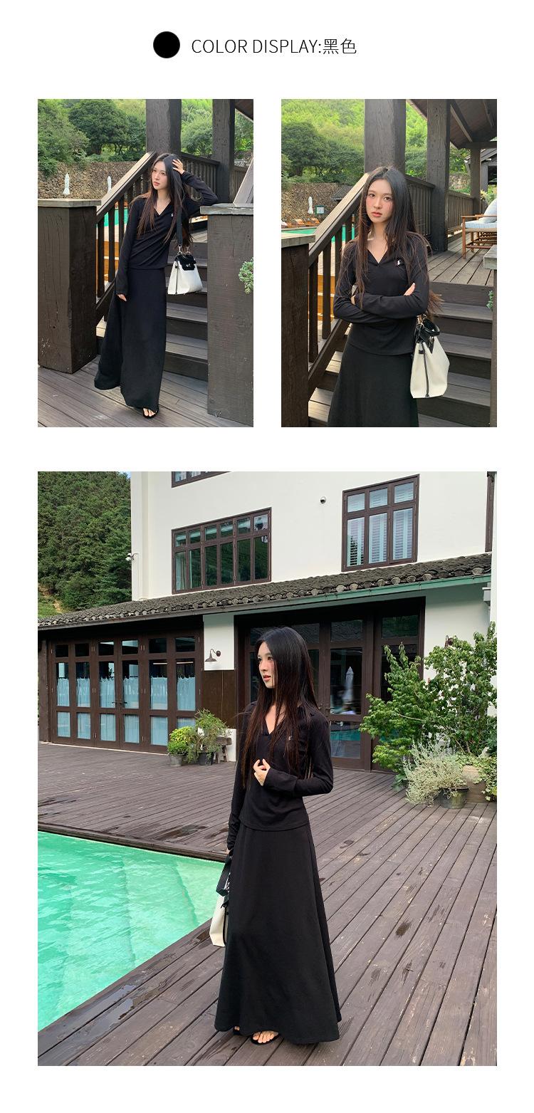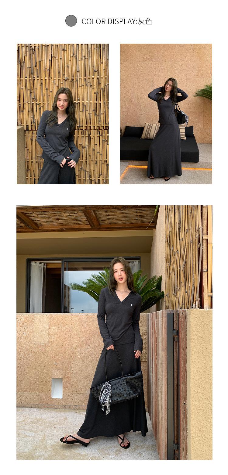 Venta de Liquidación Trece Filas Sin Devoluciones ni Cambios Top de Punto de Cuello en V con Logo Pequeño Bordado en Solapa + Set de Falda Larga Fluida Adelgazante 15269