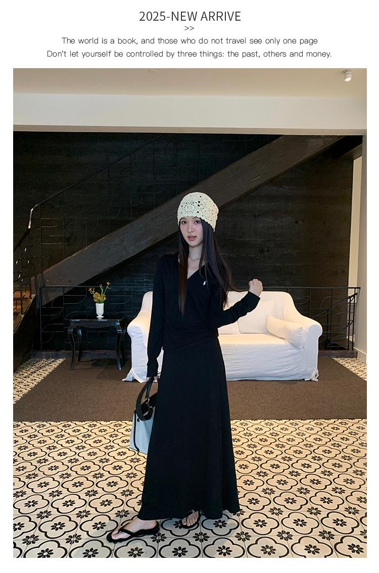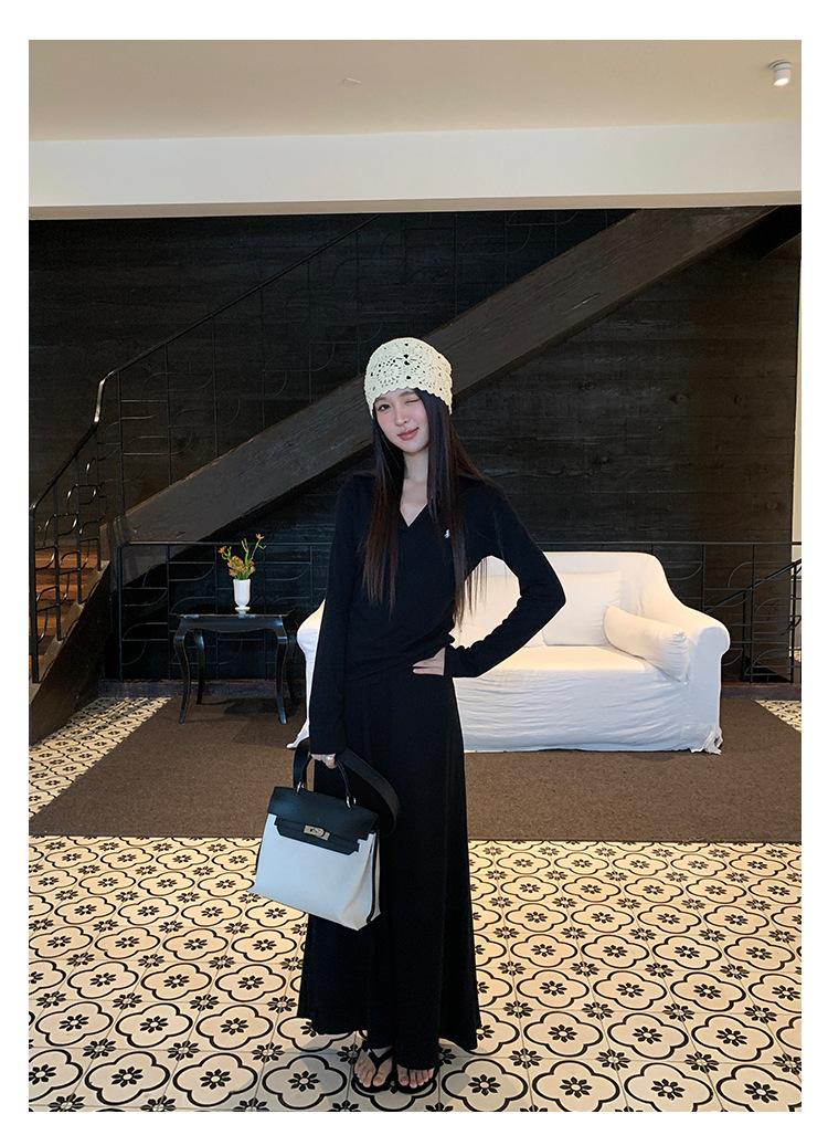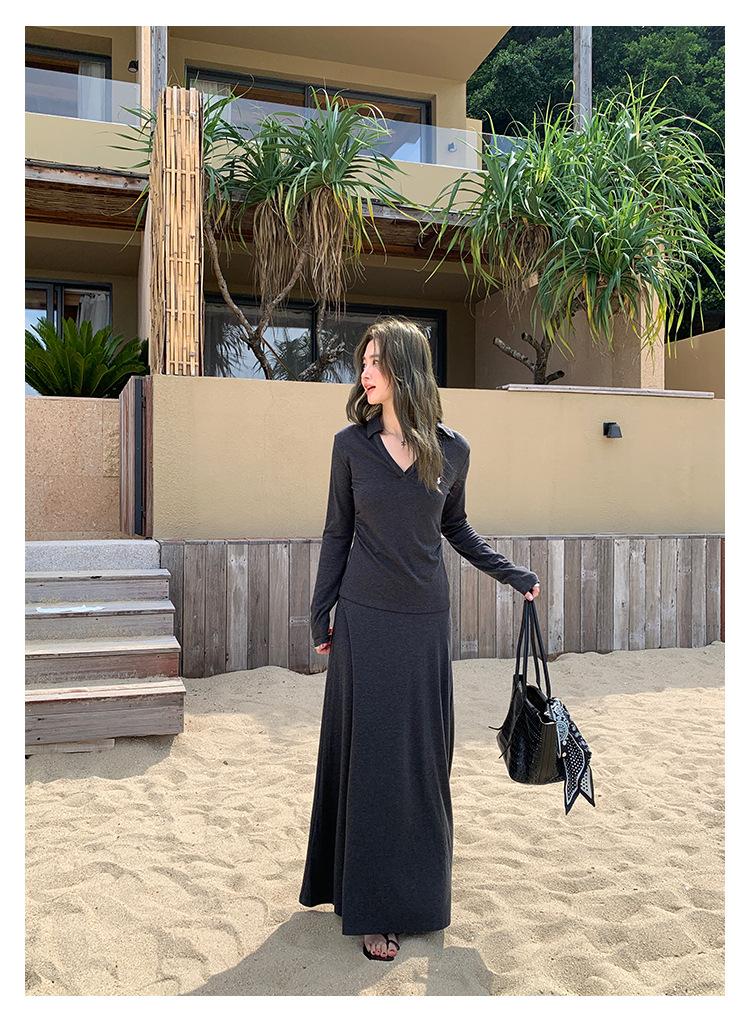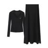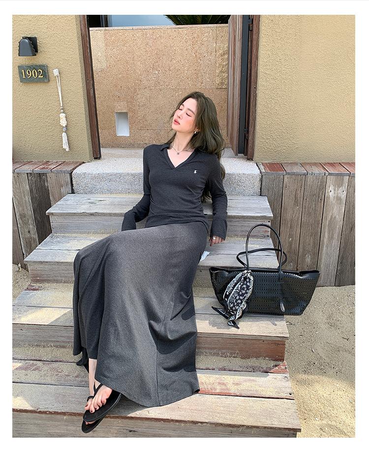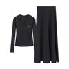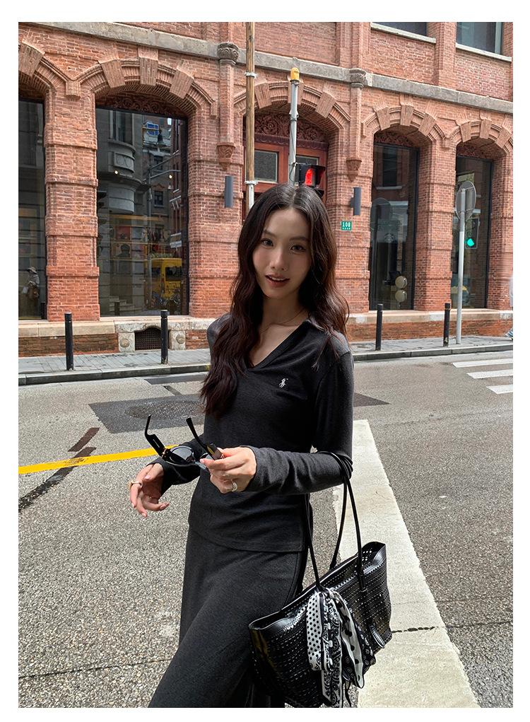 Venta de Liquidación Trece Filas Sin Devoluciones ni Cambios Top de Punto de Cuello en V con Logo Pequeño Bordado en Solapa + Set de Falda Larga Fluida Adelgazante 15269
