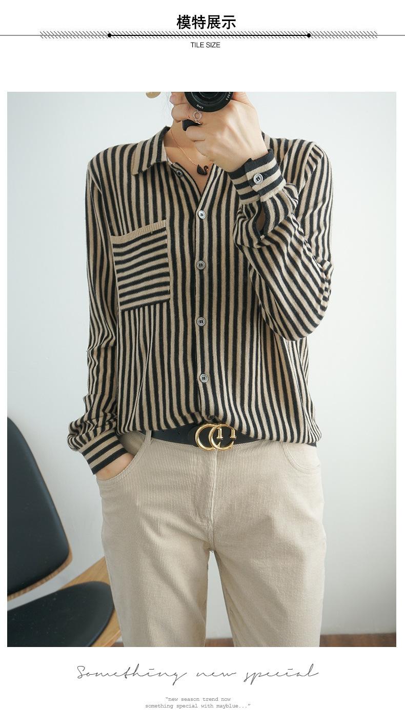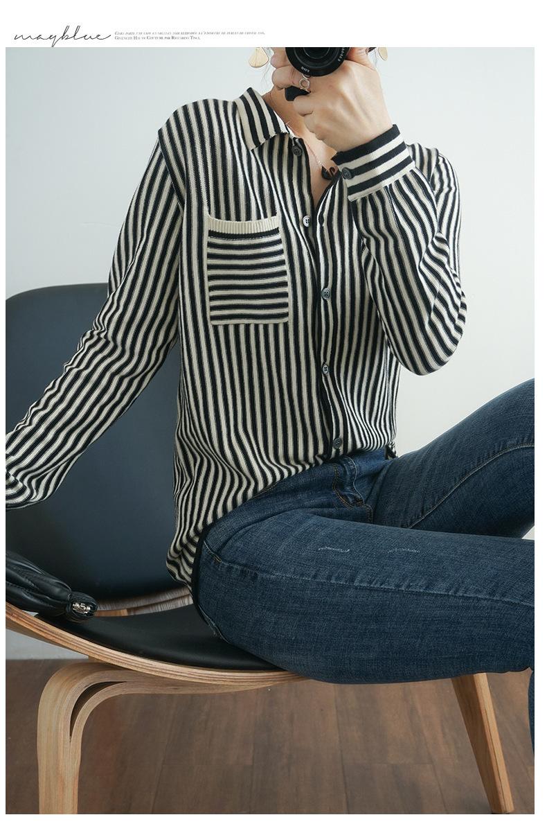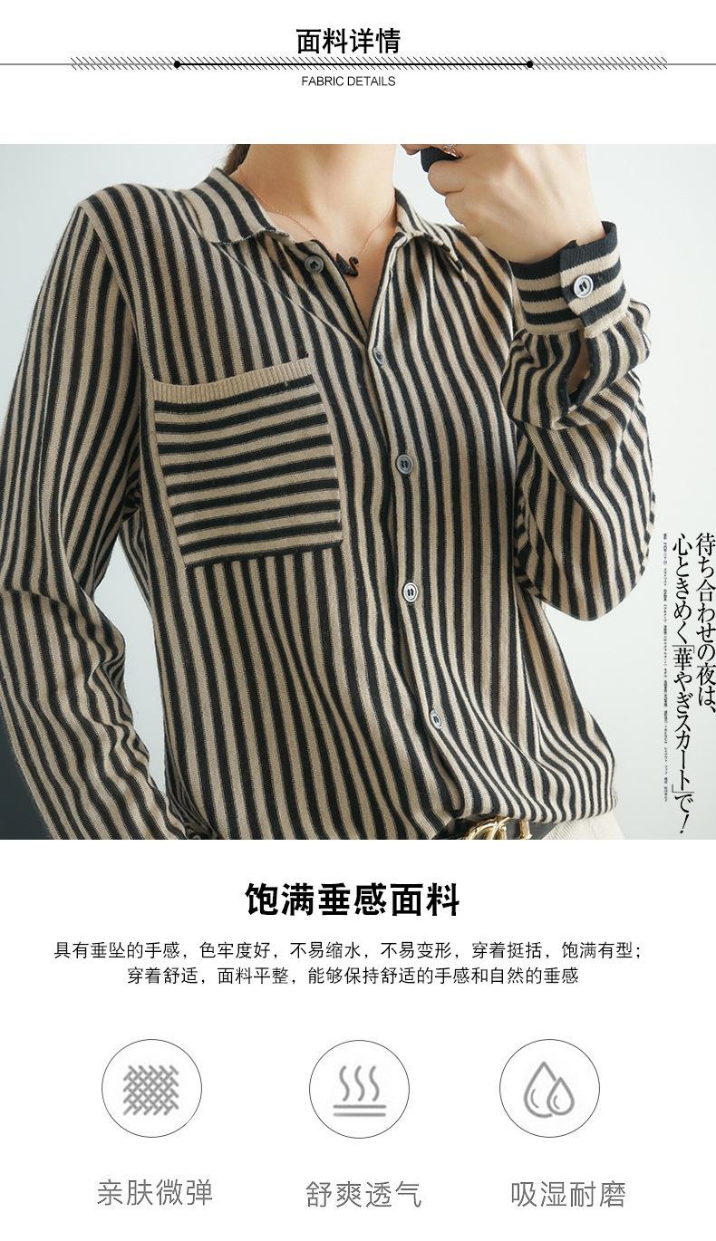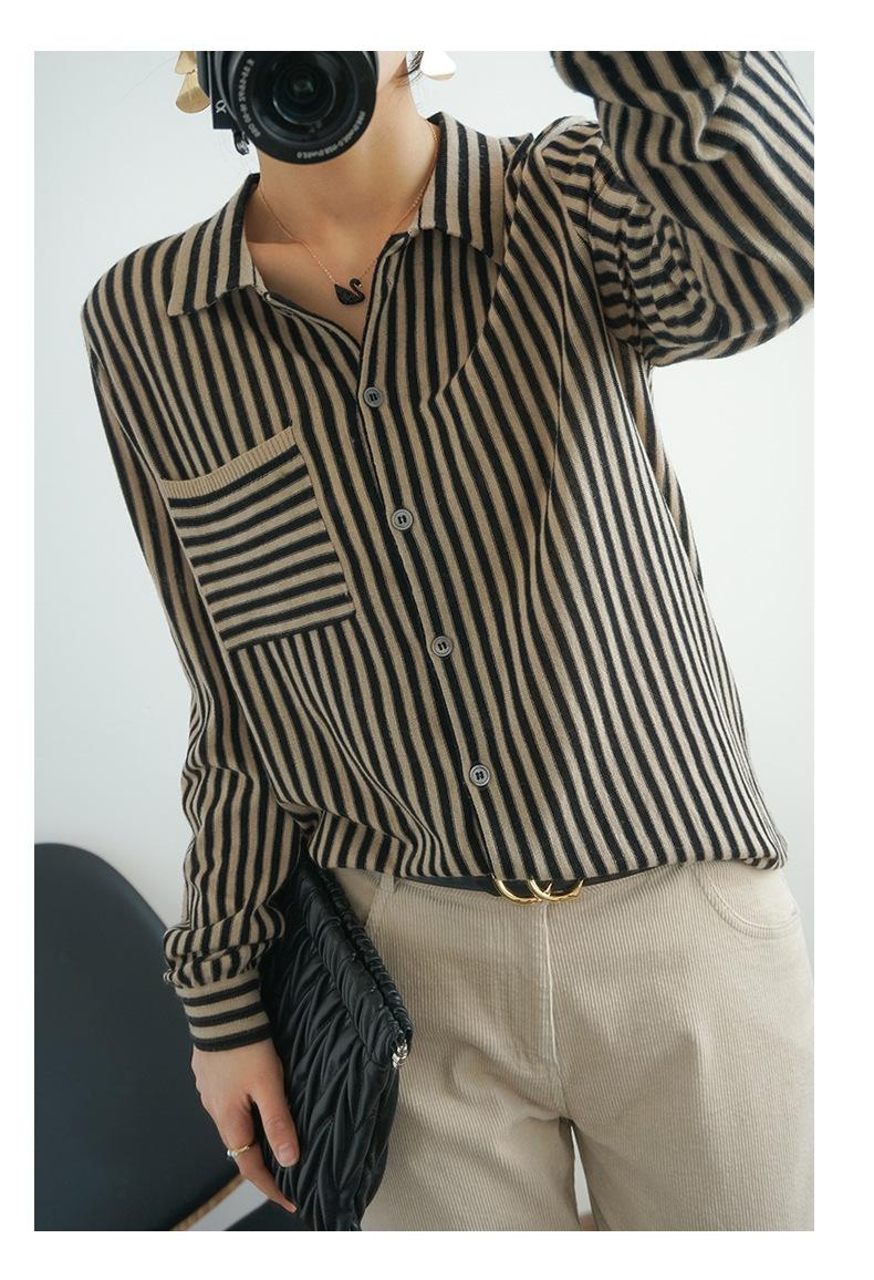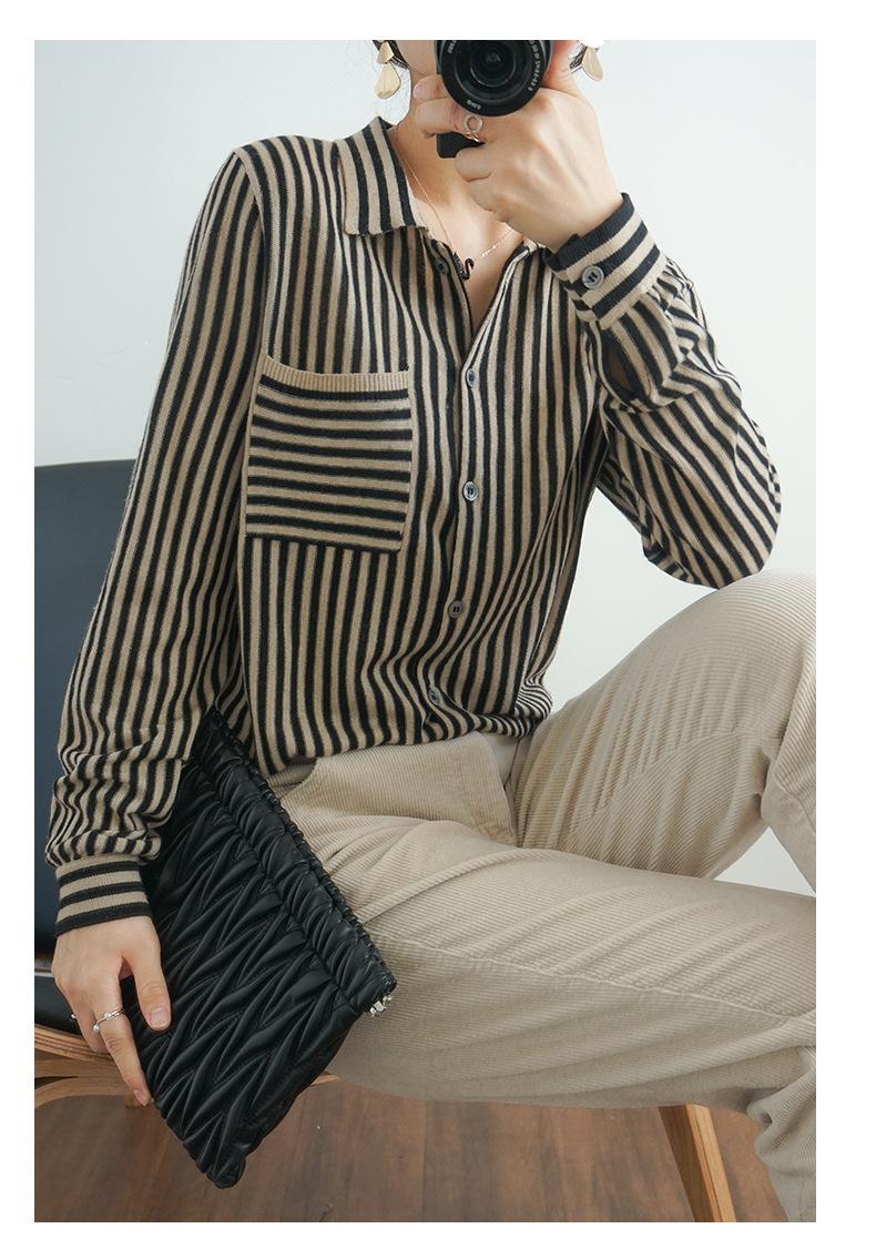 Cárdigan de punto nuevo otoño/invierno 2025 transfronterizo para mujer, camisa de rayas verticales, suéter holgado con cuello polo, solapa, ropa exterior