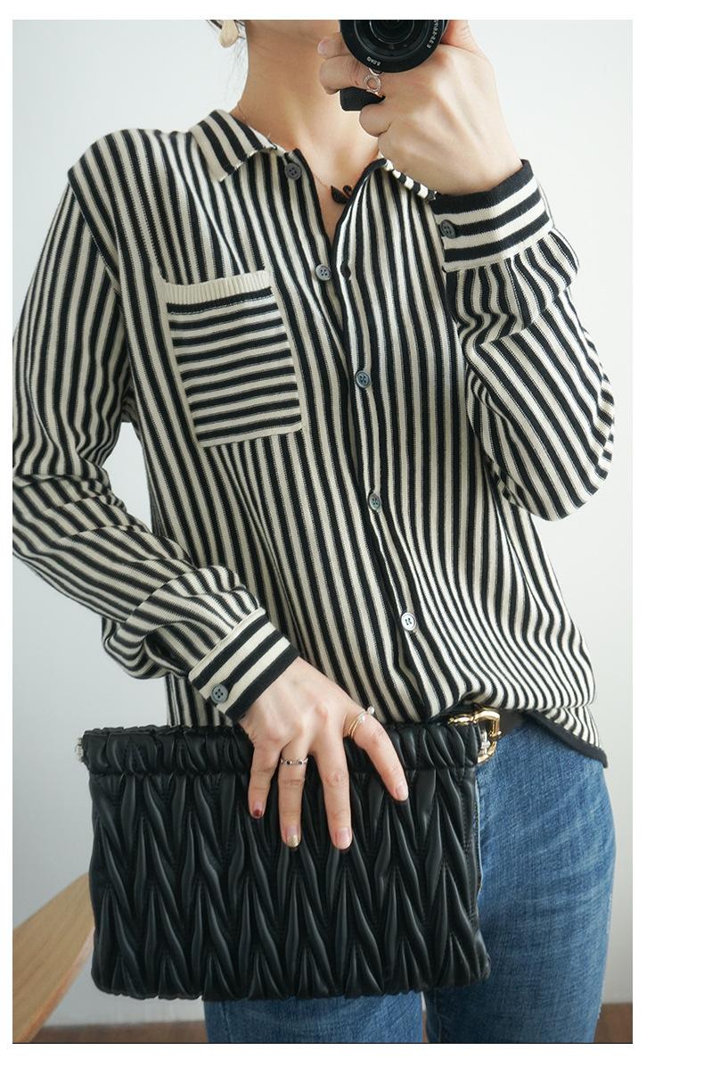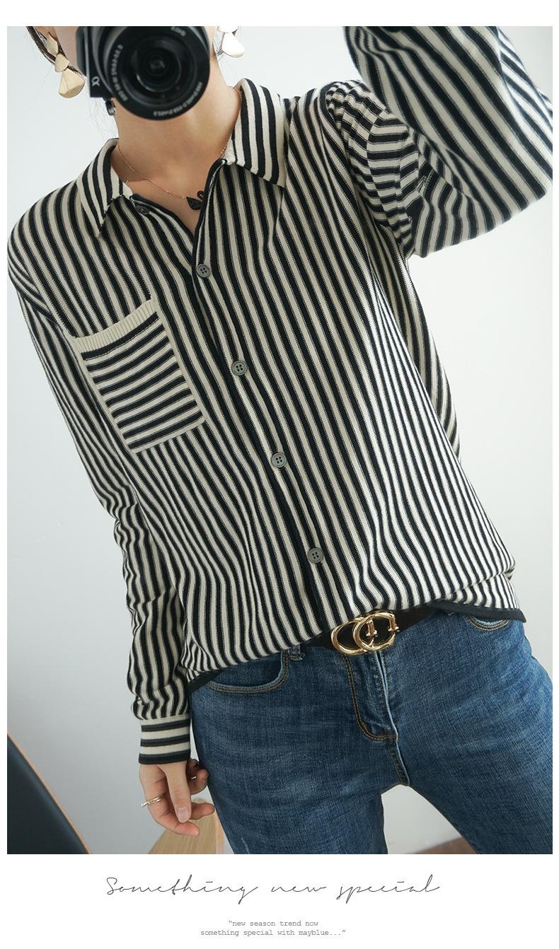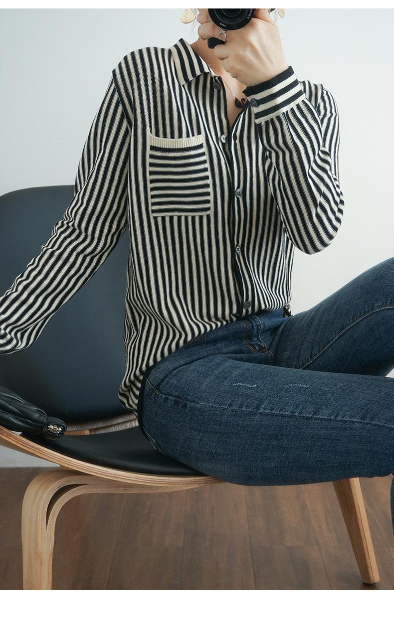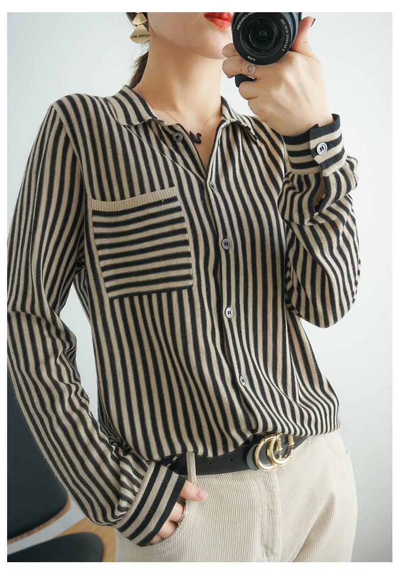 Cárdigan de punto nuevo otoño/invierno 2025 transfronterizo para mujer, camisa de rayas verticales, suéter holgado con cuello polo, solapa, ropa exterior