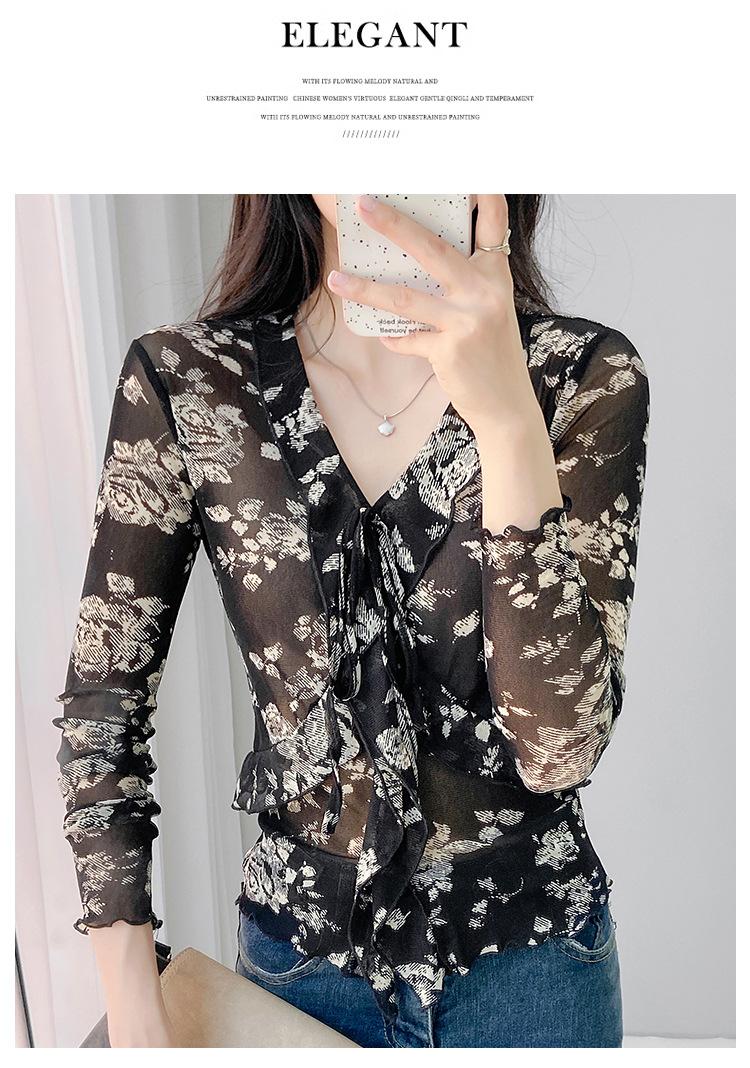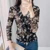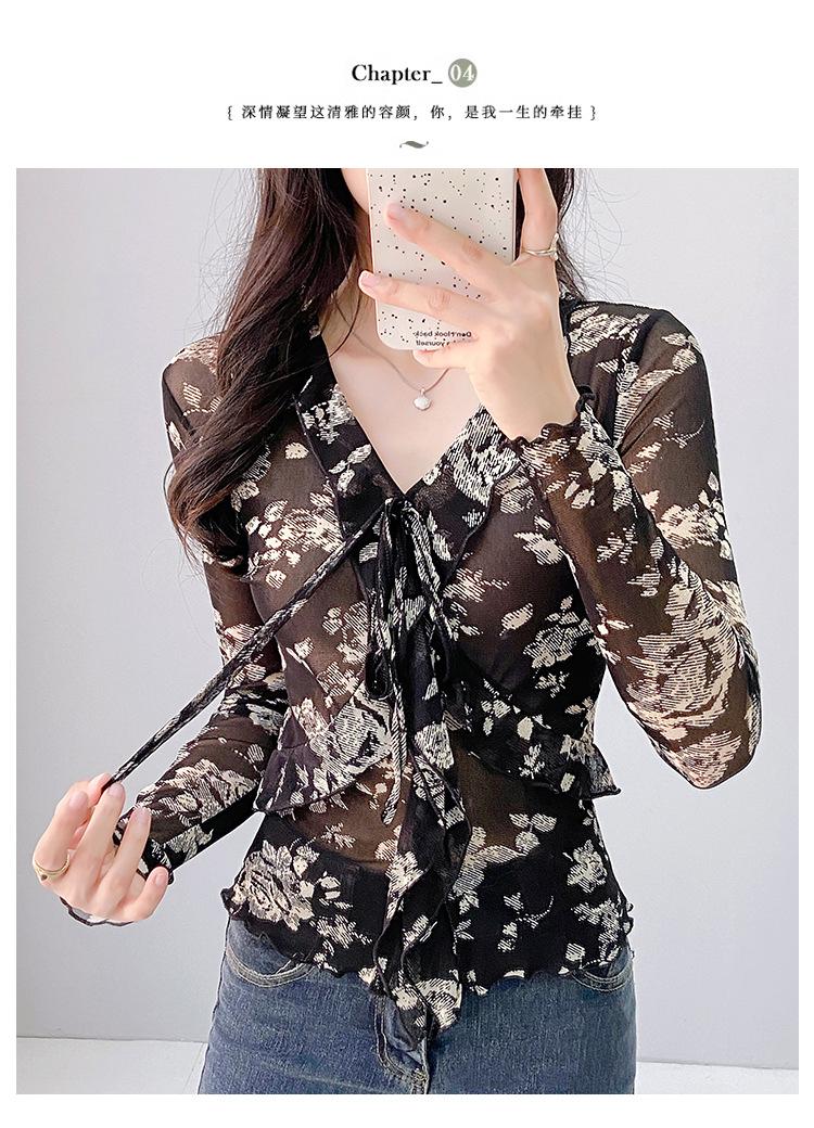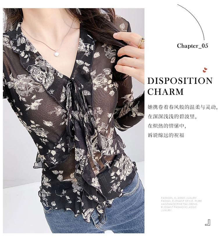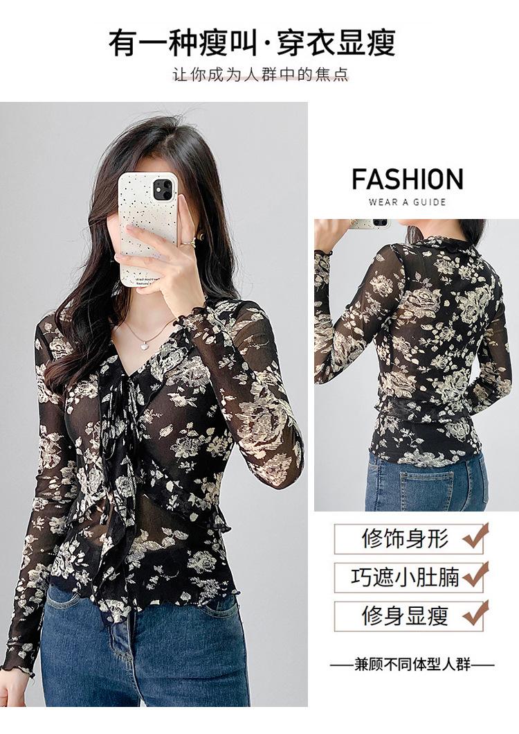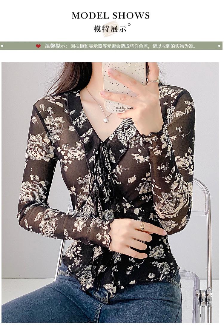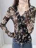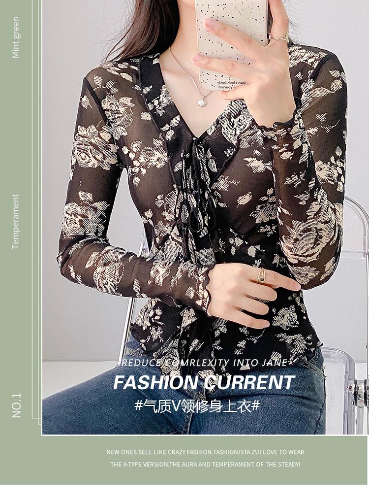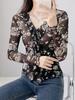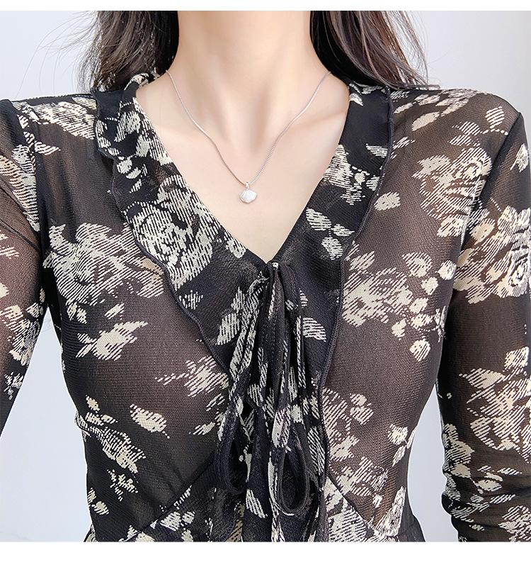 Camiseta Francesa de Cuello en V con Volantes para Mujer Manga Larga Ropa Interior Primavera y Otoño Nuevo Temperamento Estampado Top de Malla Adelgazante Camiseta Base