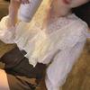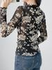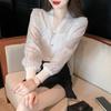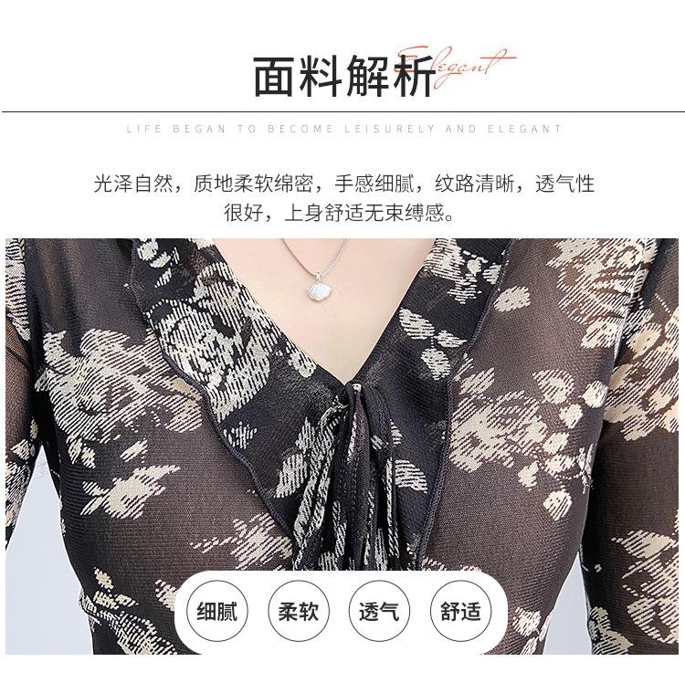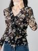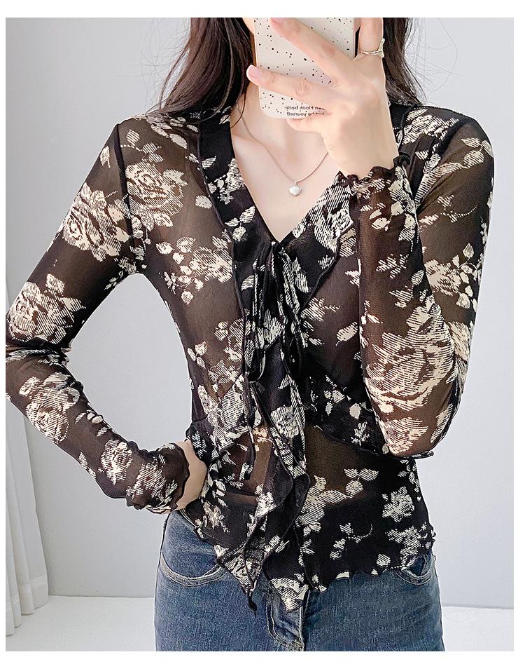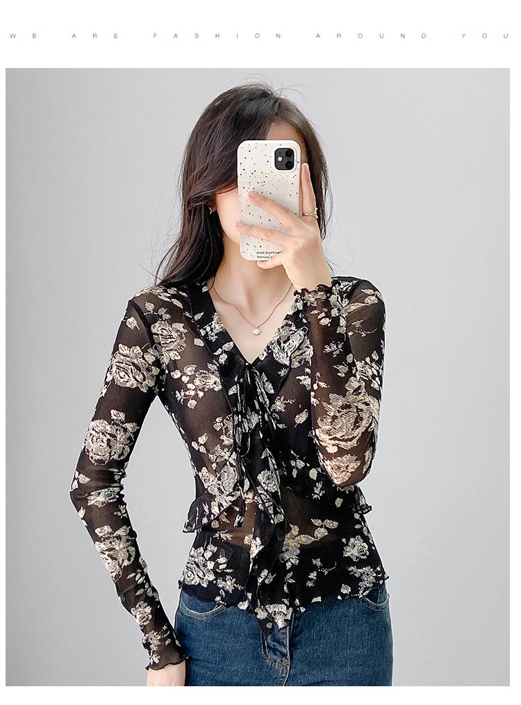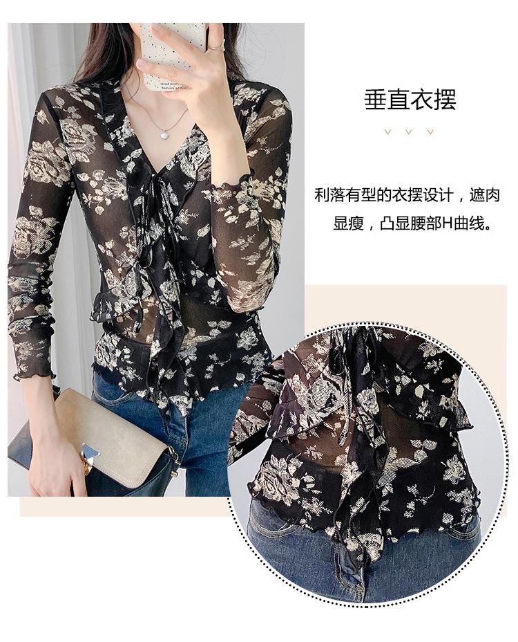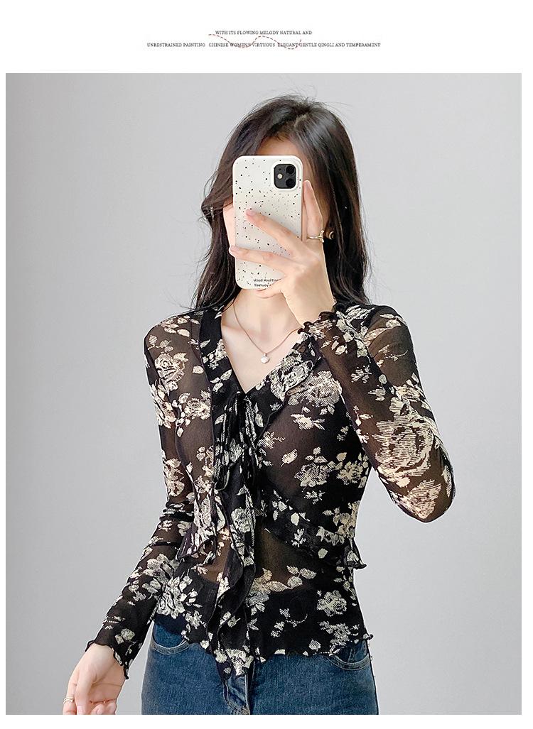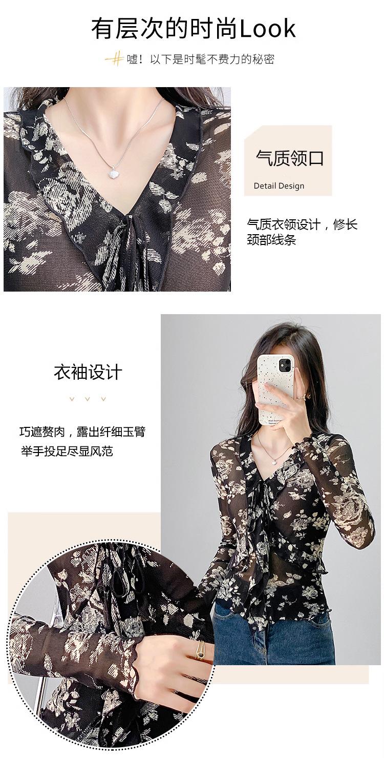 Camiseta Francesa de Cuello en V con Volantes para Mujer Manga Larga Ropa Interior Primavera y Otoño Nuevo Temperamento Estampado Top de Malla Adelgazante Camiseta Base