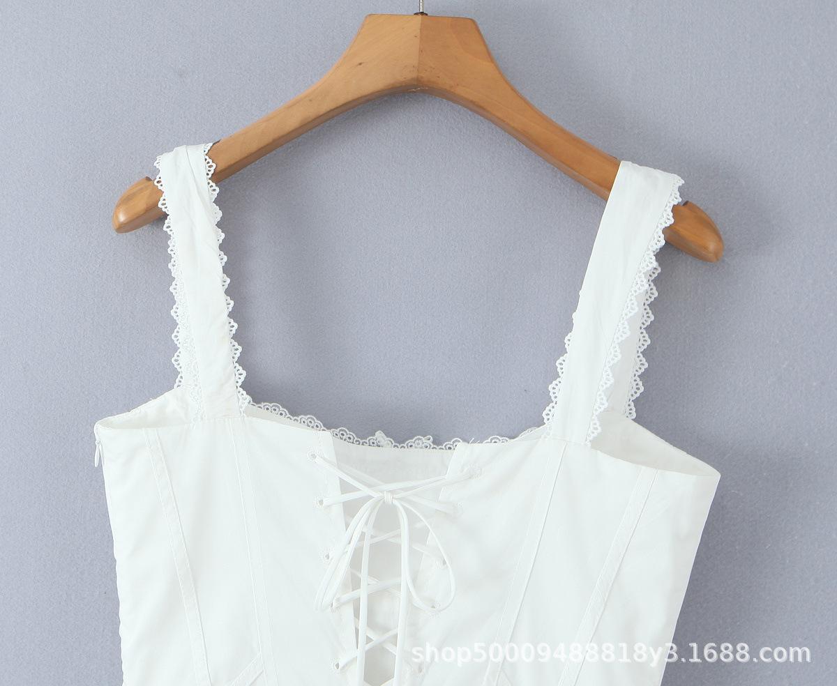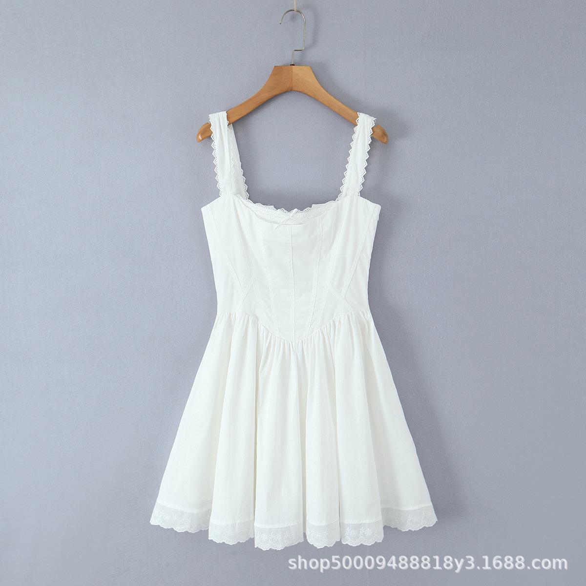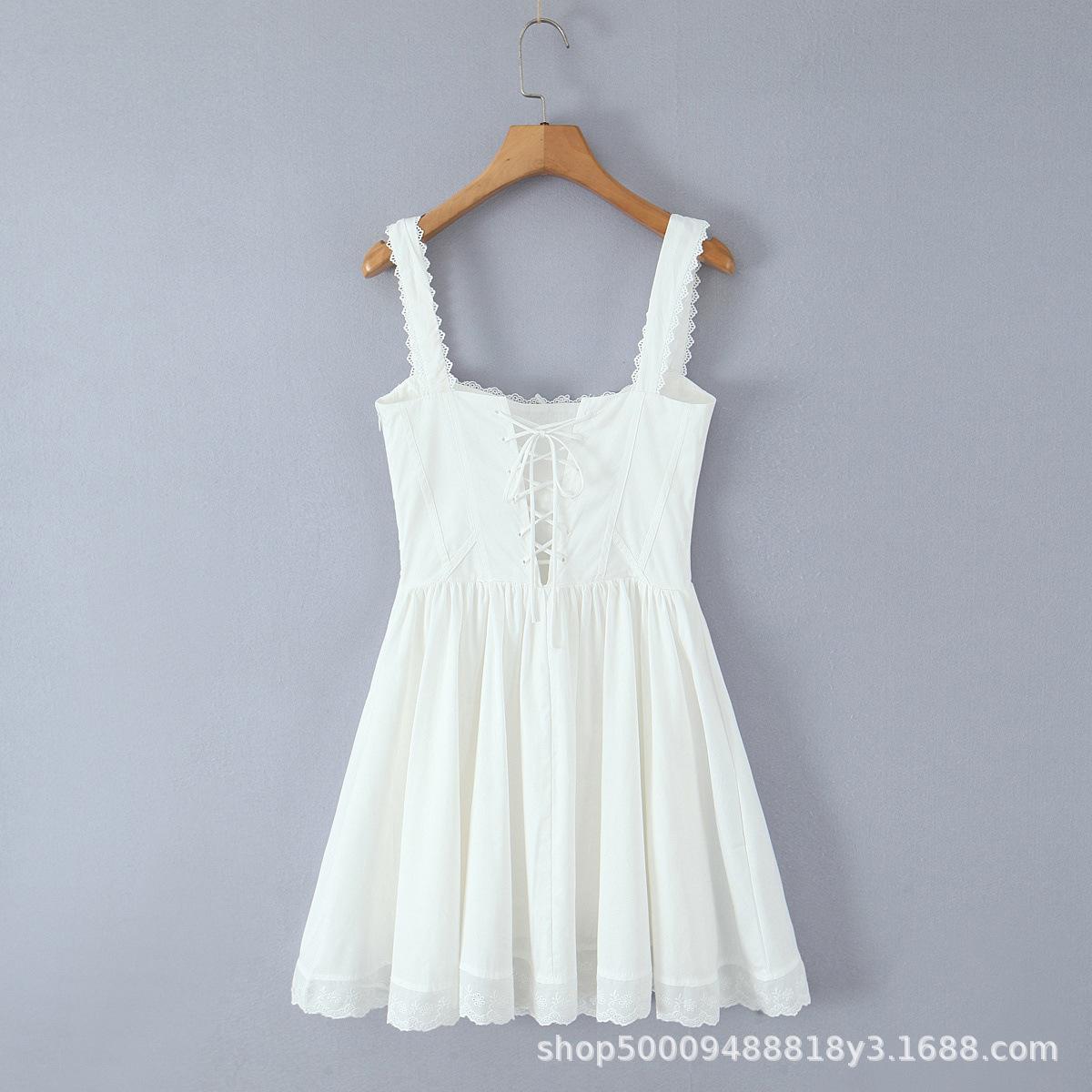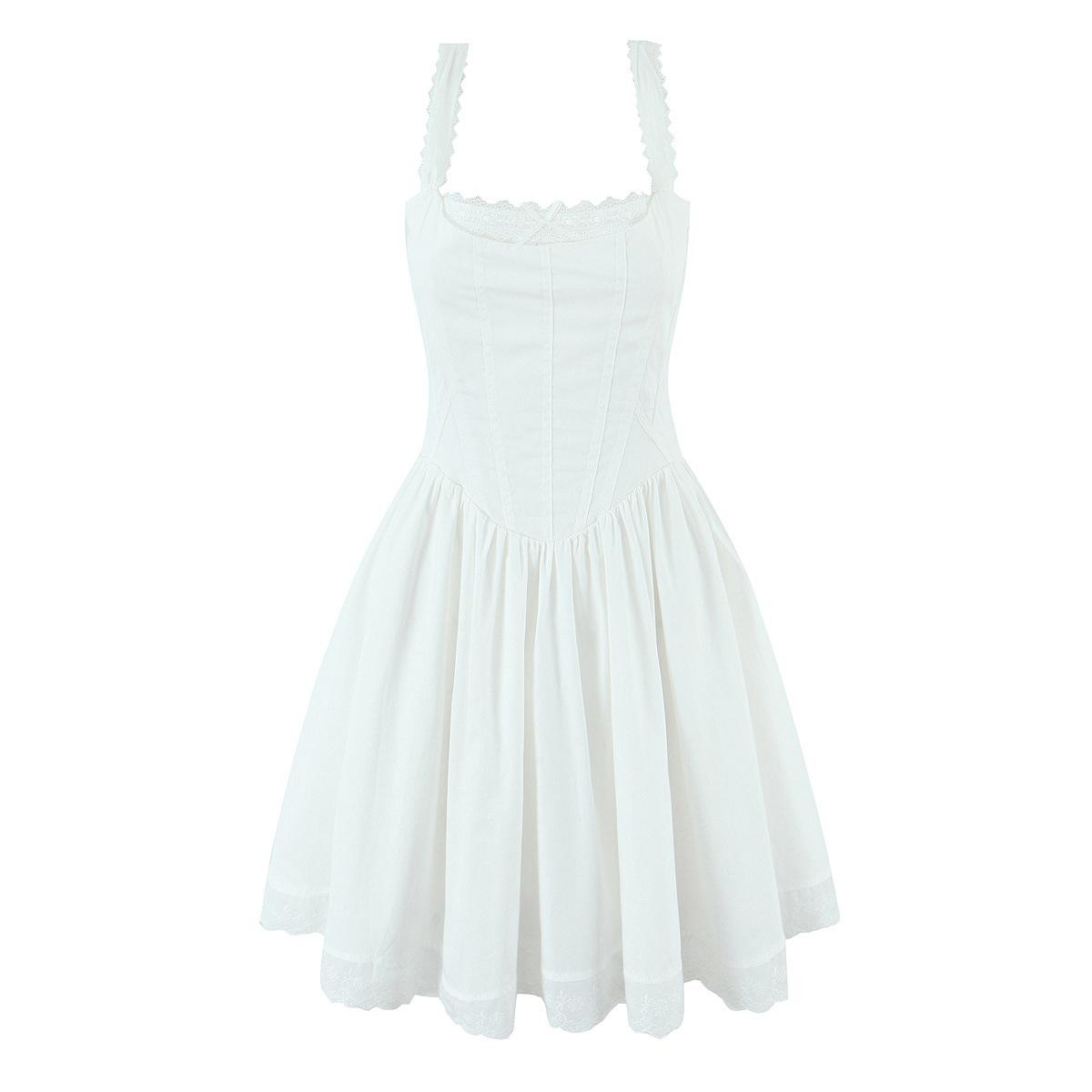 Casa Mismo Estilo Francés Deseo Puro Blanco Sexy Encaje Vestido con Tirantes para Mujer Espalda Descubierta Cintura Falda A-Línea