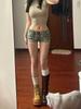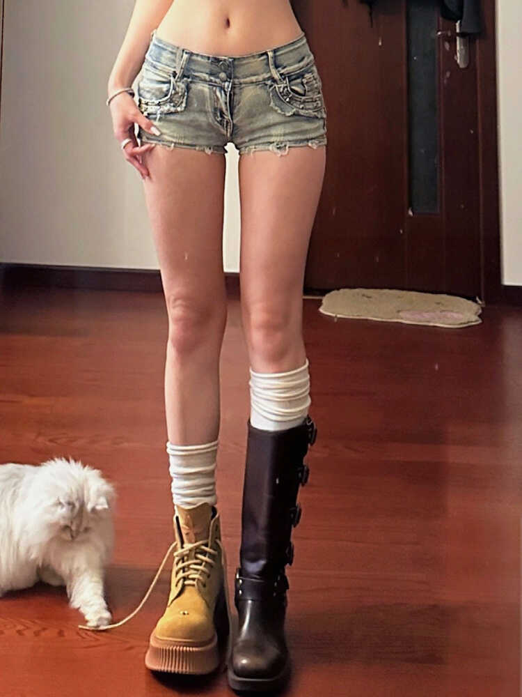 Shorts de Mezclilla de Cintura Baja Estilo Americano para Chica Caliente Liu Ding para Mujer Primavera y Verano Nuevo Ajustado Adelgazante Bolsa Cadera Pierna Ancha Pantalones Calientes de Moda