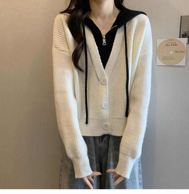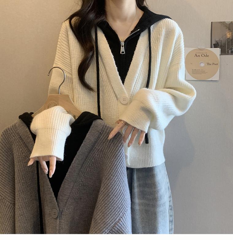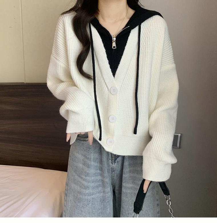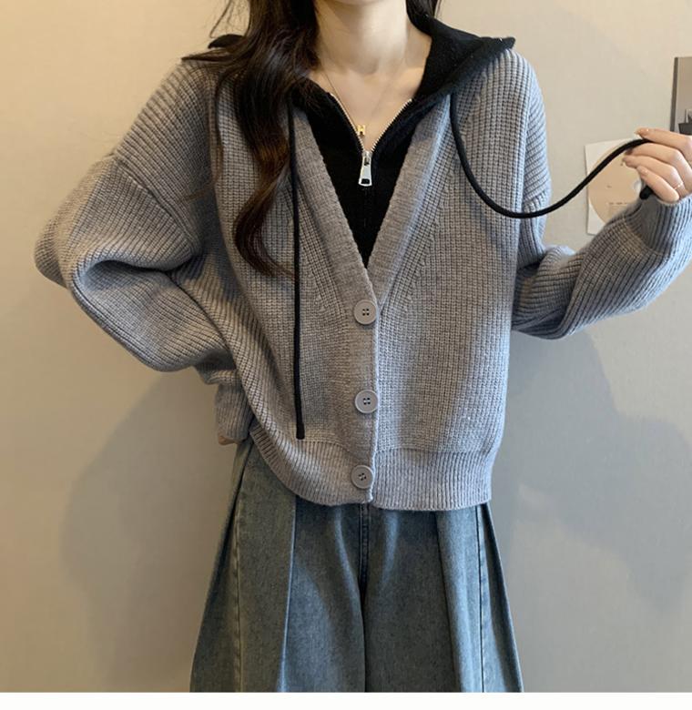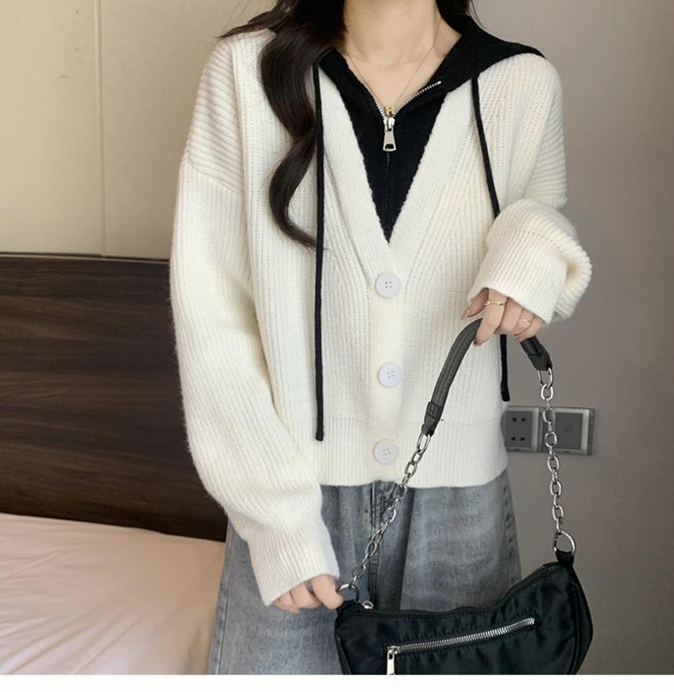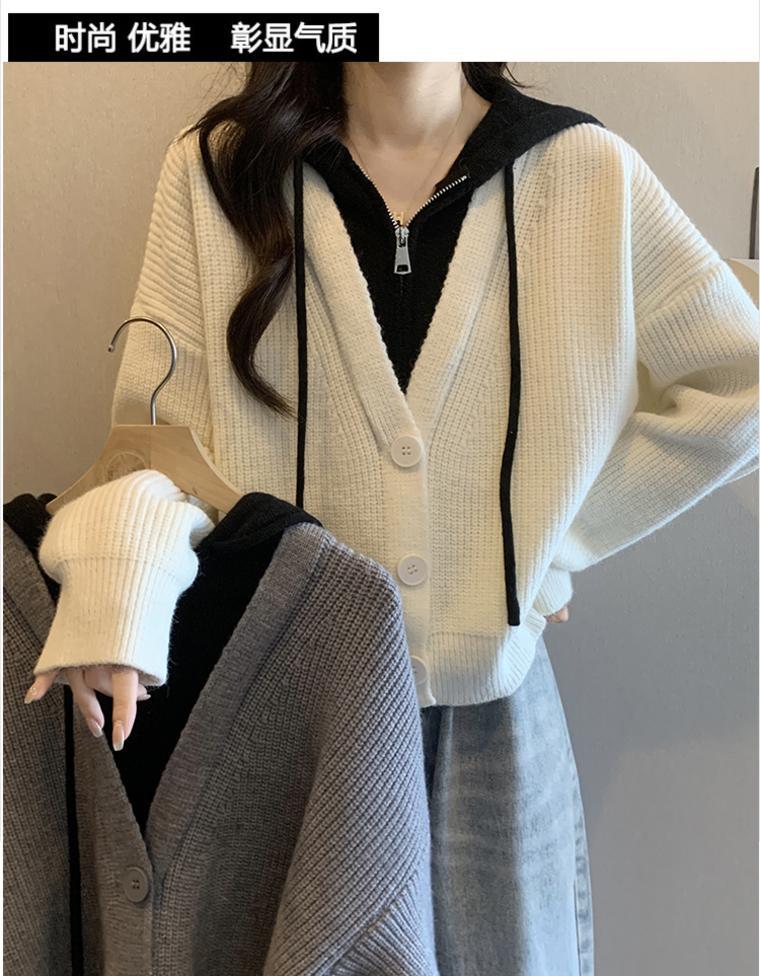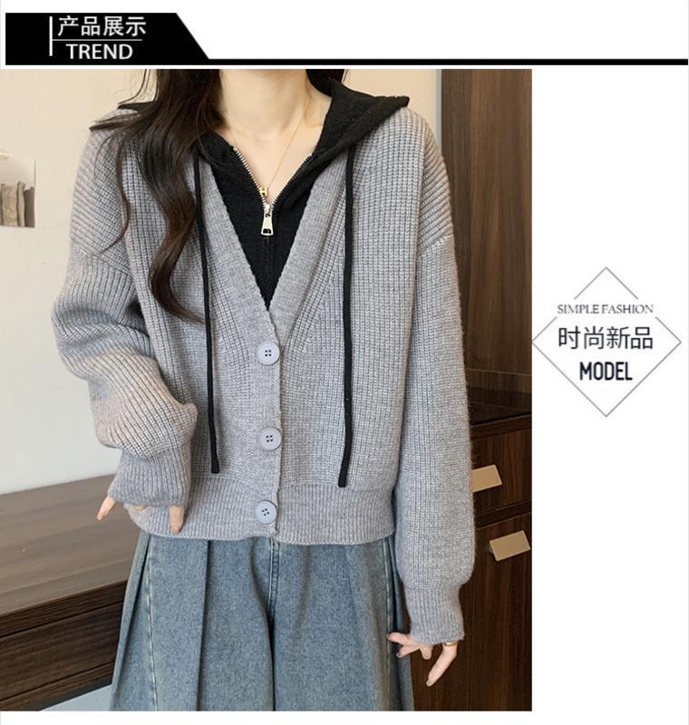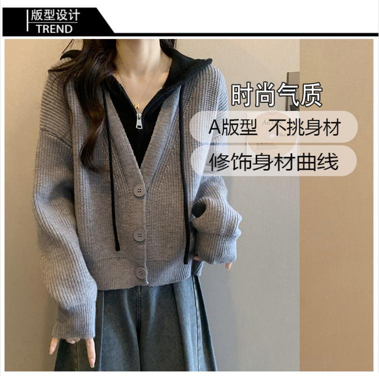Suéter con Capucha de Moda Reductora de Edad para Otoño e Invierno para Mujer, Cárdigan de Punto Versátil de Gama Alta Falso de Dos Piezas A7667