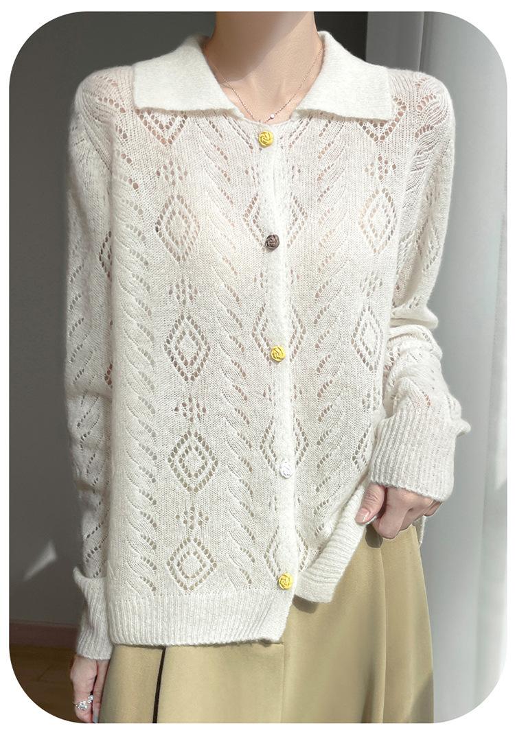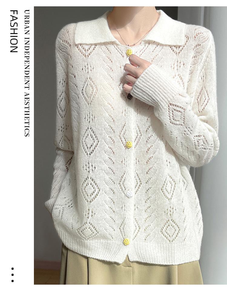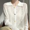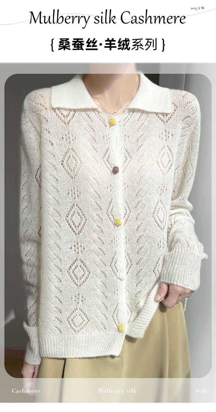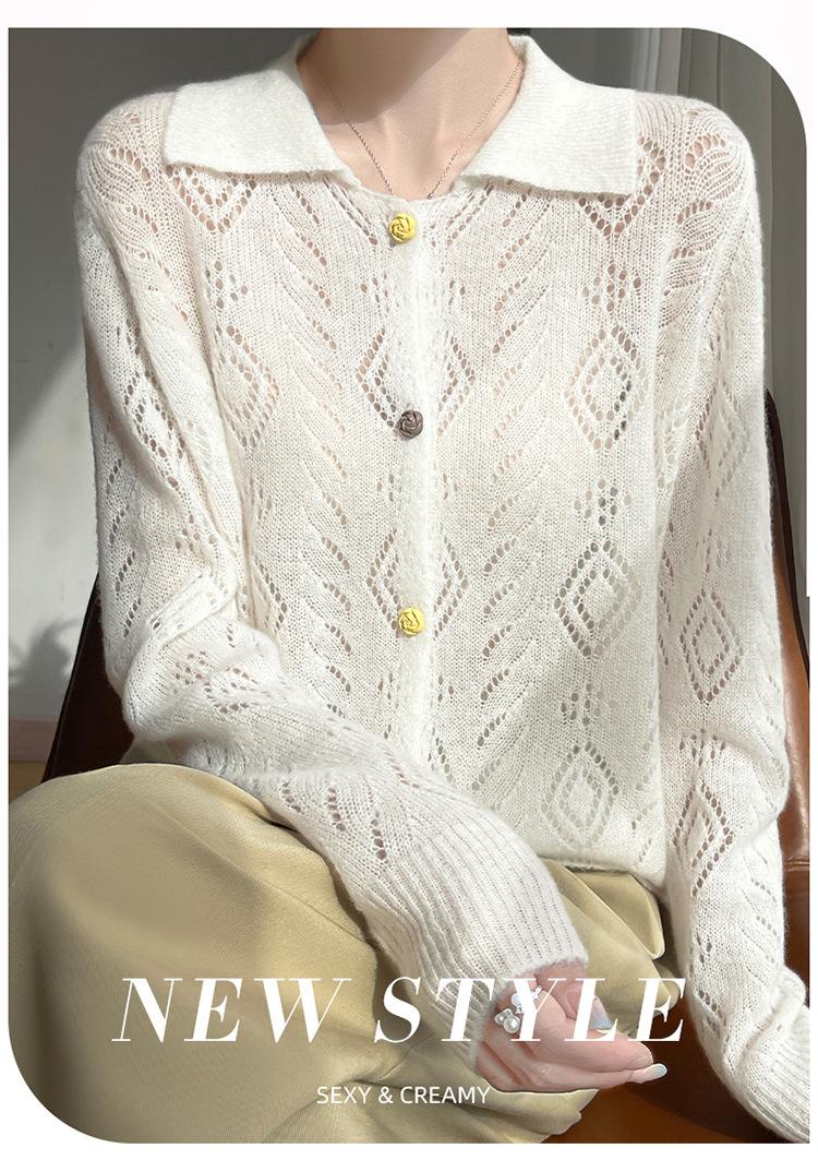 Cárdigan de punto de seda de cachemira con diseño calado, nuevo para otoño e invierno para mujer, solapa, un solo botón, abrigo de ganchillo, tendencia