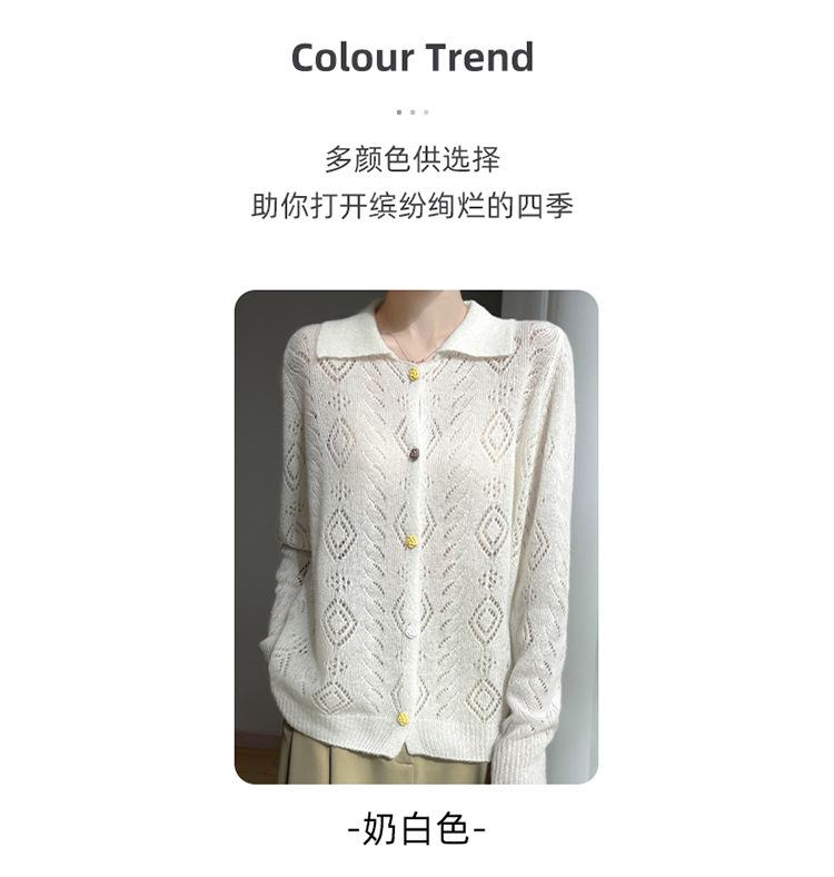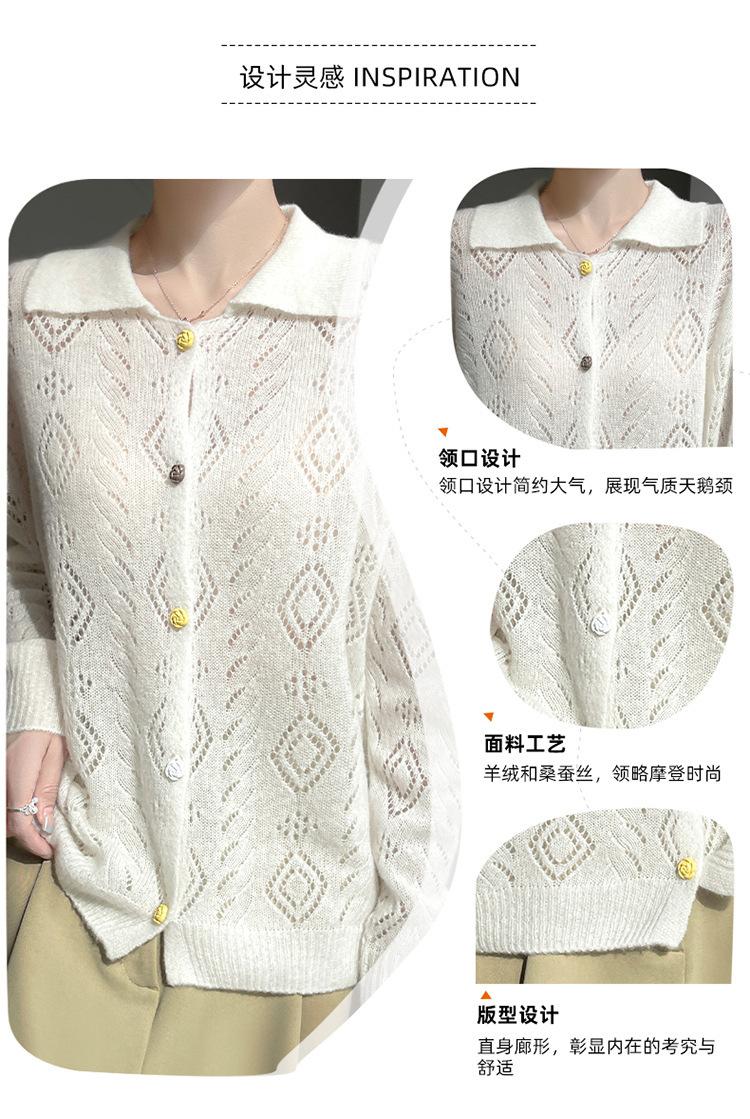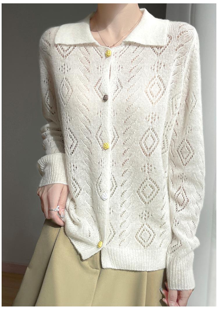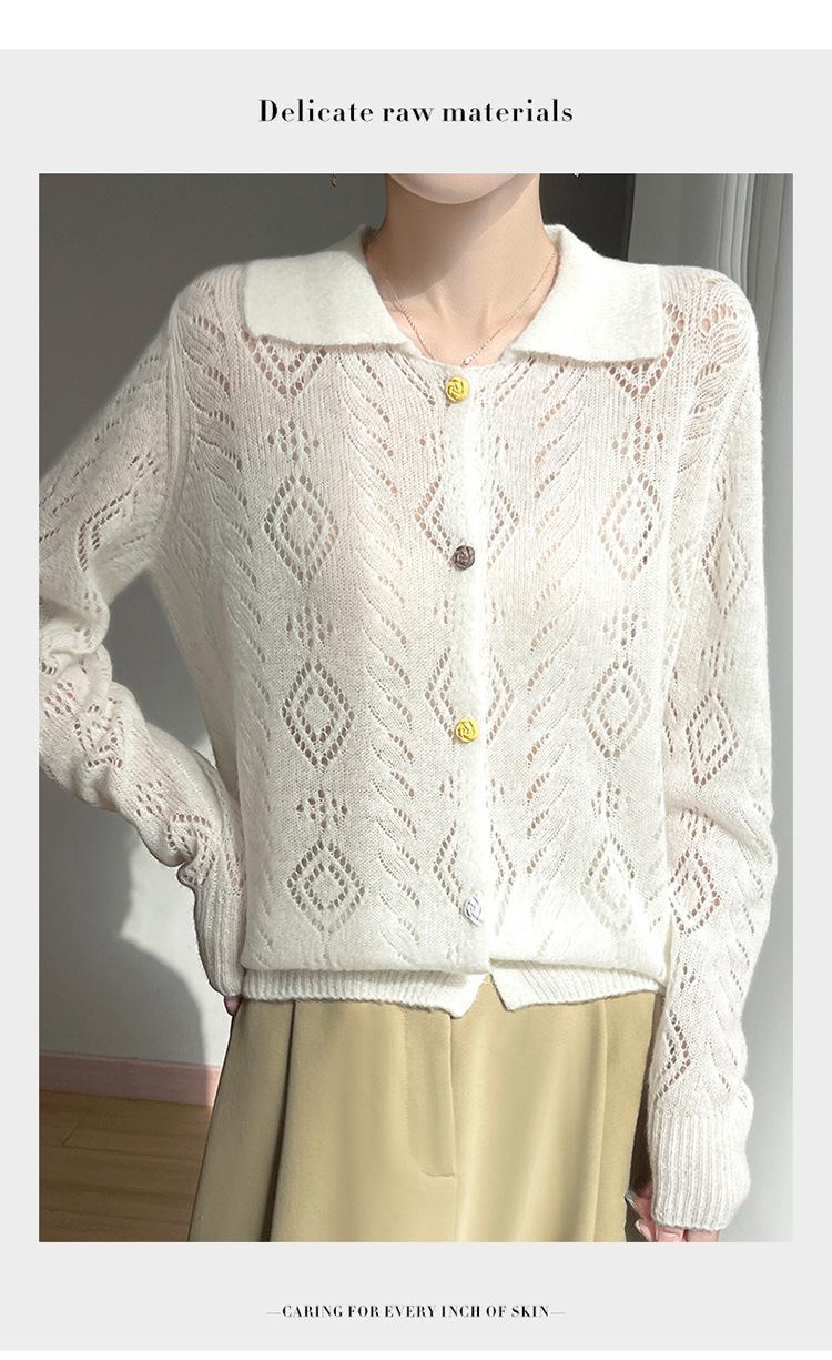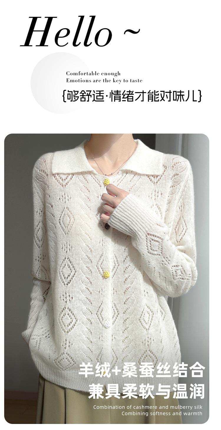 Cárdigan de punto de seda de cachemira con diseño calado, nuevo para otoño e invierno para mujer, solapa, un solo botón, abrigo de ganchillo, tendencia