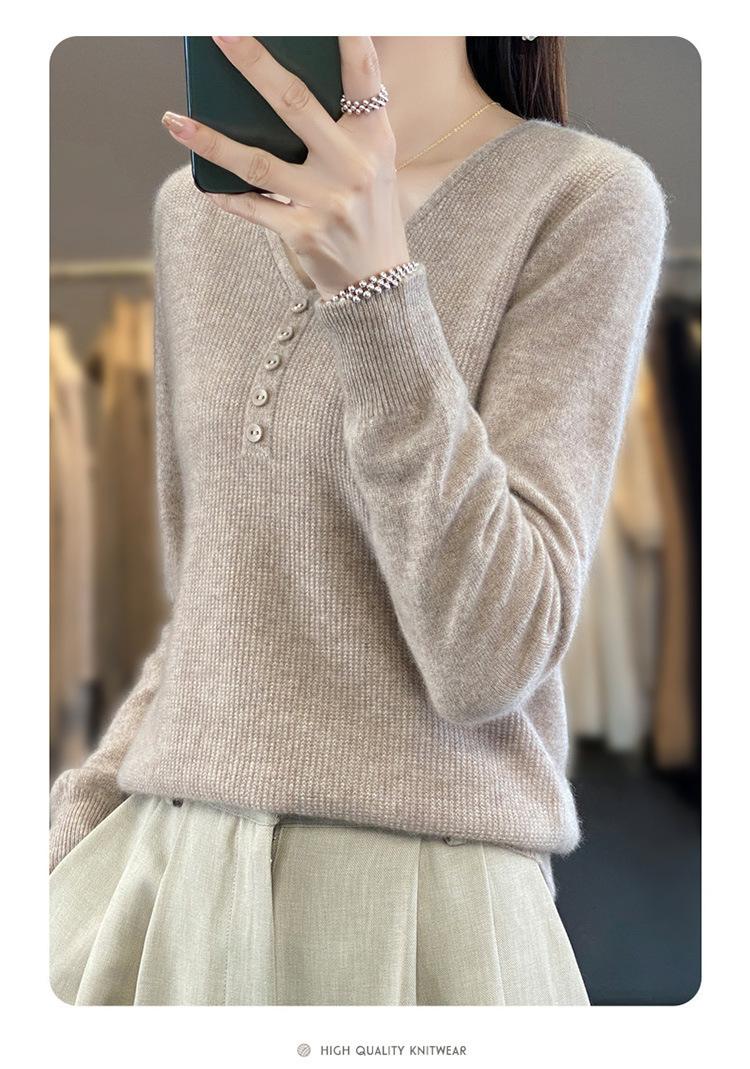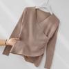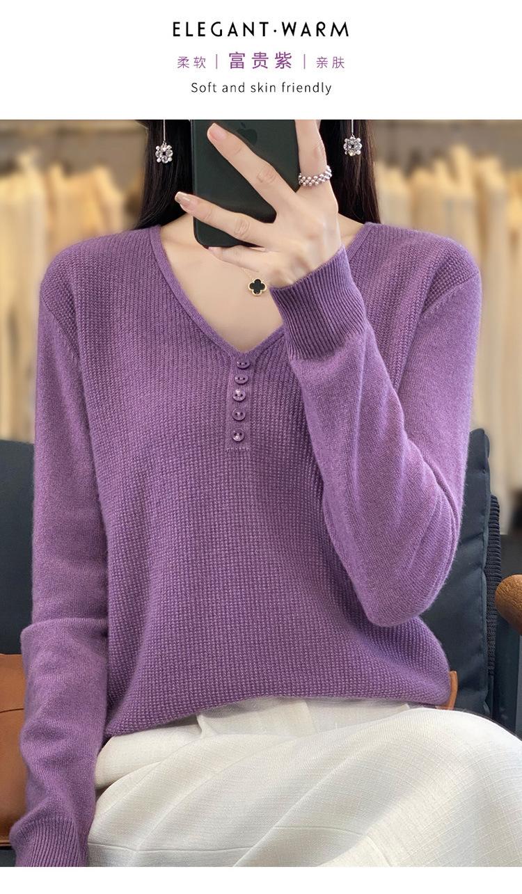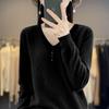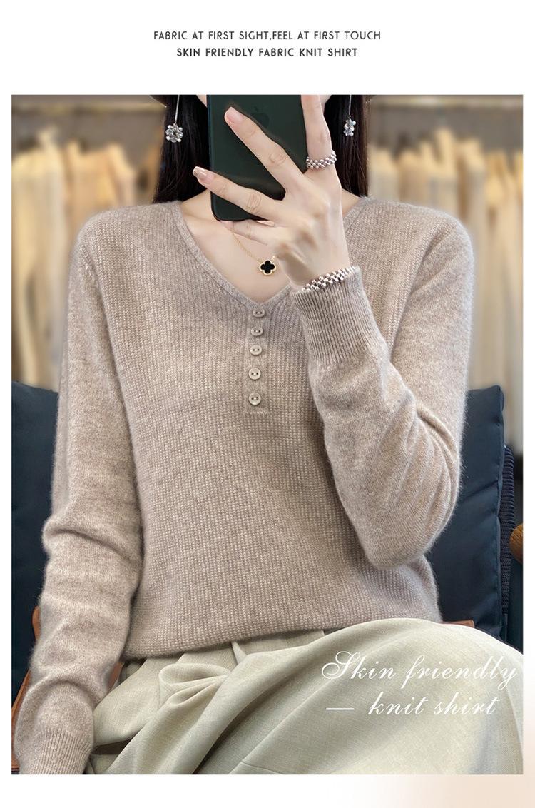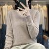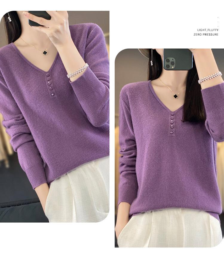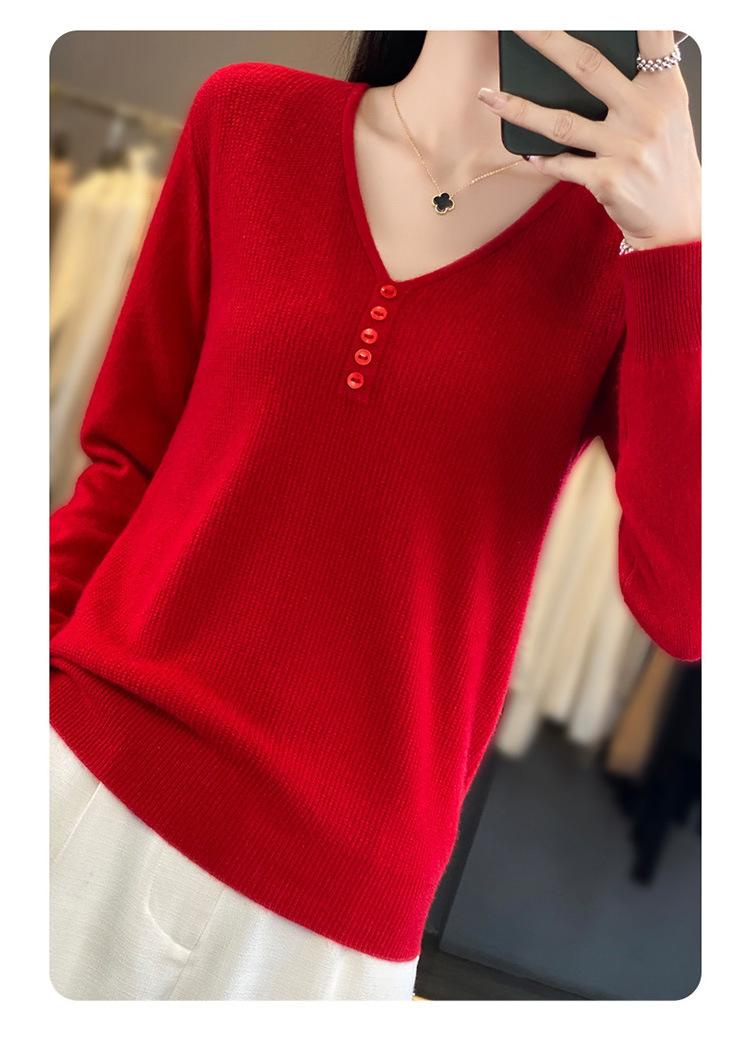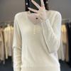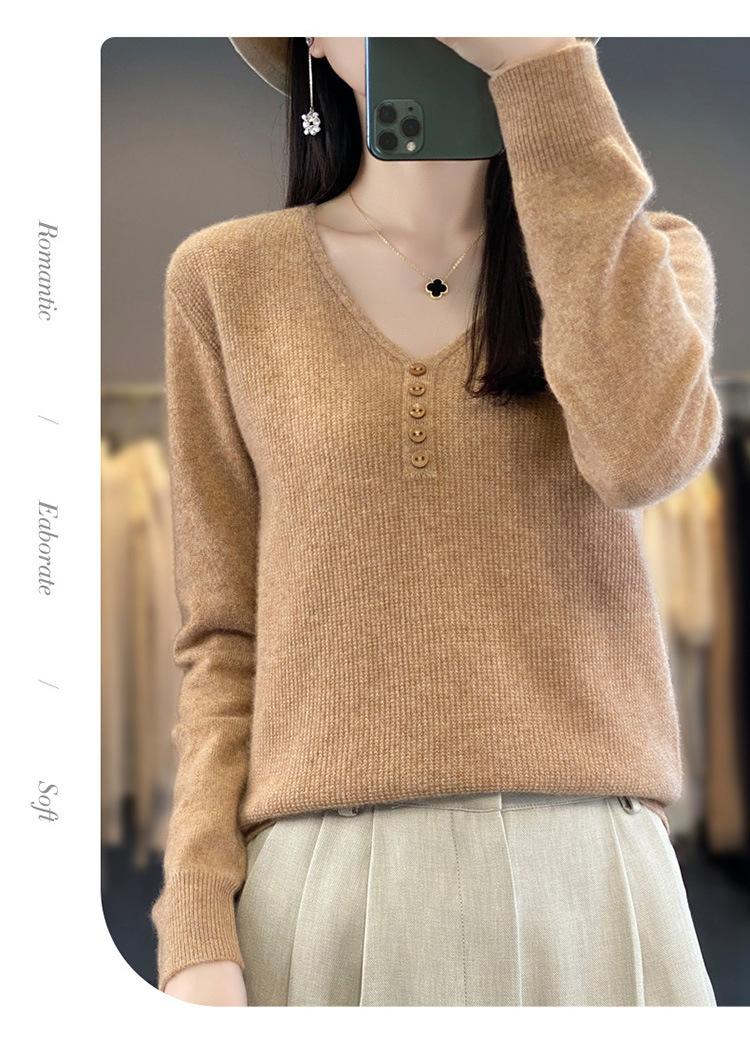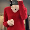 Otoño e invierno ropa interior y exterior nuevo estilo slim fit para mujer con hebilla camisa base cuello en V manga larga suéter tejido top holgado talla grande