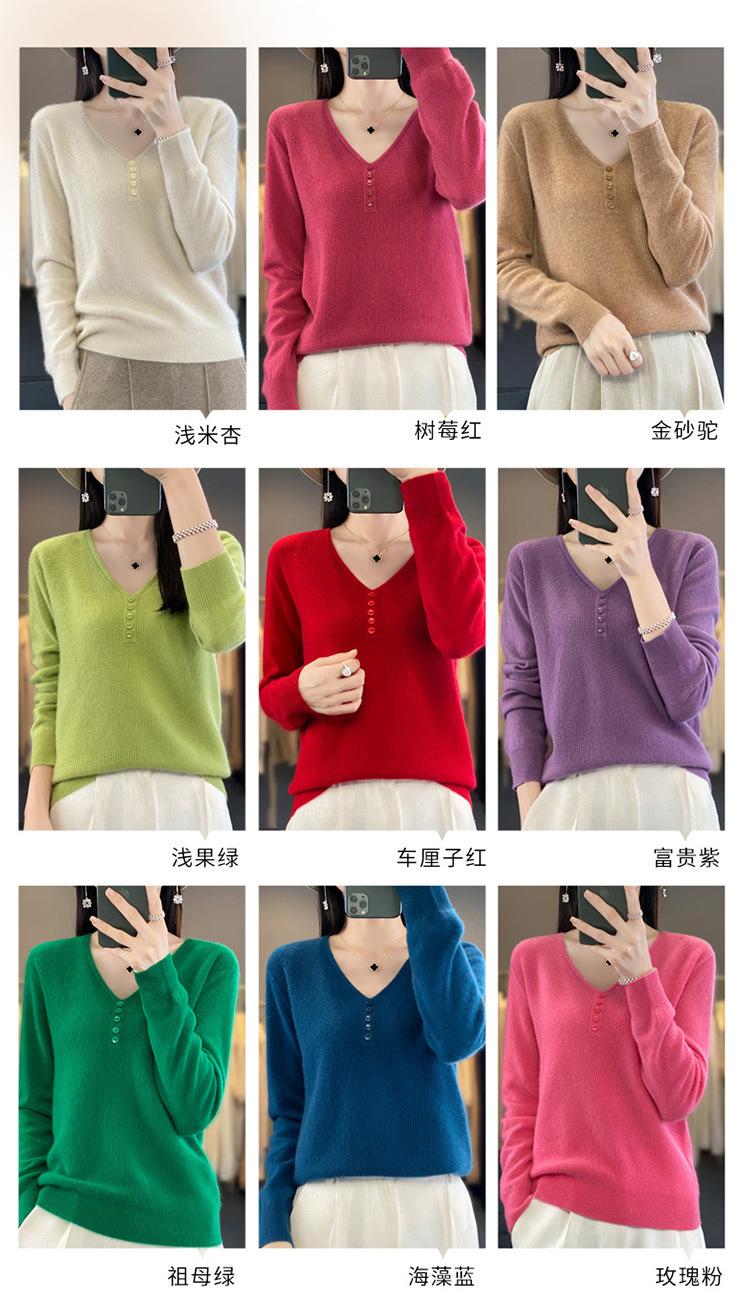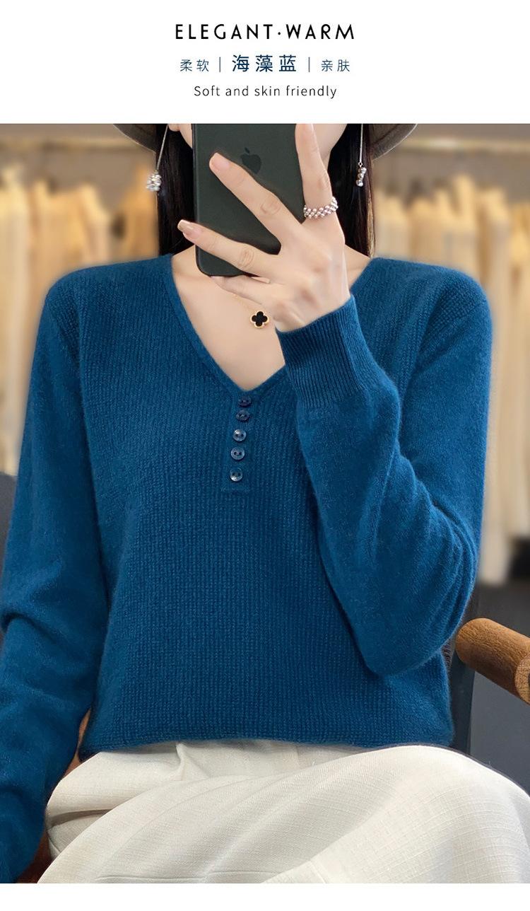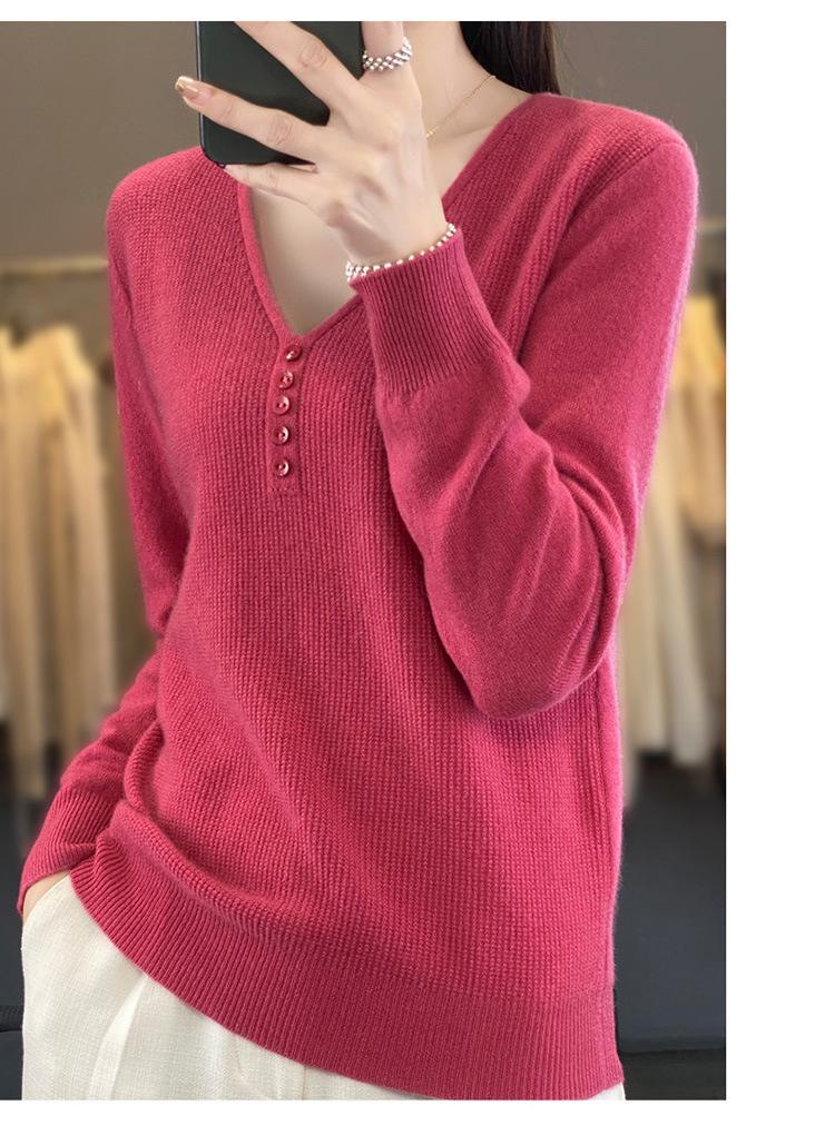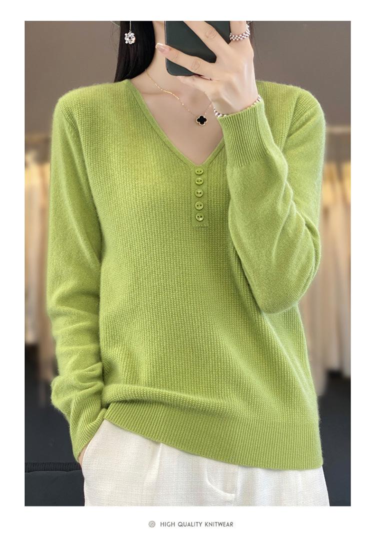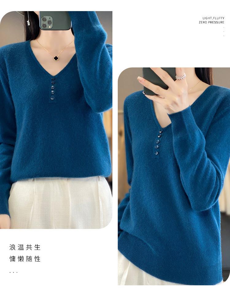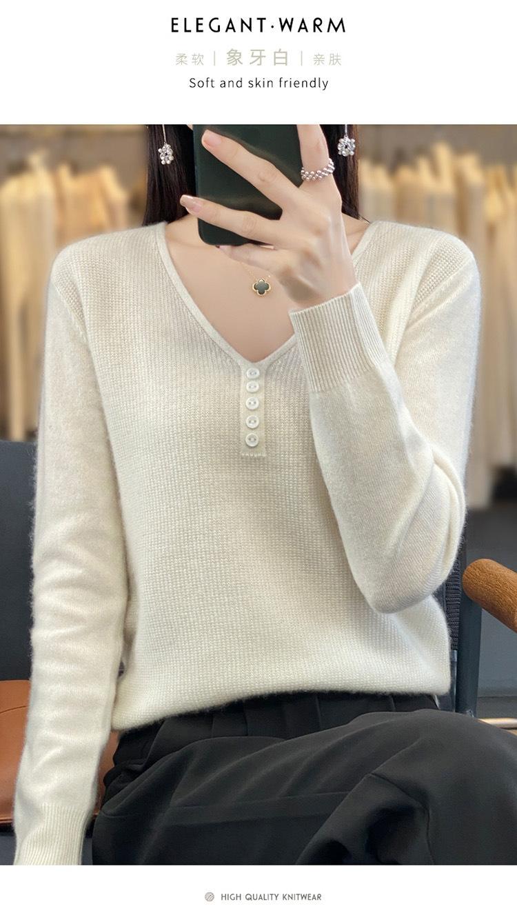Otoño e invierno ropa interior y exterior nuevo estilo slim fit para mujer con hebilla camisa base cuello en V manga larga suéter tejido top holgado talla grande