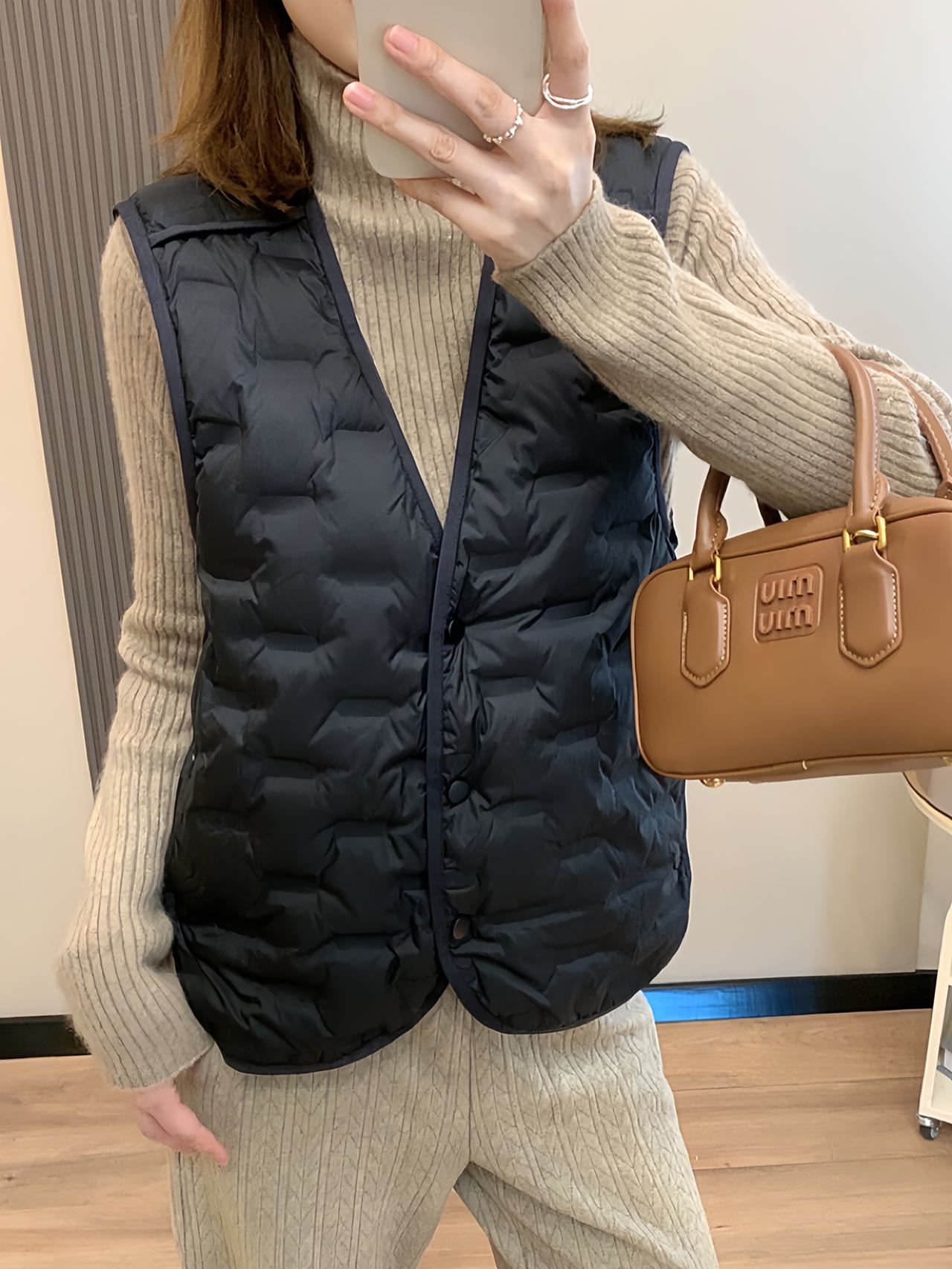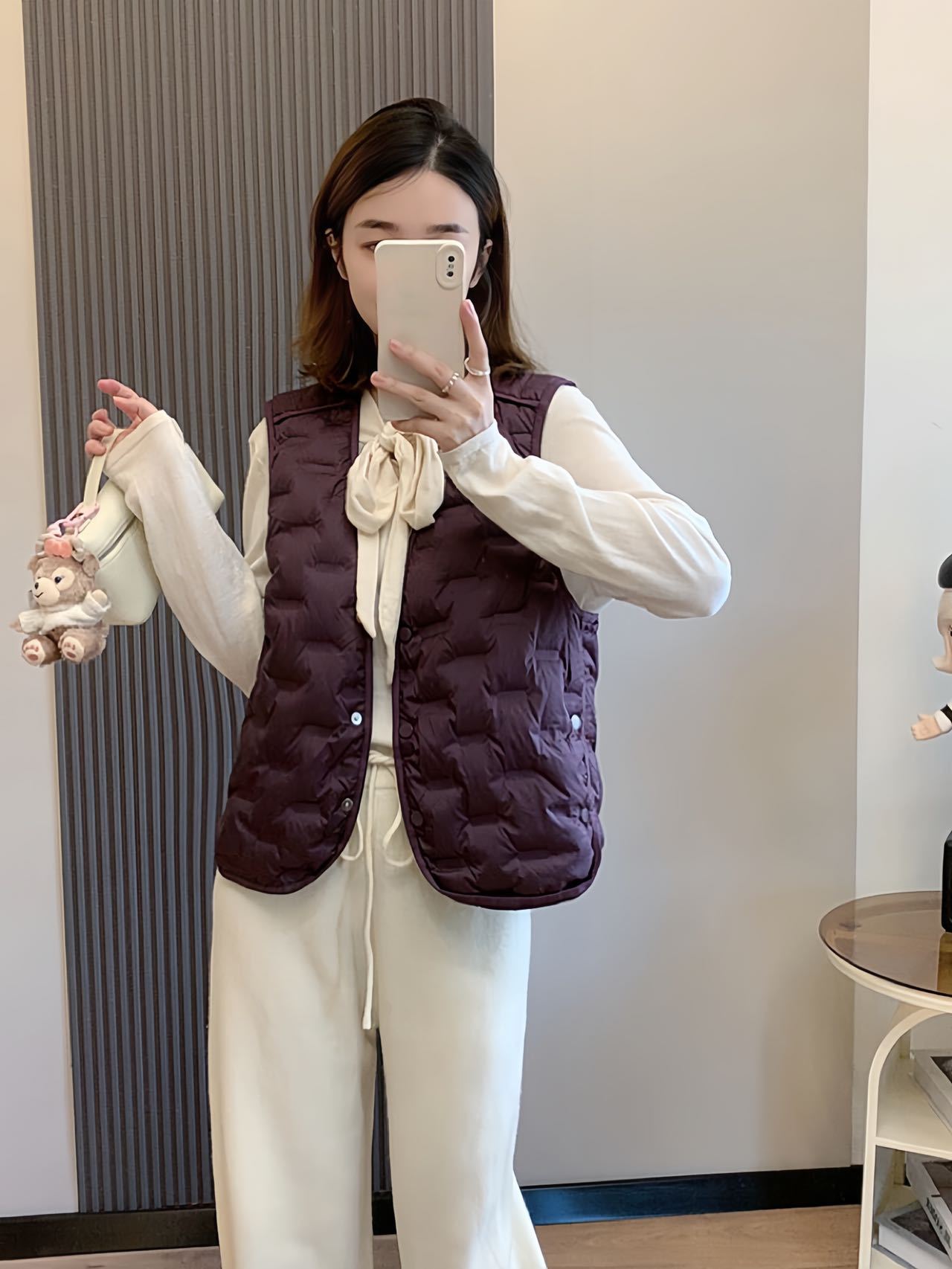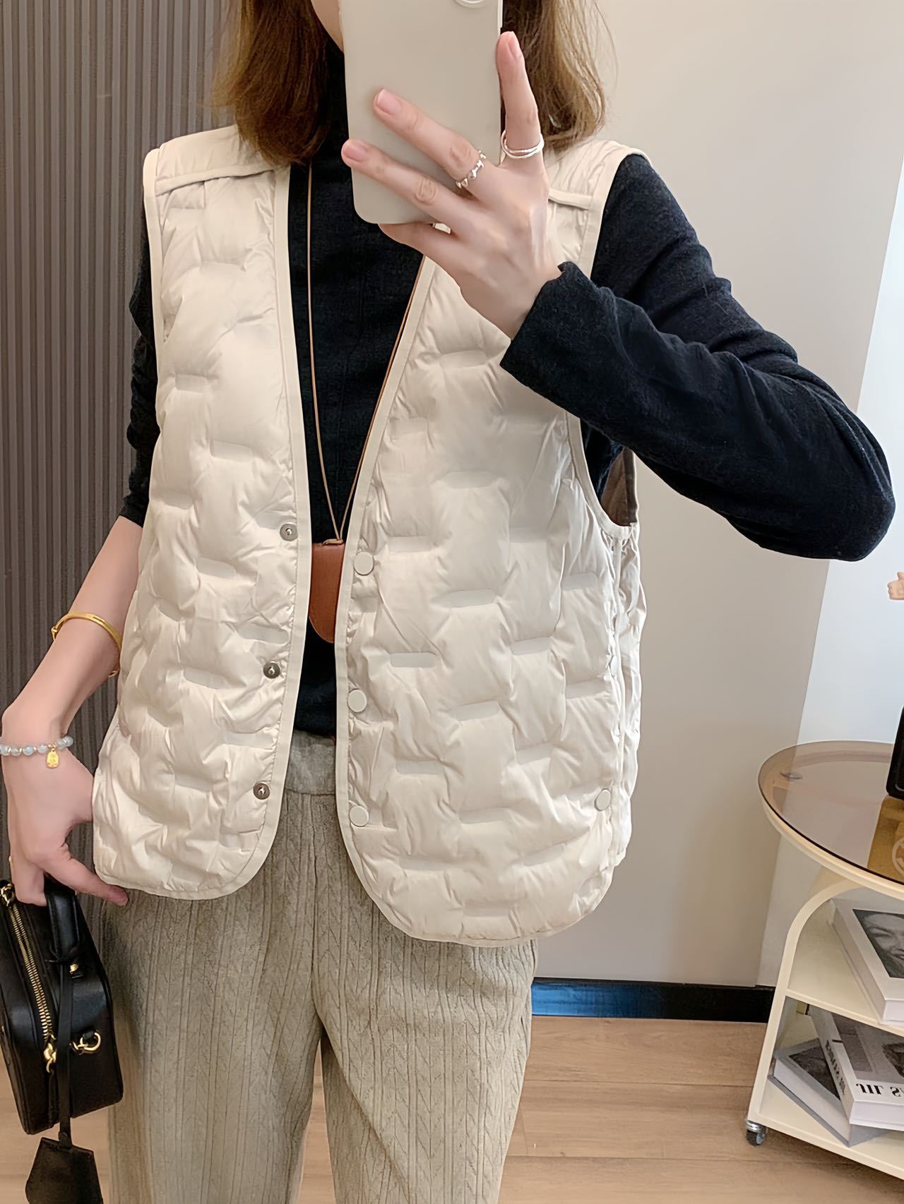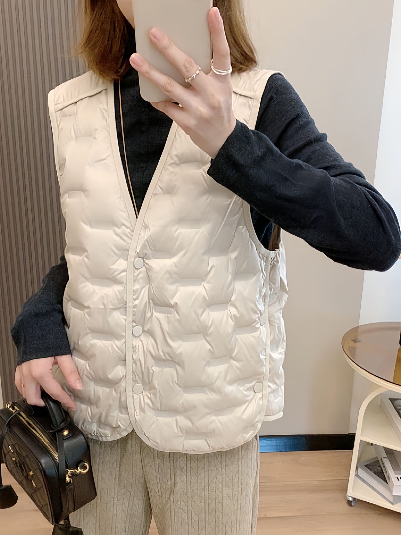 Chaleco Ligero de Plumón para Mujer Estilo Corto 2025 Otoño/Invierno Nuevo Cuello en V Sencillo Holgado Versátil Sin Mangas Ropa Exterior