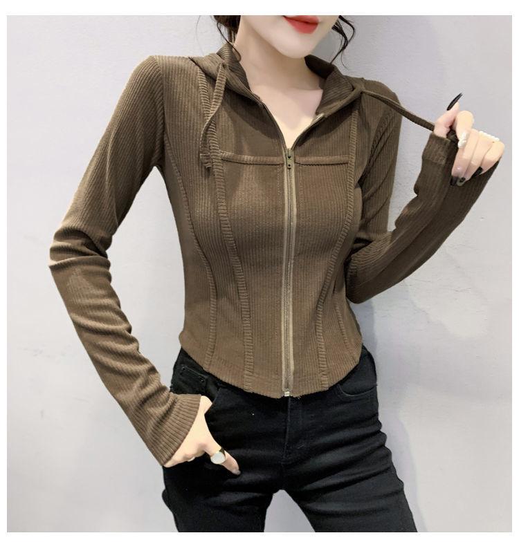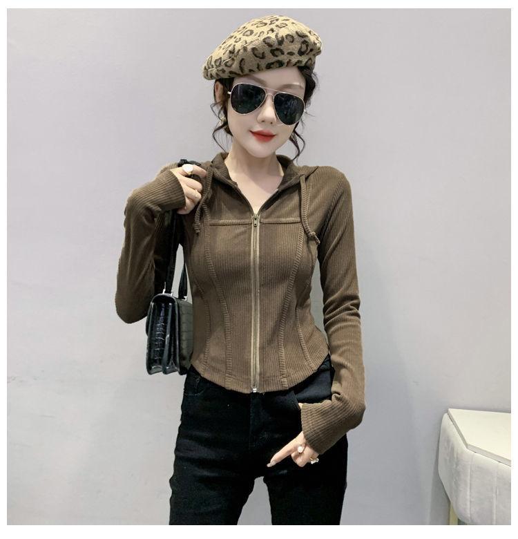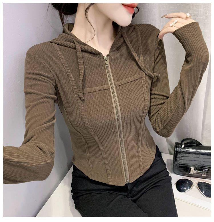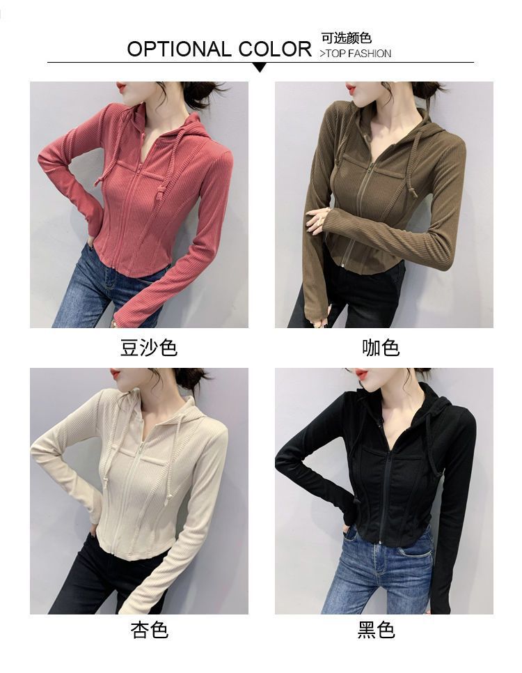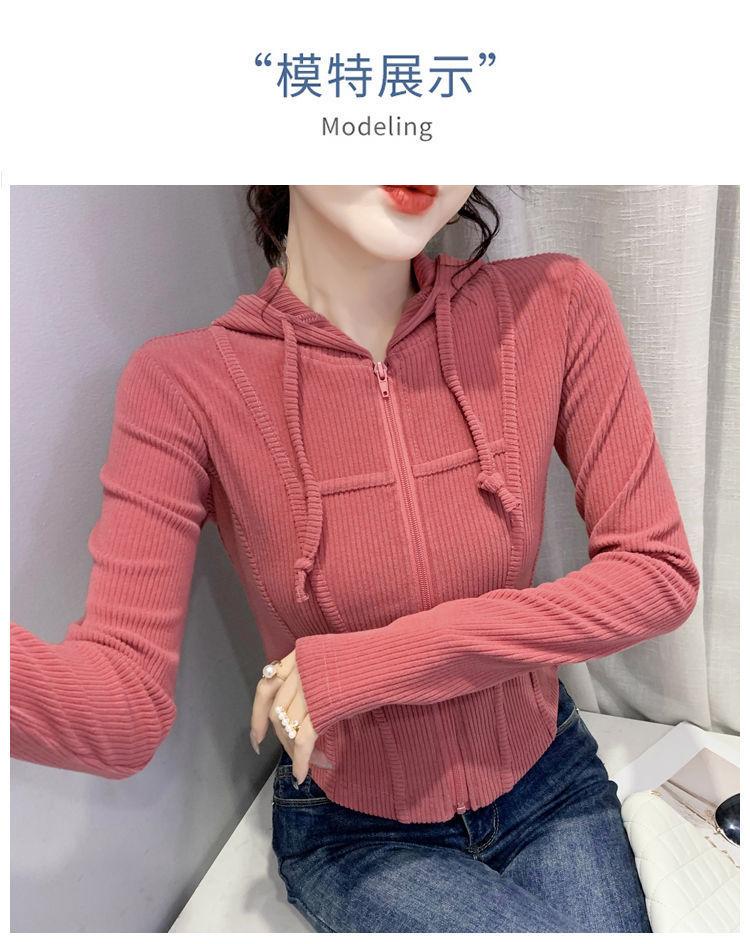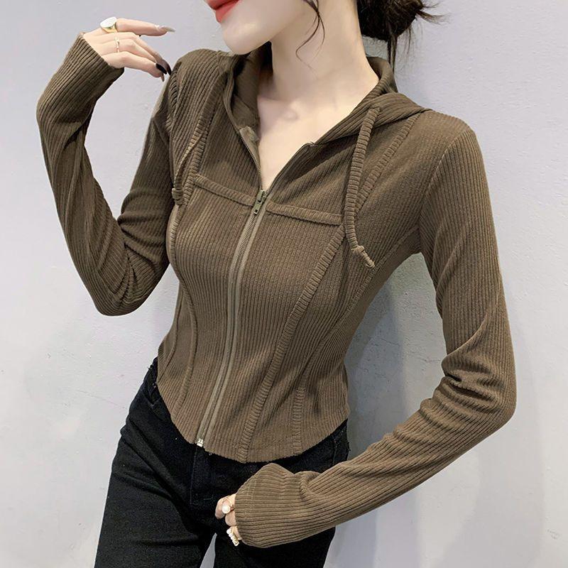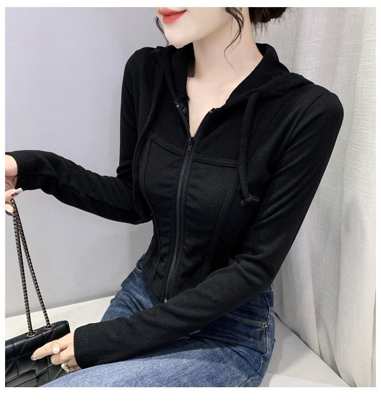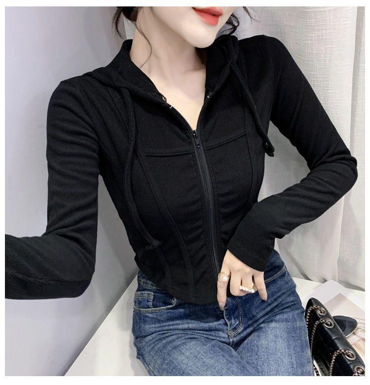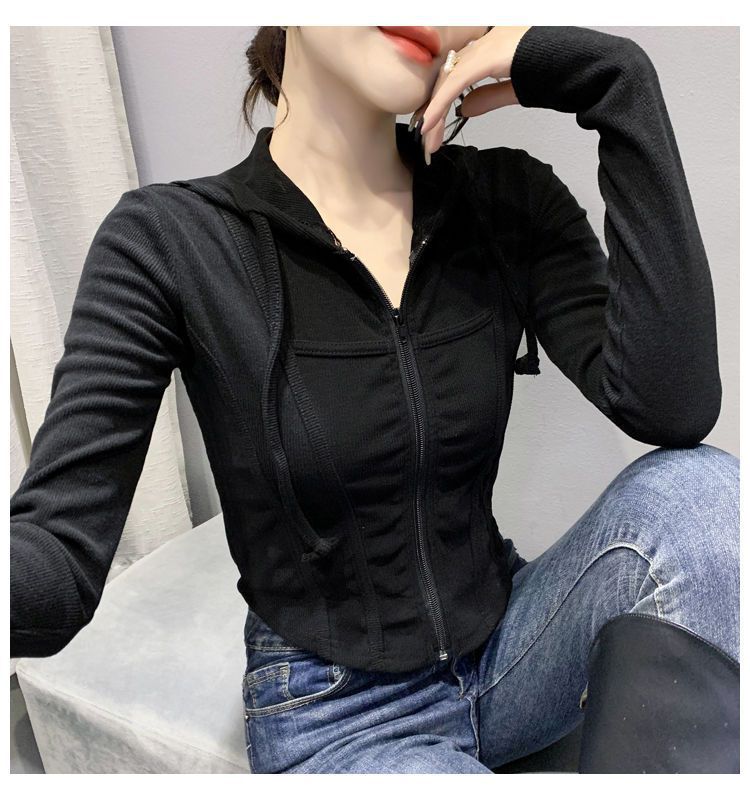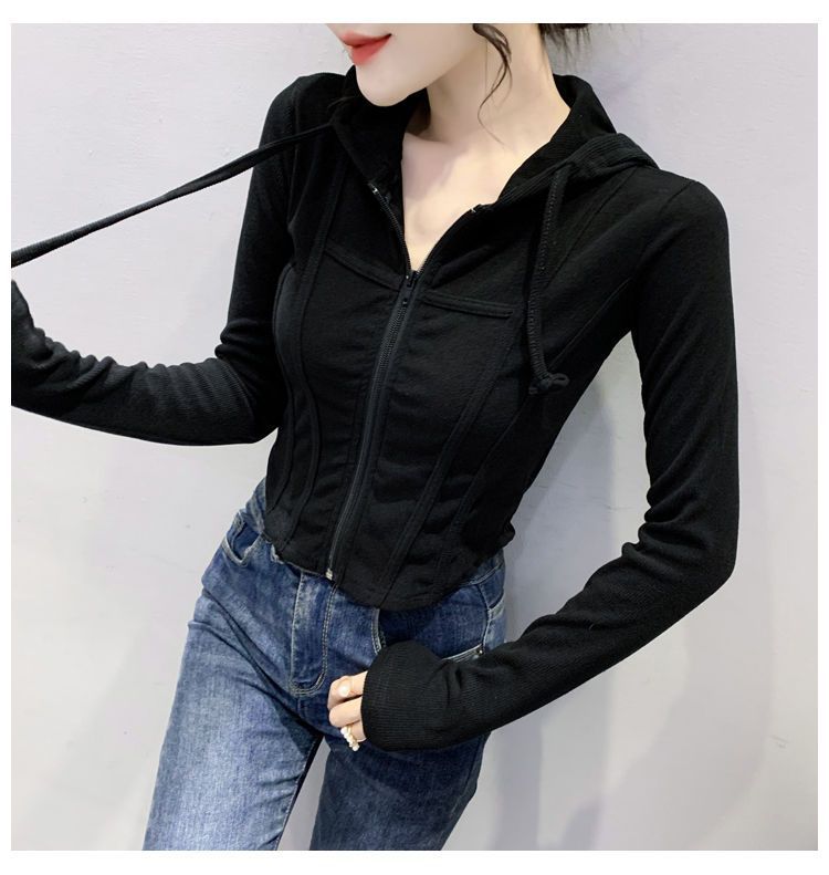 Top deportivo con capucha, cordón ajustable, patchwork y cremallera para mujer, nuevo para primavera y otoño 2025, corte ajustado y favorecedor, chaqueta corta con temperamento