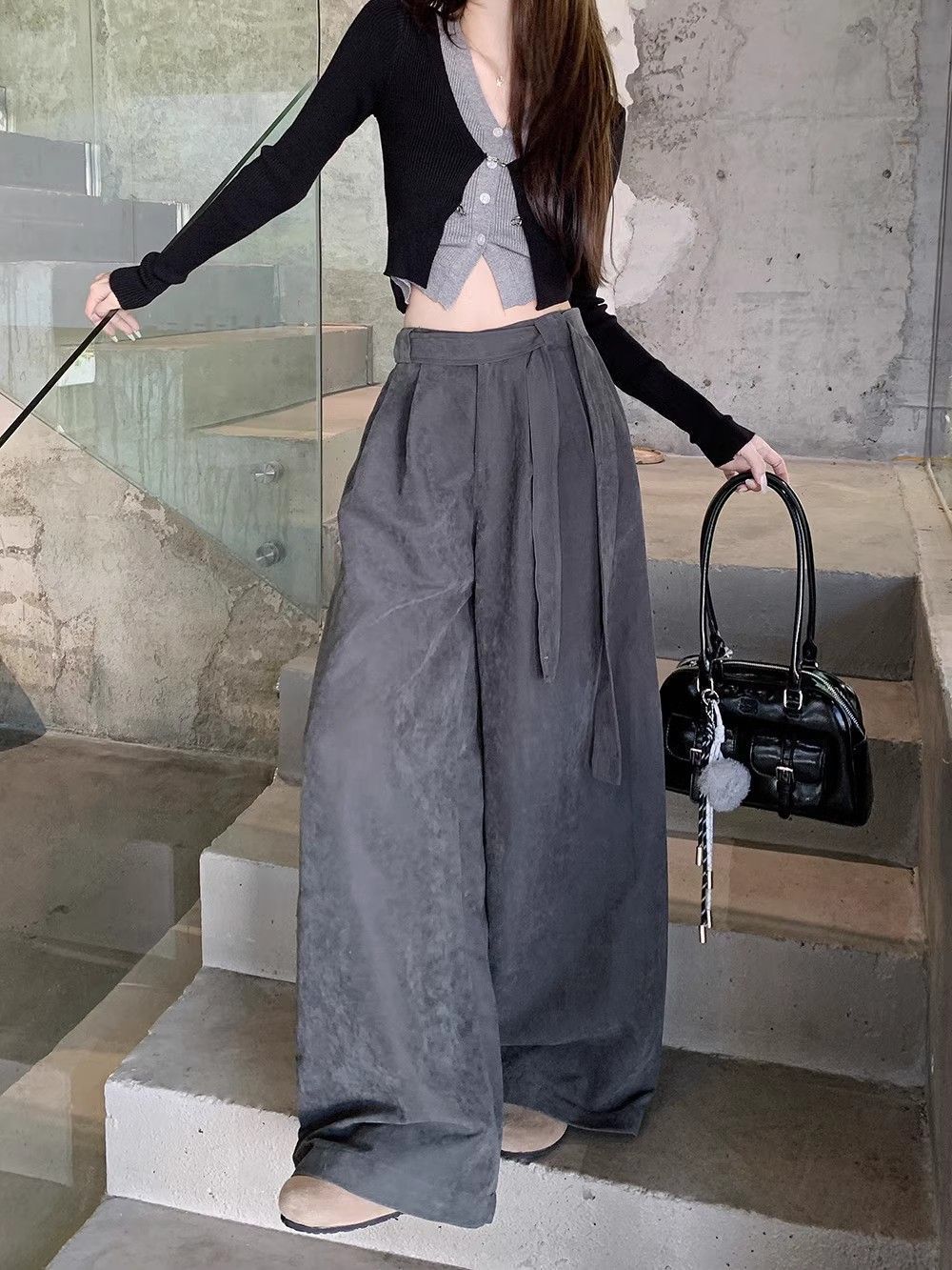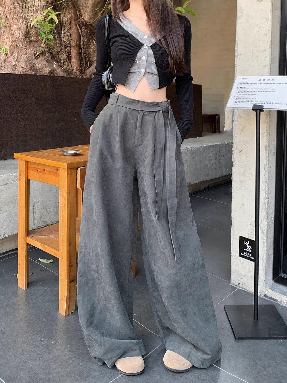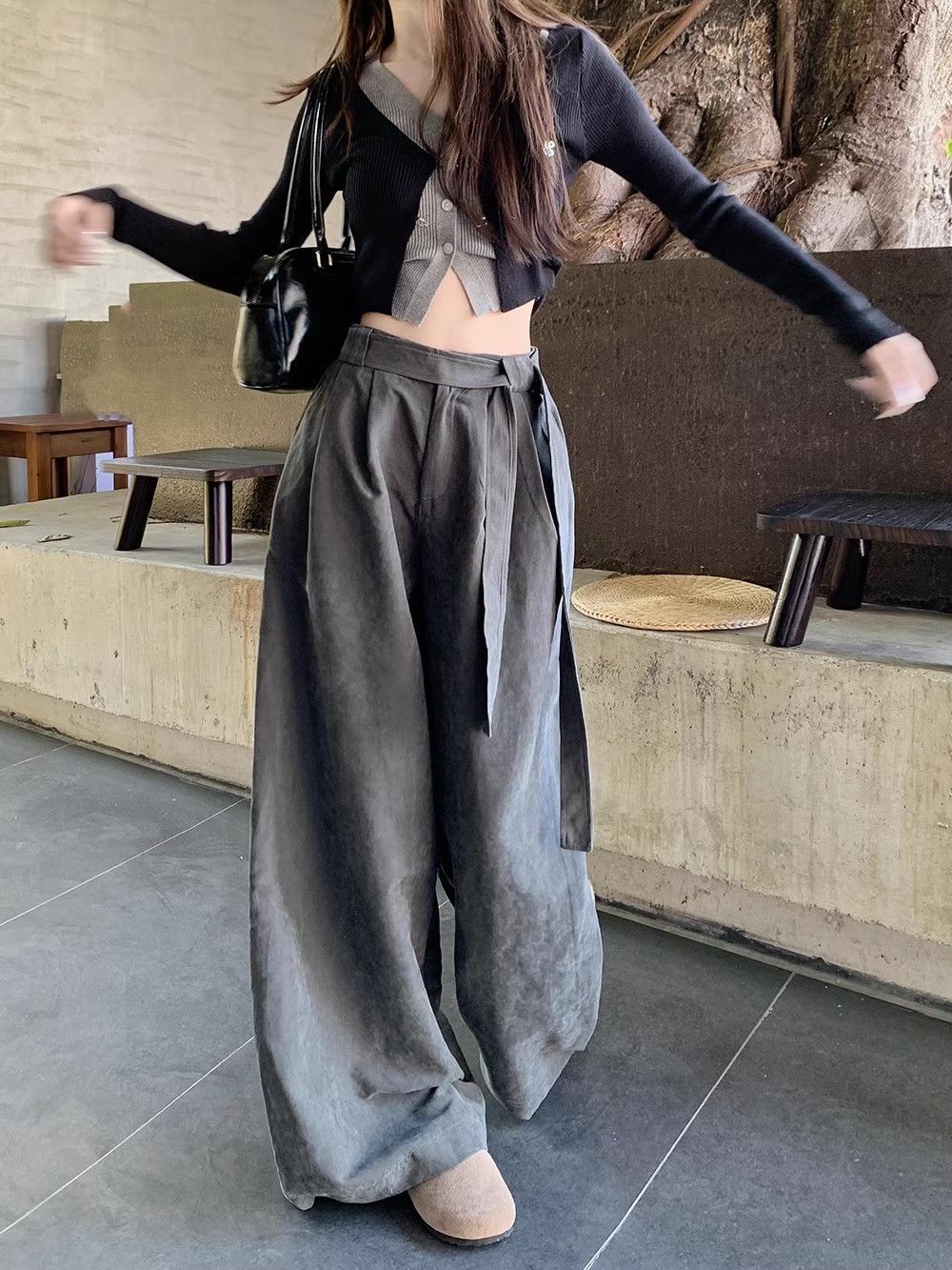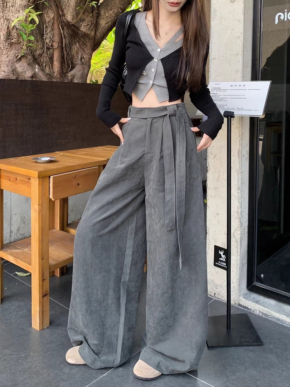 Pantalones casuales de pierna ancha con cinturón gris oscuro nuevo para mujer, verano nuevo, estilo retro de Hong Kong, lavado, caída, pierna recta, pantalones largos