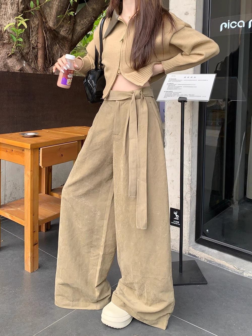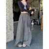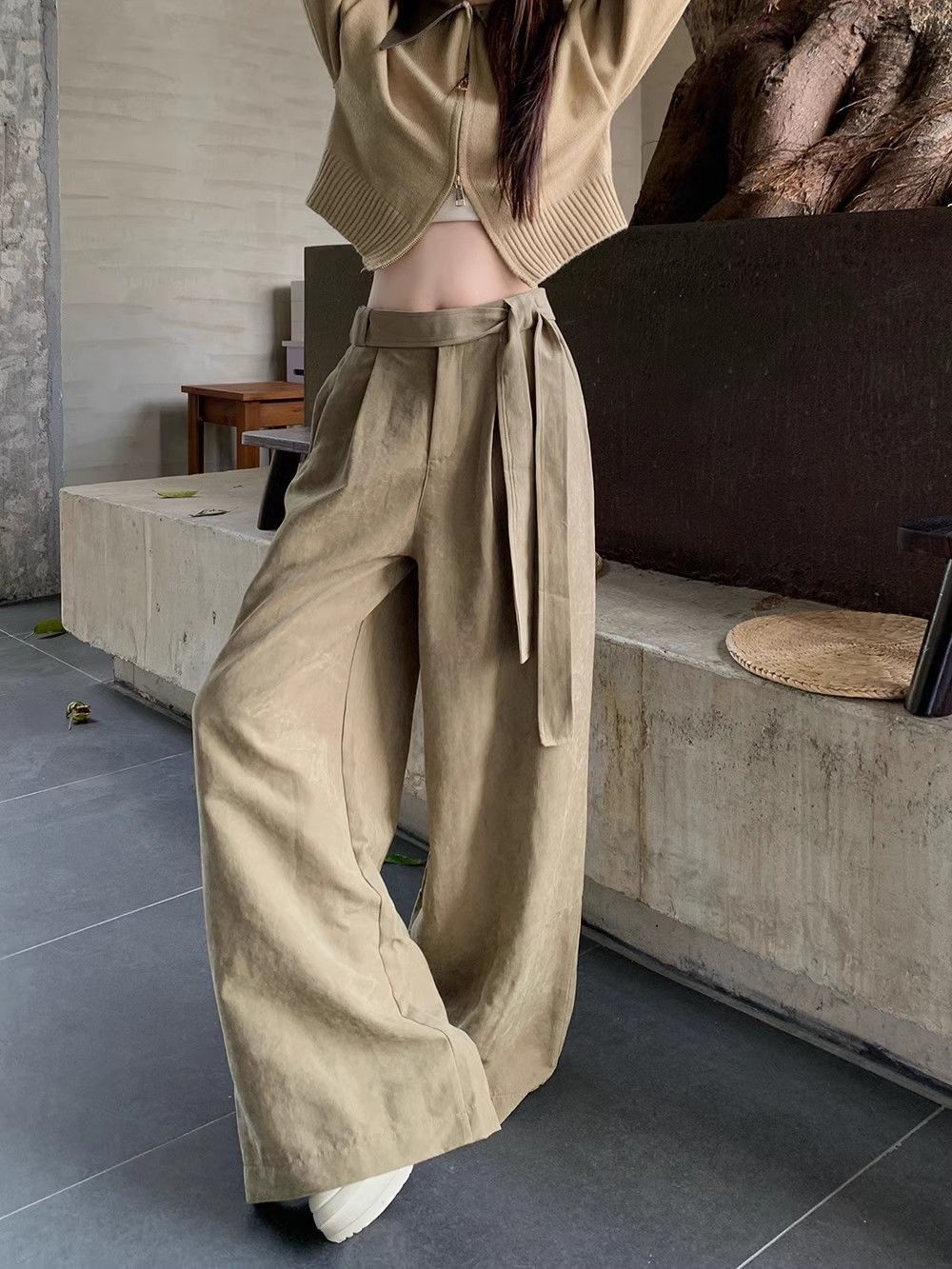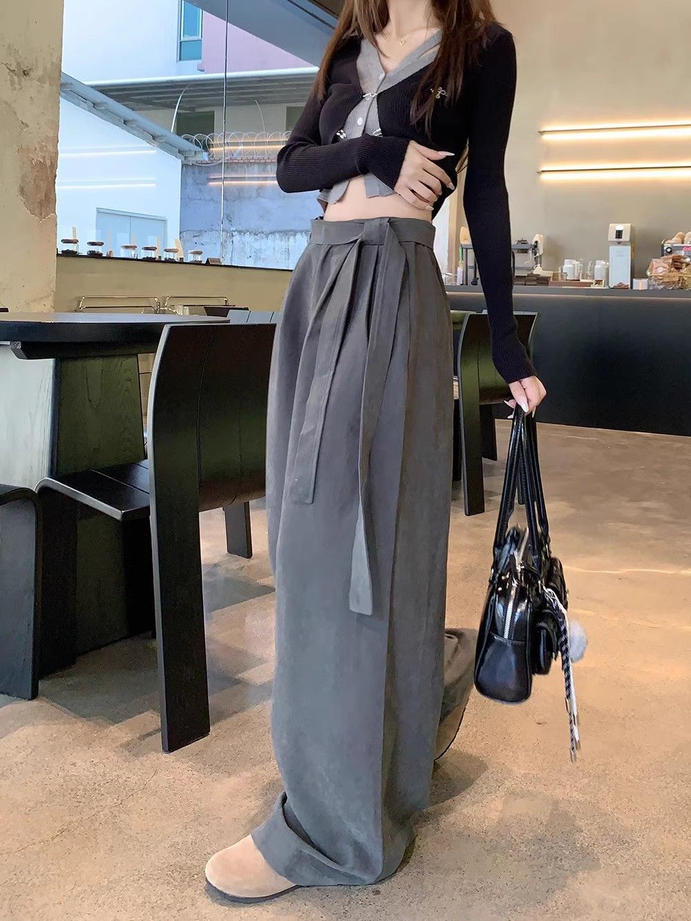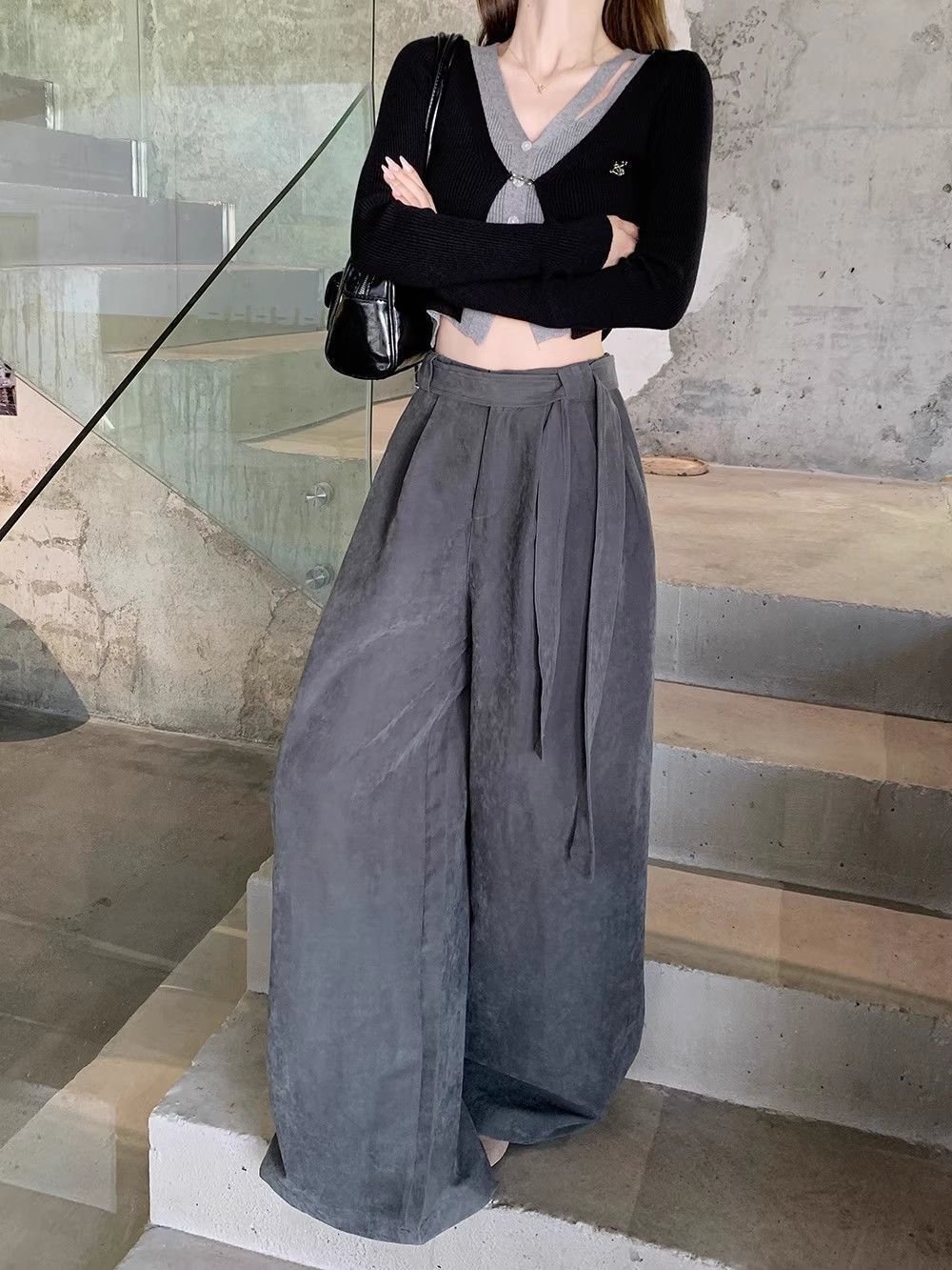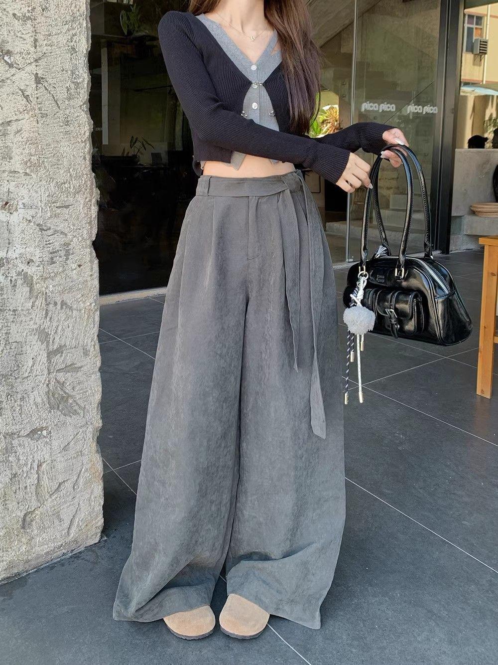 Pantalones casuales de pierna ancha con cinturón gris oscuro nuevo para mujer, verano nuevo, estilo retro de Hong Kong, lavado, caída, pierna recta, pantalones largos