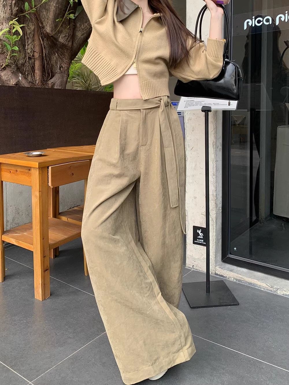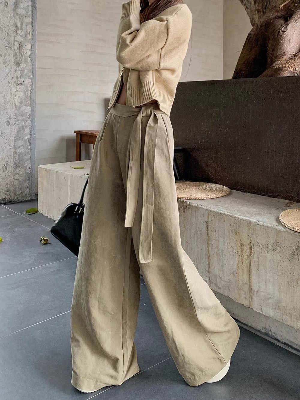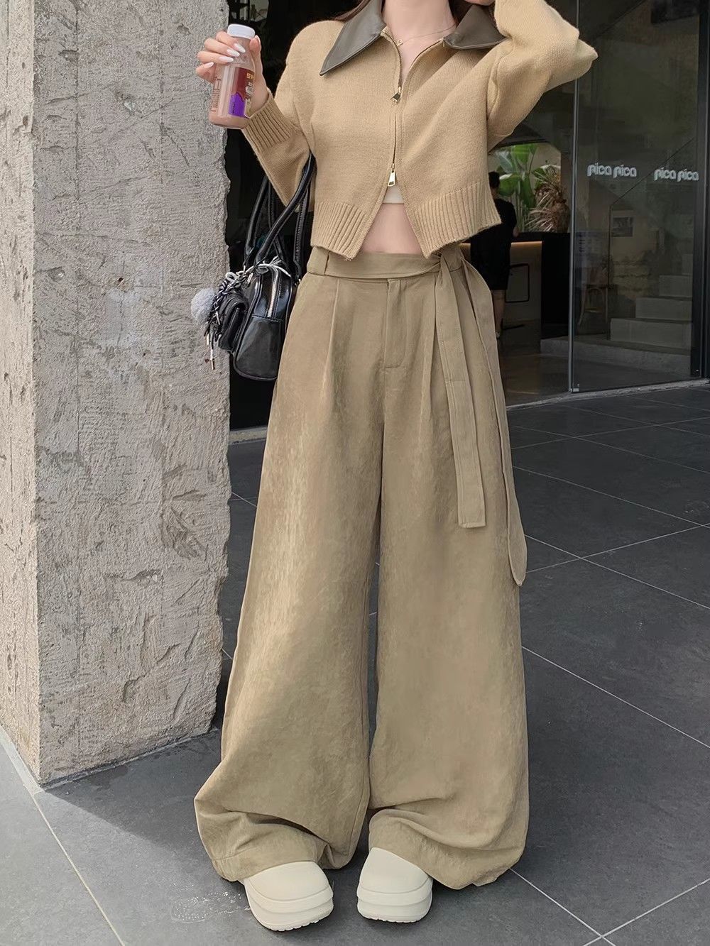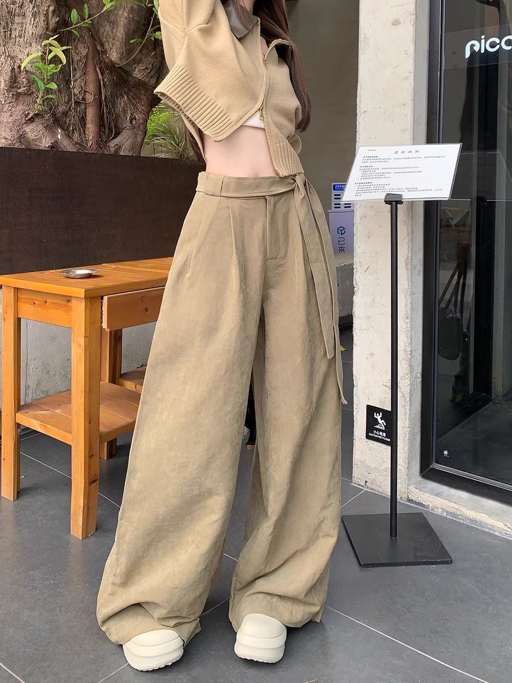 Pantalones casuales de pierna ancha con cinturón gris oscuro nuevo para mujer, verano nuevo, estilo retro de Hong Kong, lavado, caída, pierna recta, pantalones largos