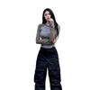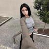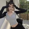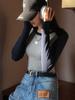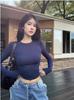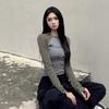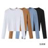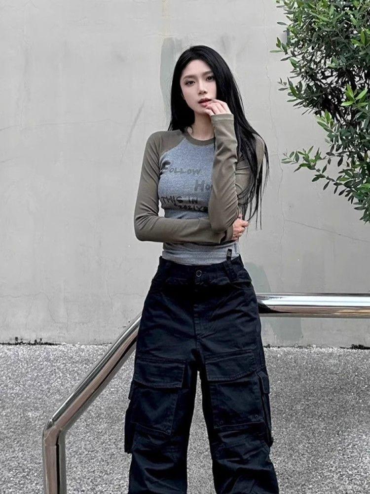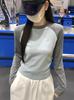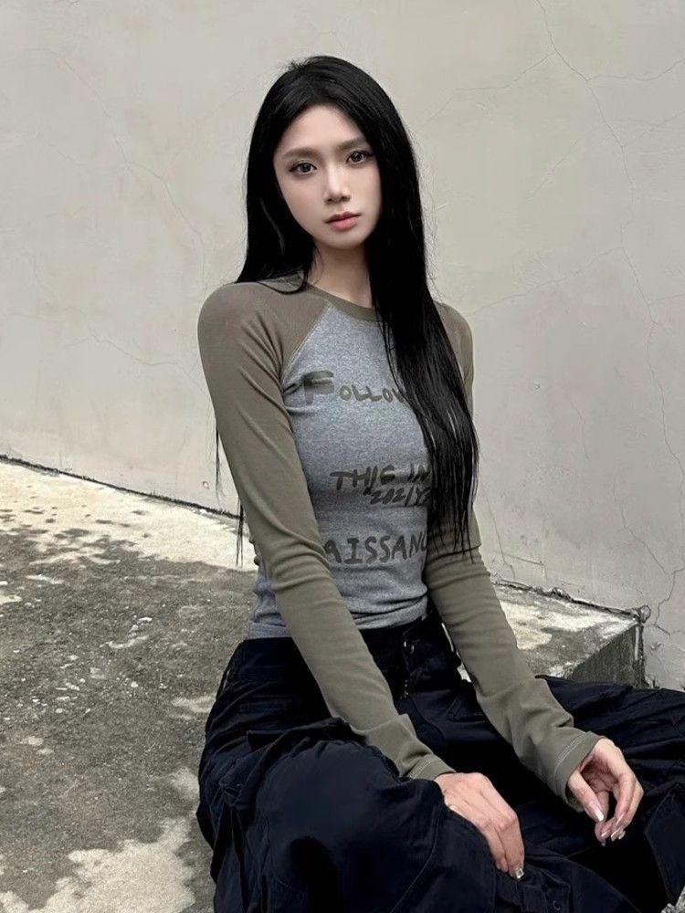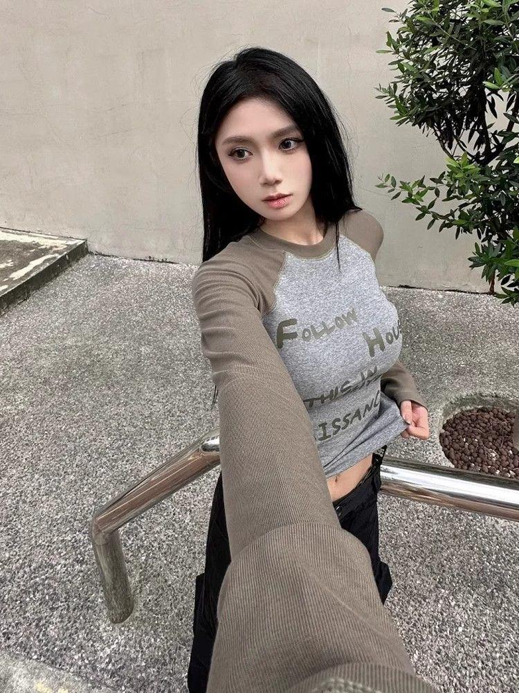 Camiseta de Manga Larga con Hombro Recto Estilo Americano y Bloque de Color para Mujer Otoño Invierno Capa Interior Camisa Base Adelgazante Top Corto Ajustado de Chica Sexy