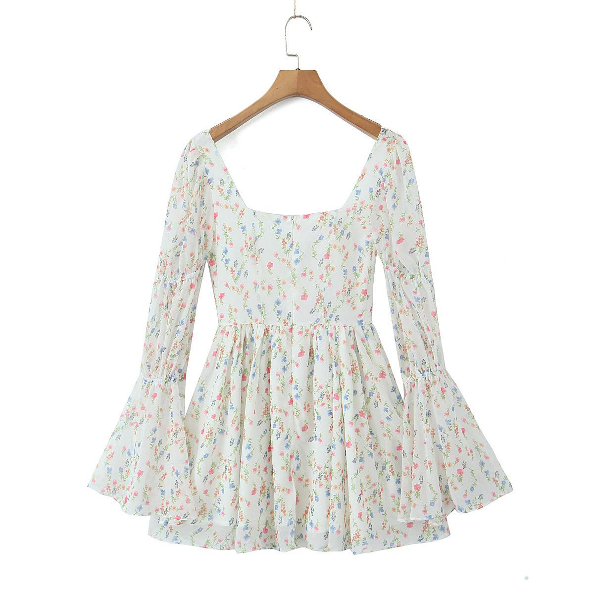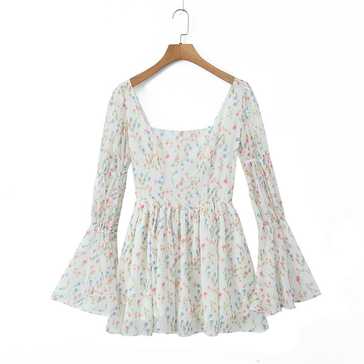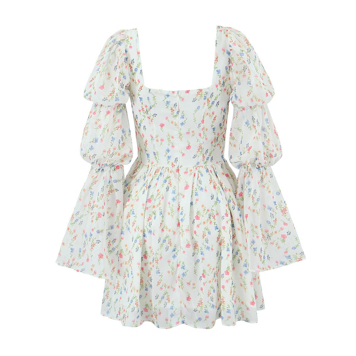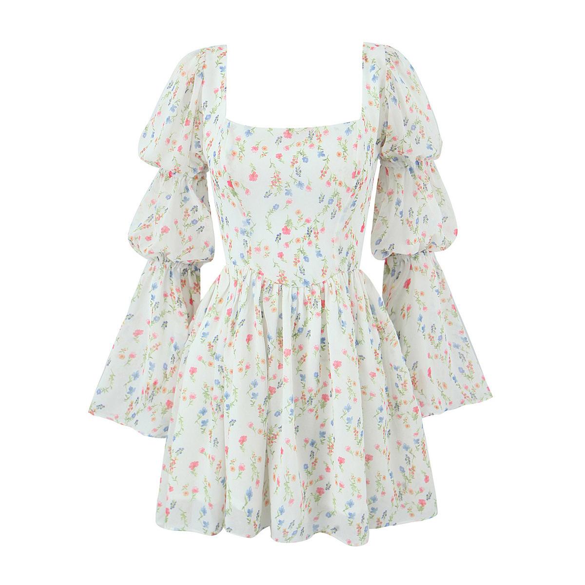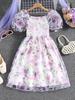 Fantasía Chica Dulce Ambiente Francés Floral Cuello Cuadrado Grande Sección Peel Manga Trompeta Vestido de Hada vestido Verano 2024