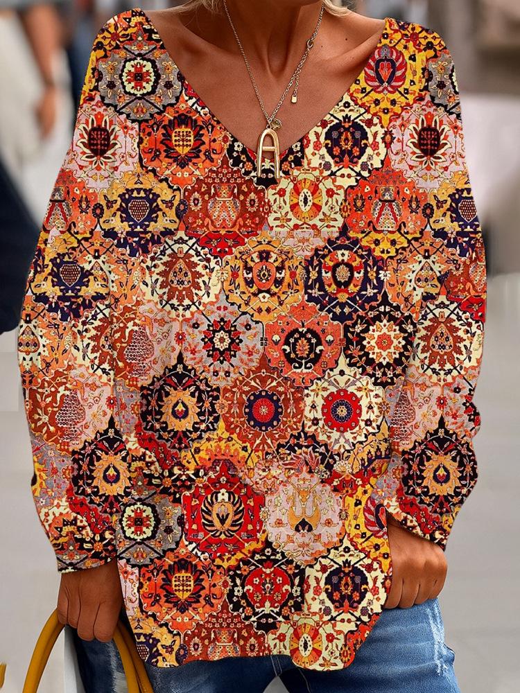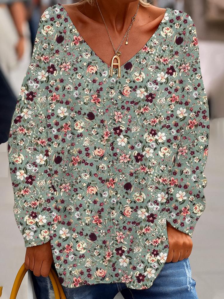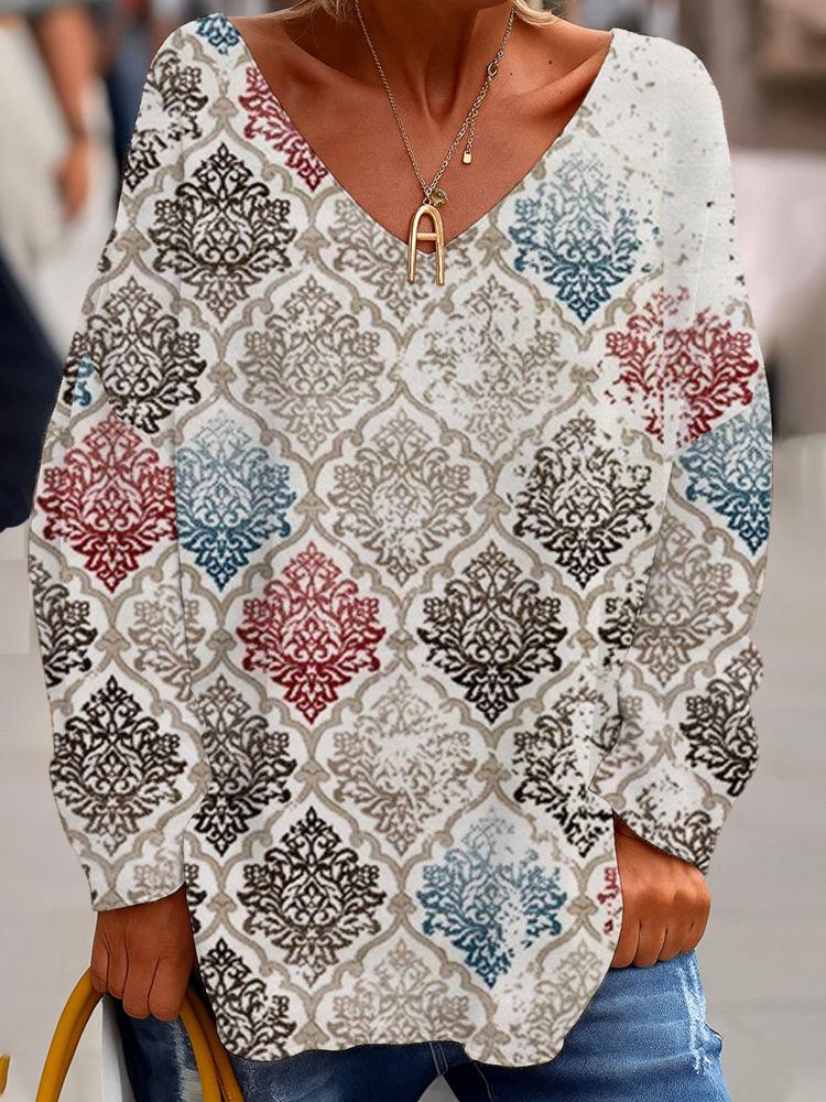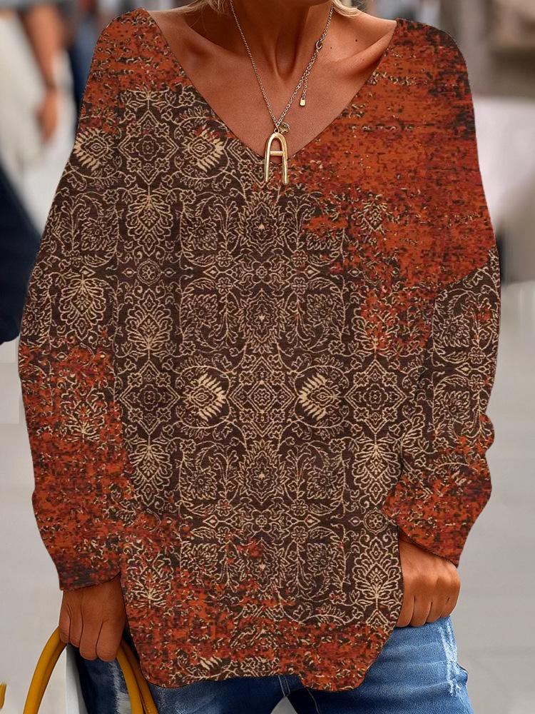 2025 Comercio Exterior Transfronterizo Nuevo Casual para Mujer Cuello en V Manga Larga Jersey Estampado Digital Top Sudadera para Dama