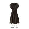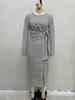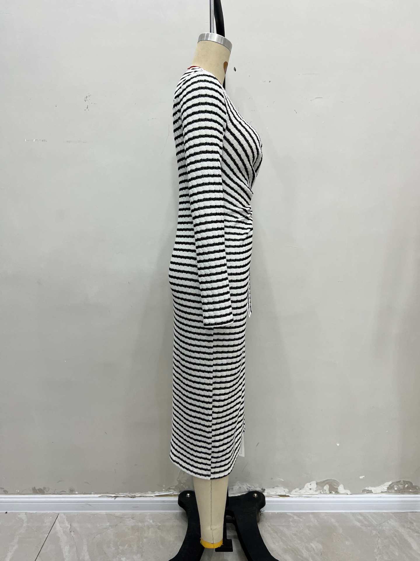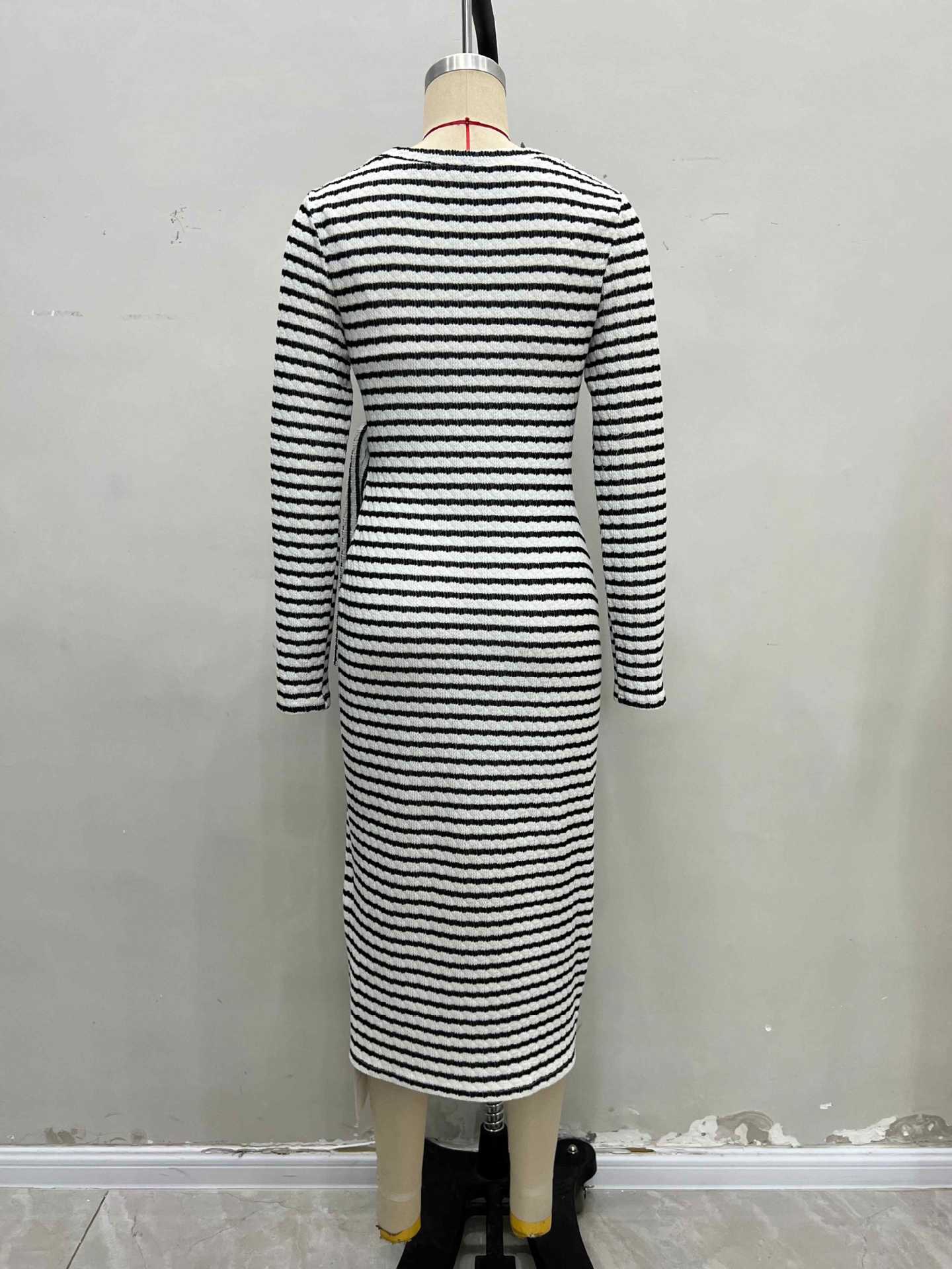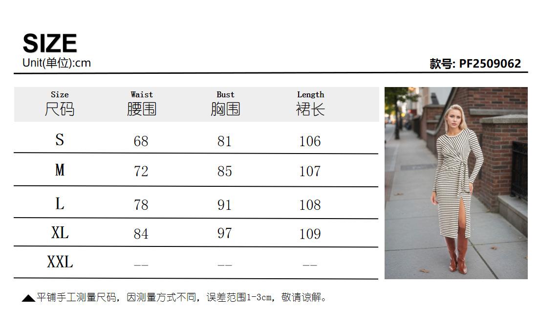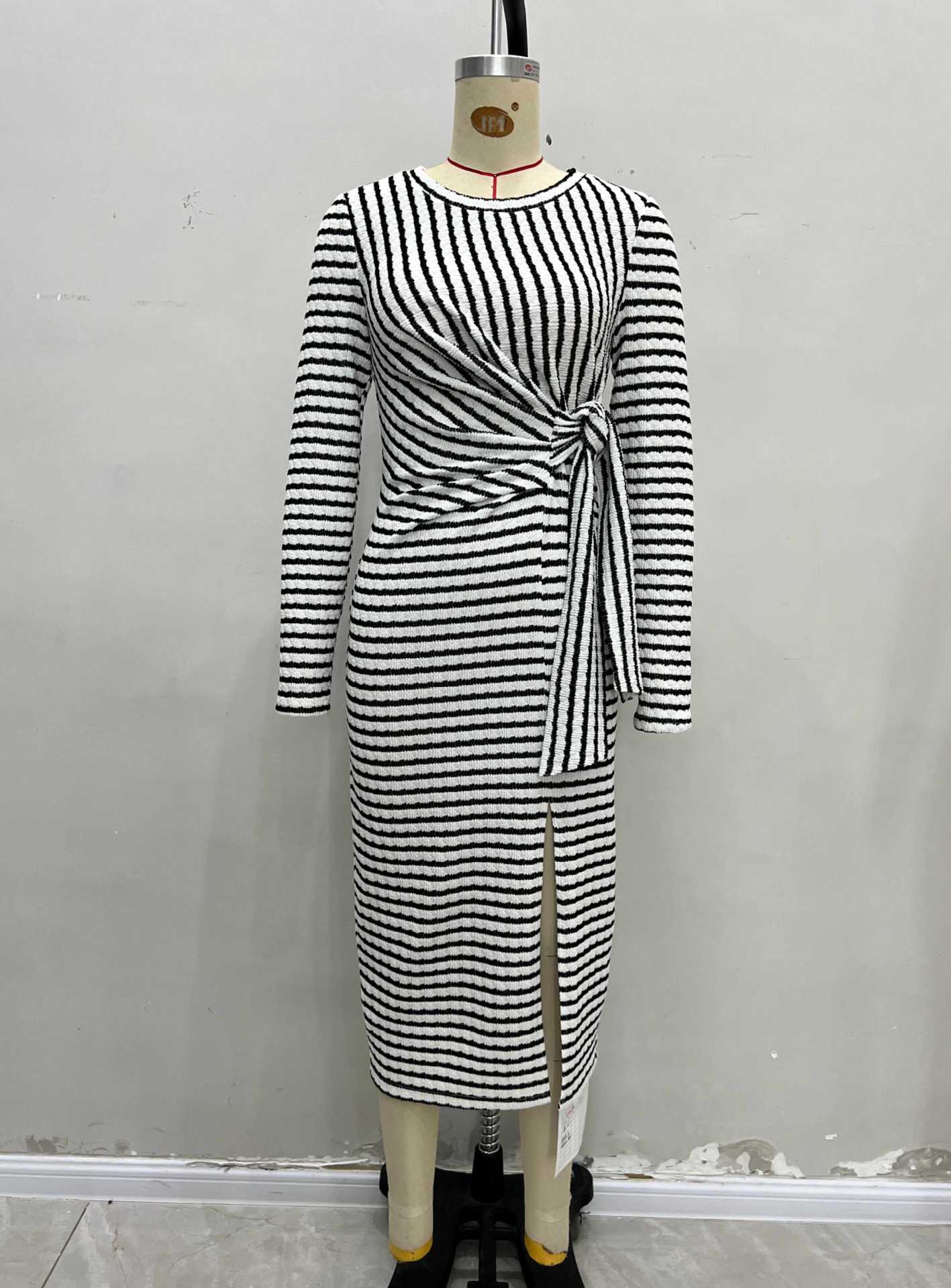 2025 Temperamento de Moda Europea y Americana Nuevo Vestido Rayado con Giro en la Cintura Adelgazante con Abertura y Cuello Redondo