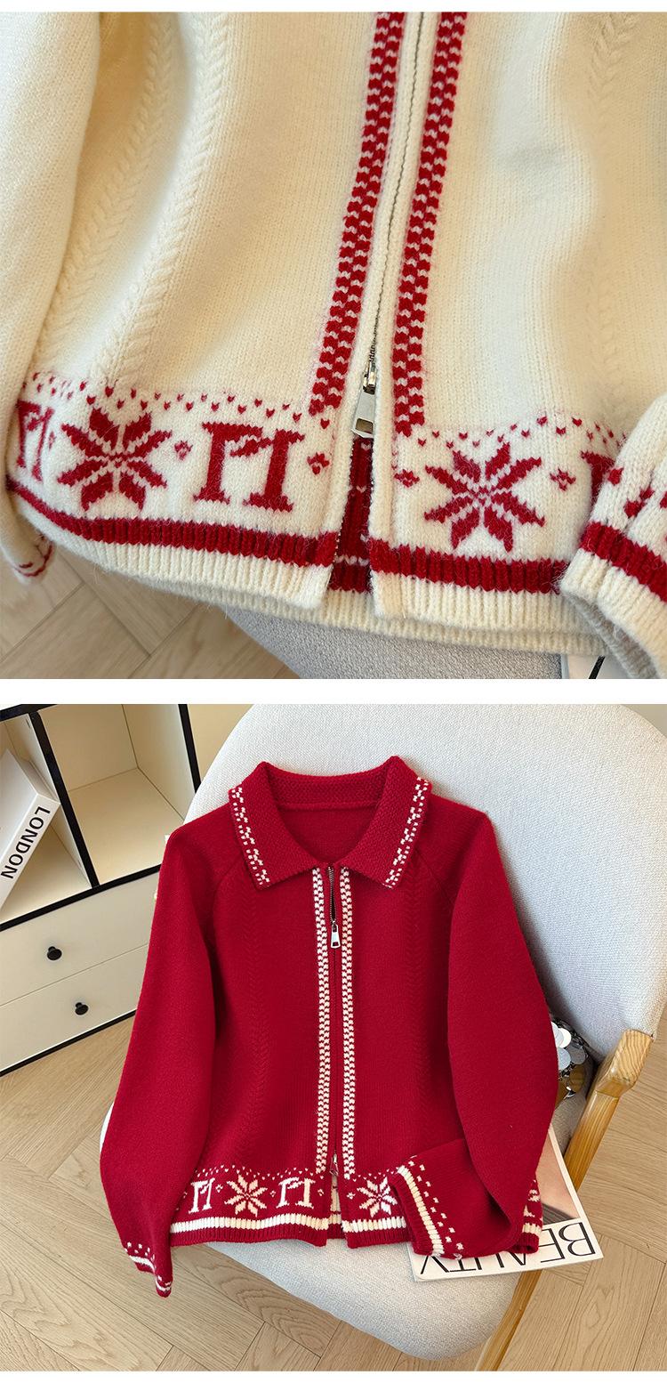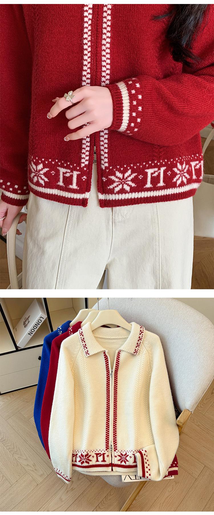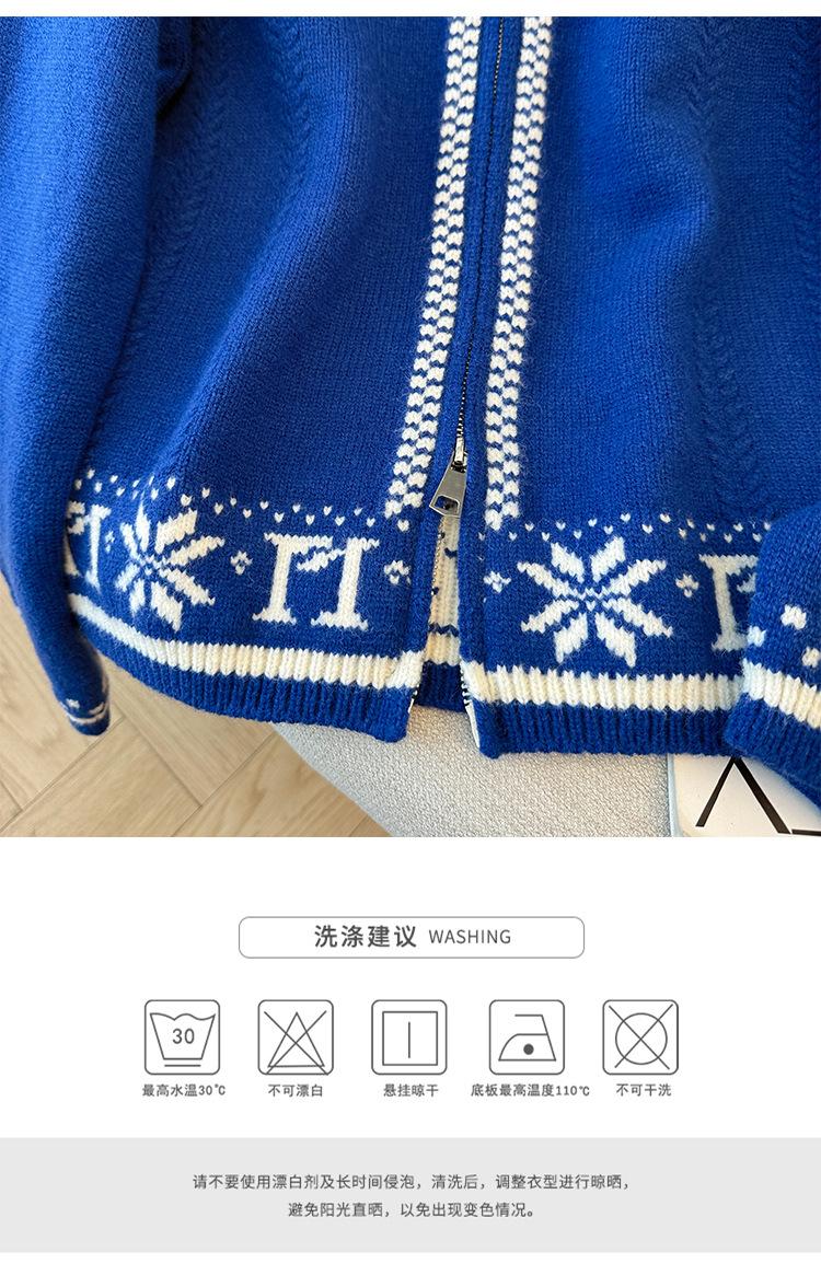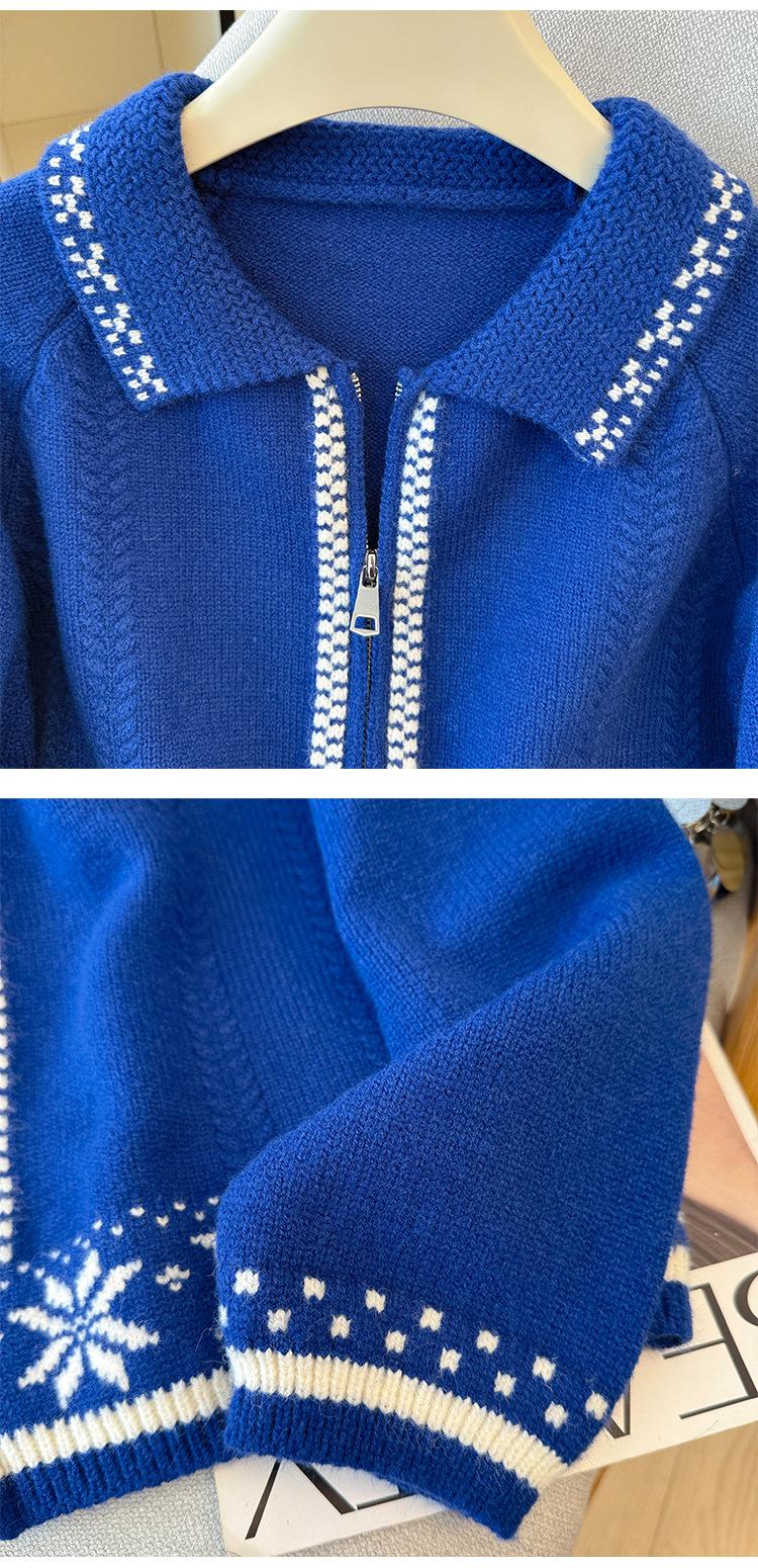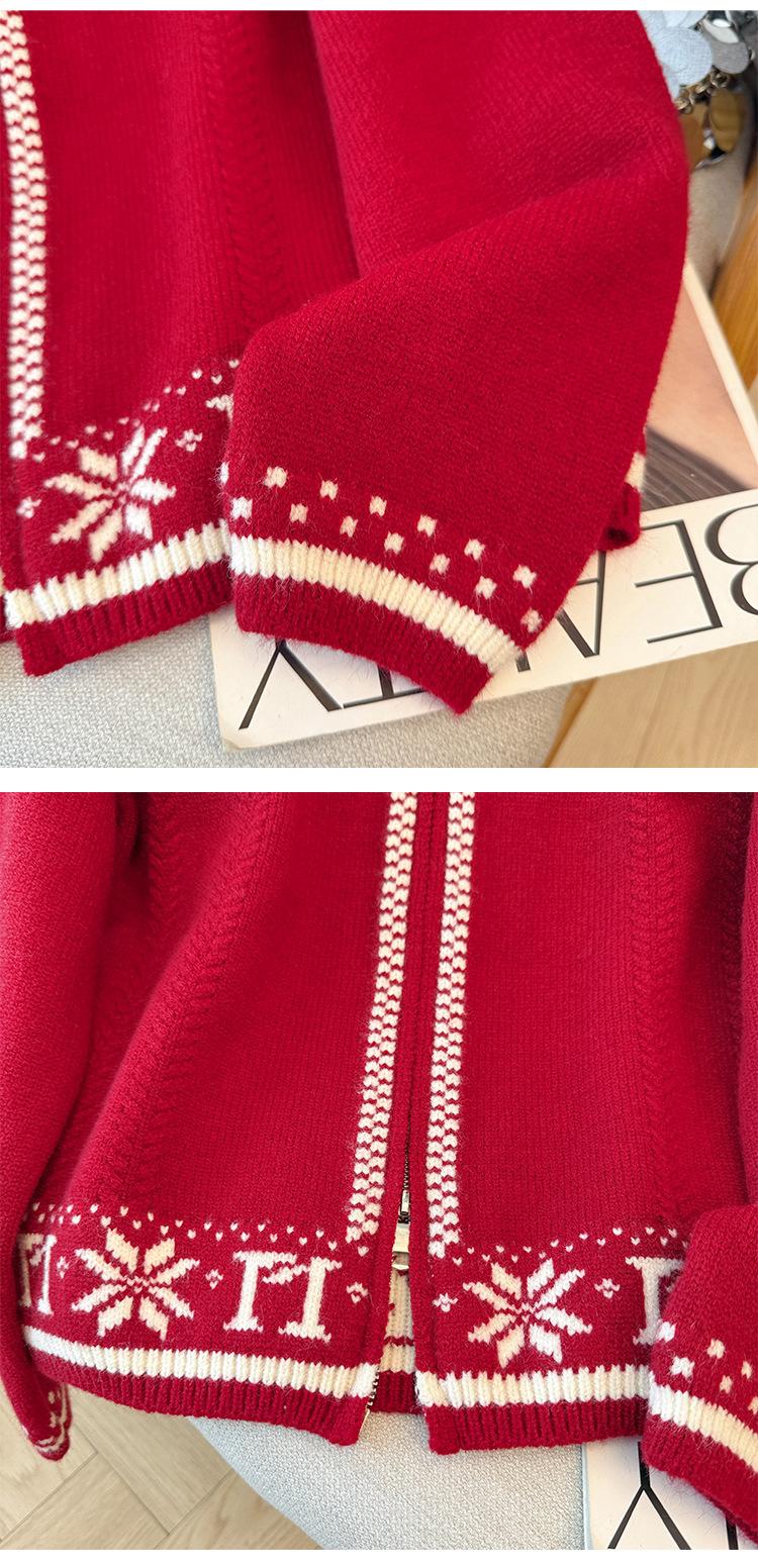 Jacquard de Copo de Nieve Color Block Cuello Redondo Tejido de Punto para Mujer Otoño/Invierno Cárdigan de Cremallera de Gama Alta Abrigo Suéter Top