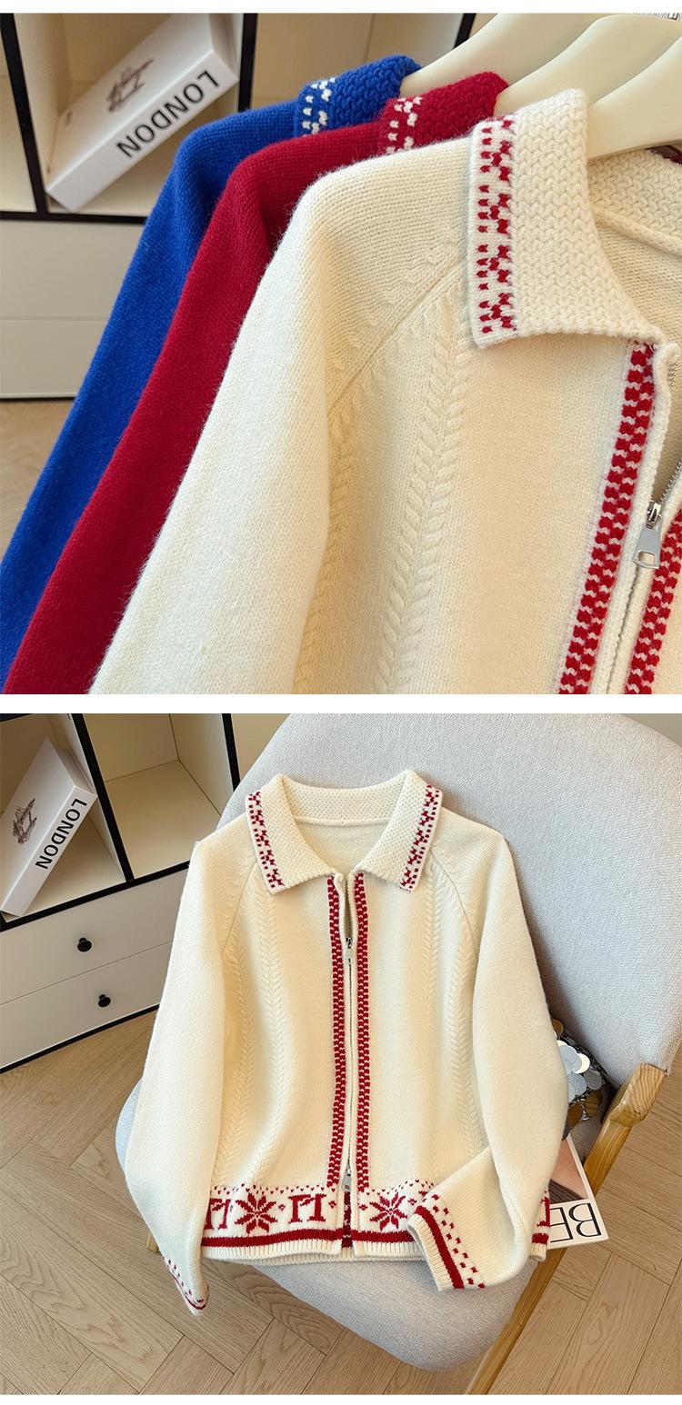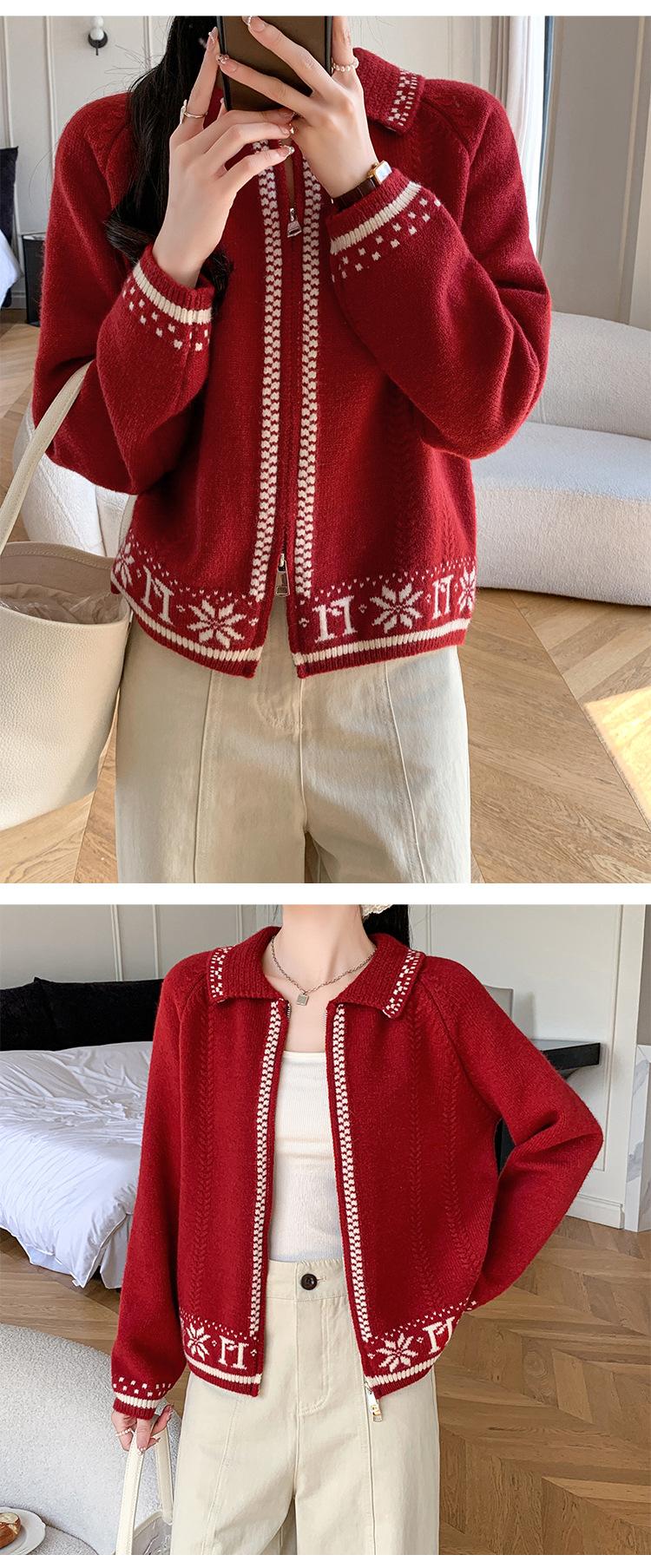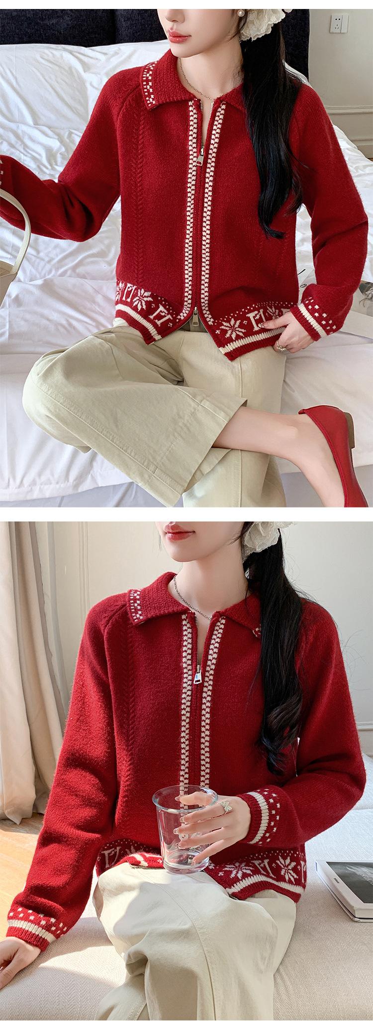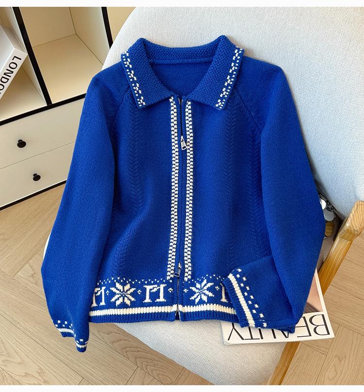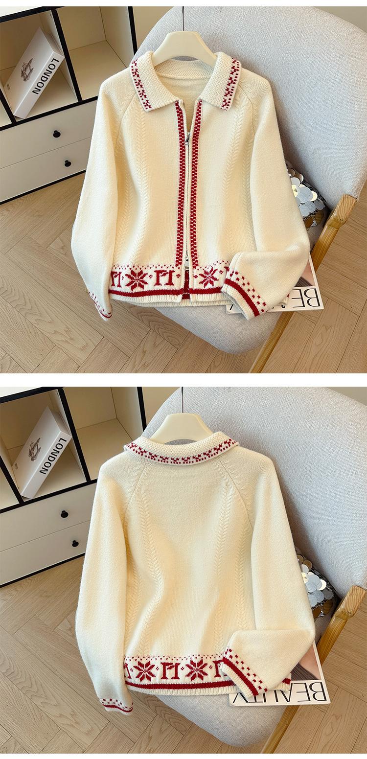 Jacquard de Copo de Nieve Color Block Cuello Redondo Tejido de Punto para Mujer Otoño/Invierno Cárdigan de Cremallera de Gama Alta Abrigo Suéter Top