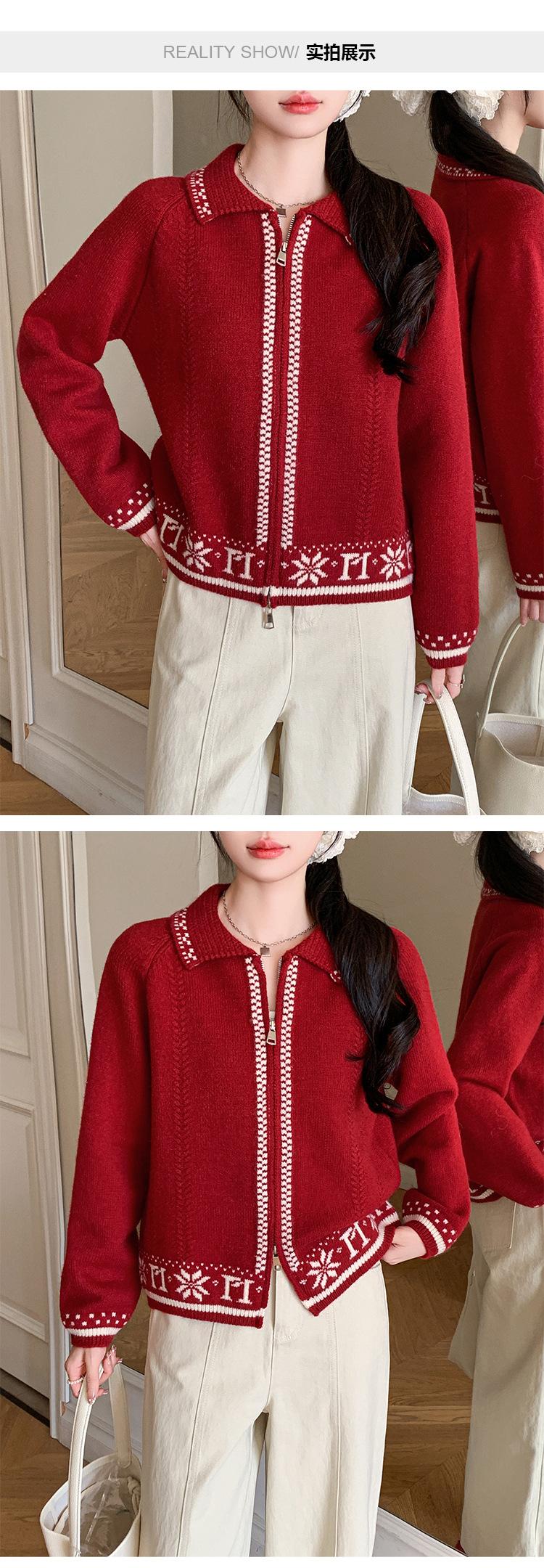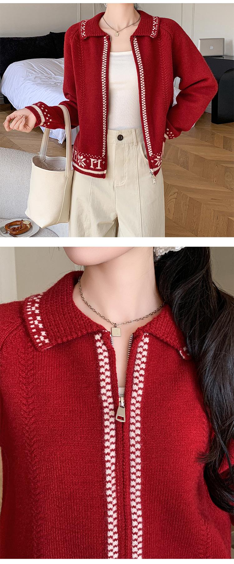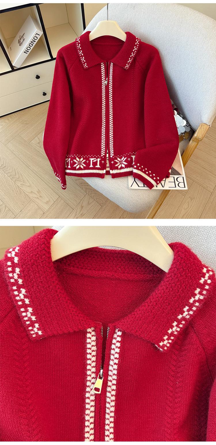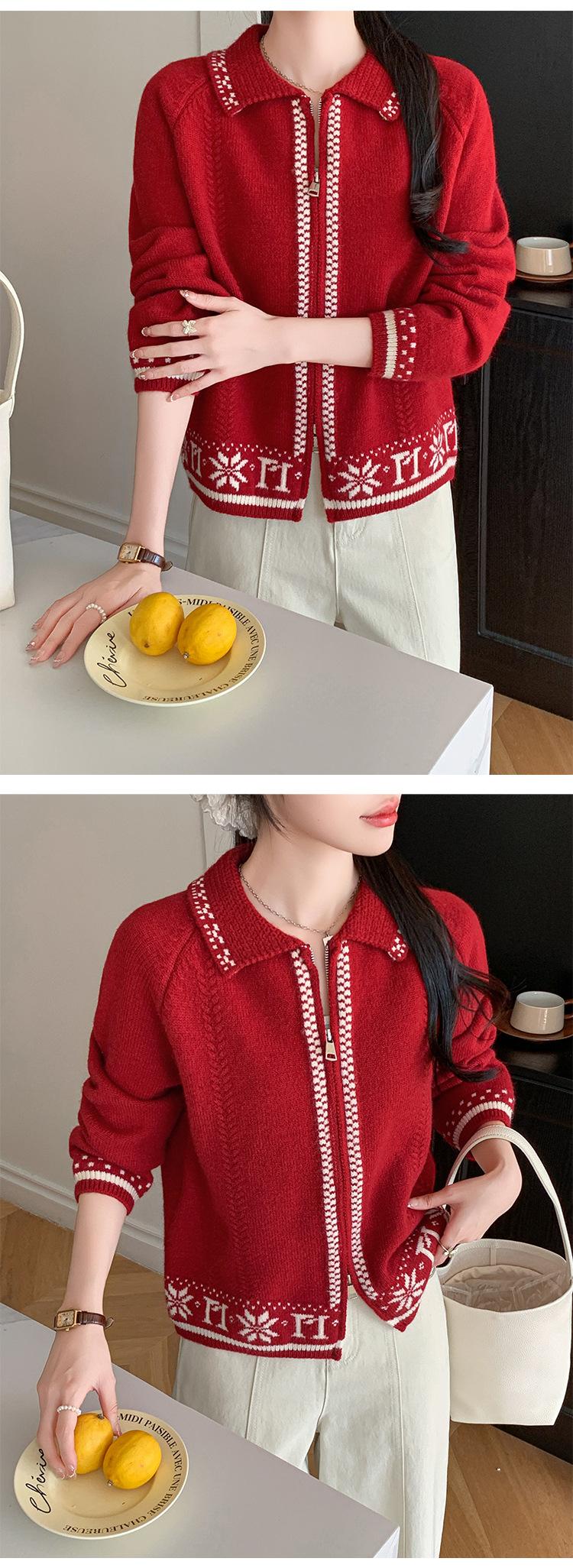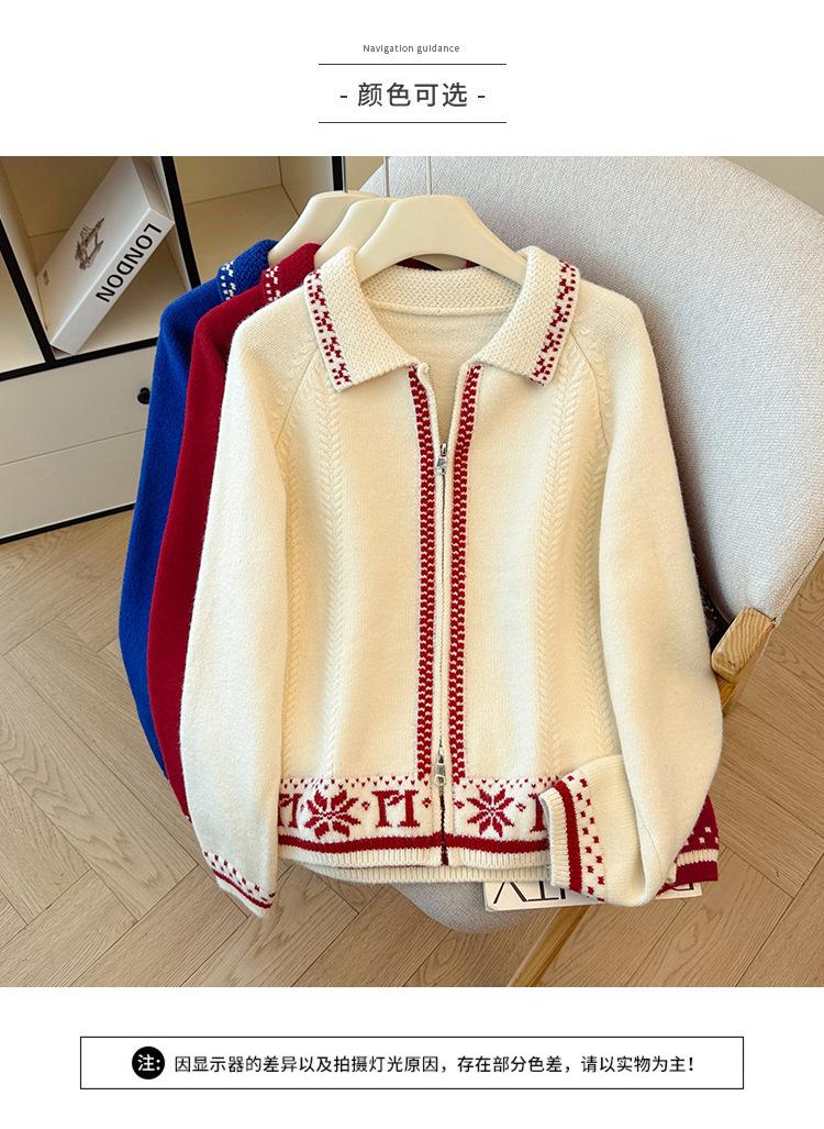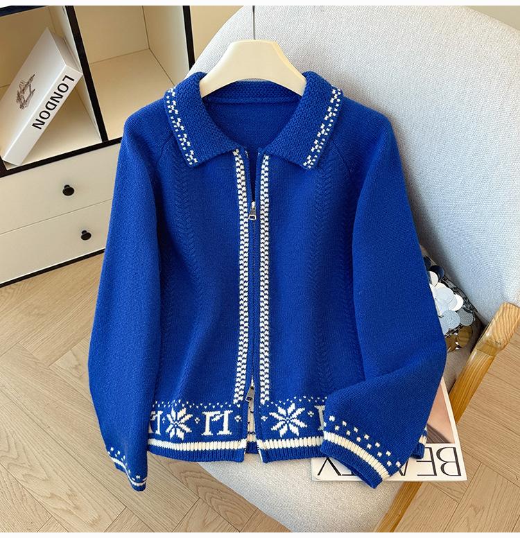 Jacquard de Copo de Nieve Color Block Cuello Redondo Tejido de Punto para Mujer Otoño/Invierno Cárdigan de Cremallera de Gama Alta Abrigo Suéter Top