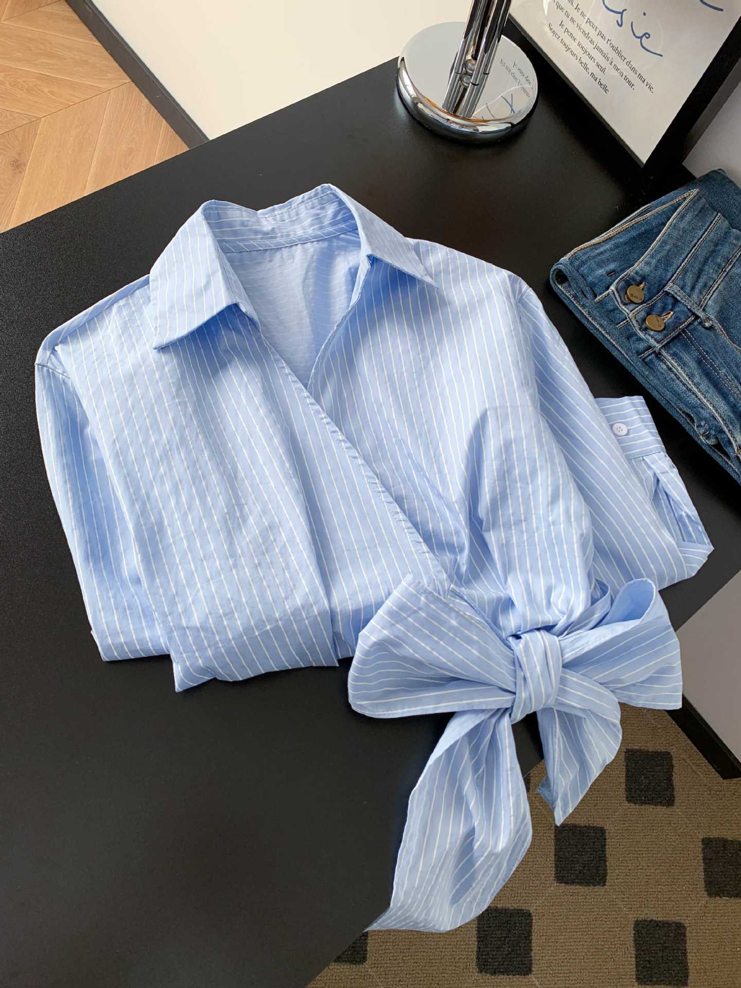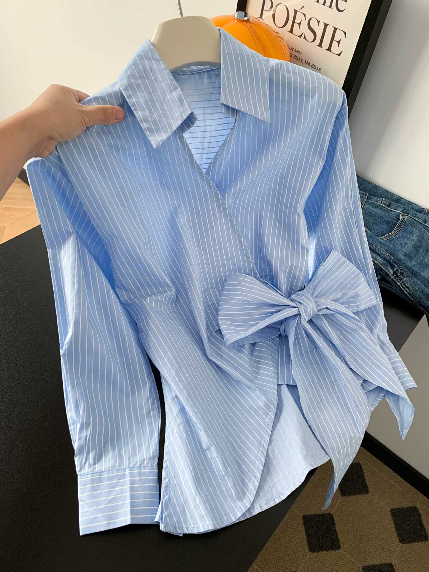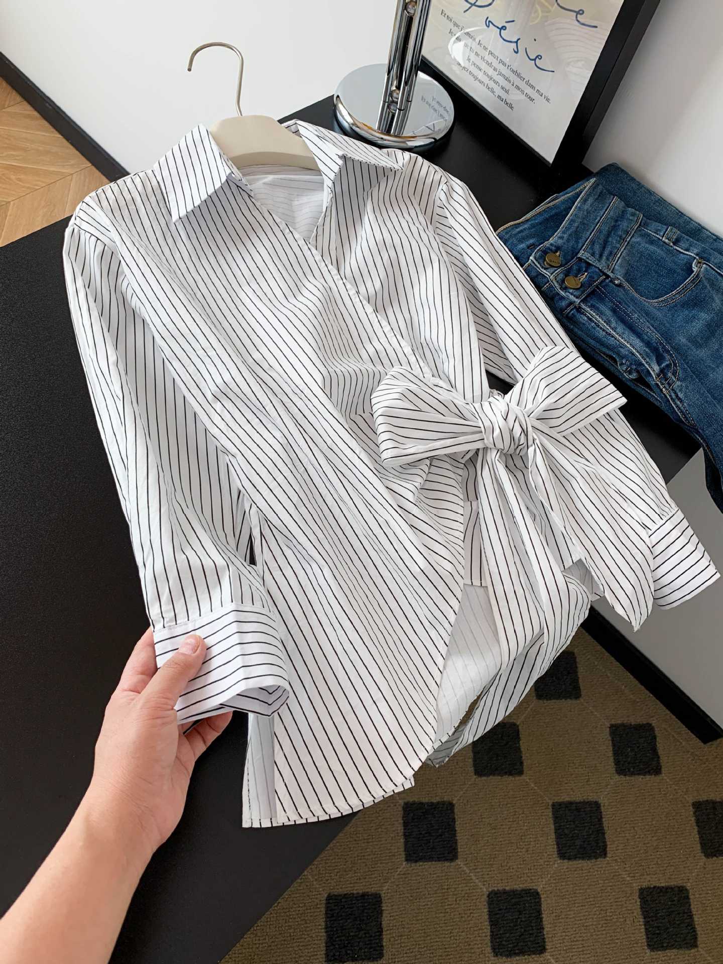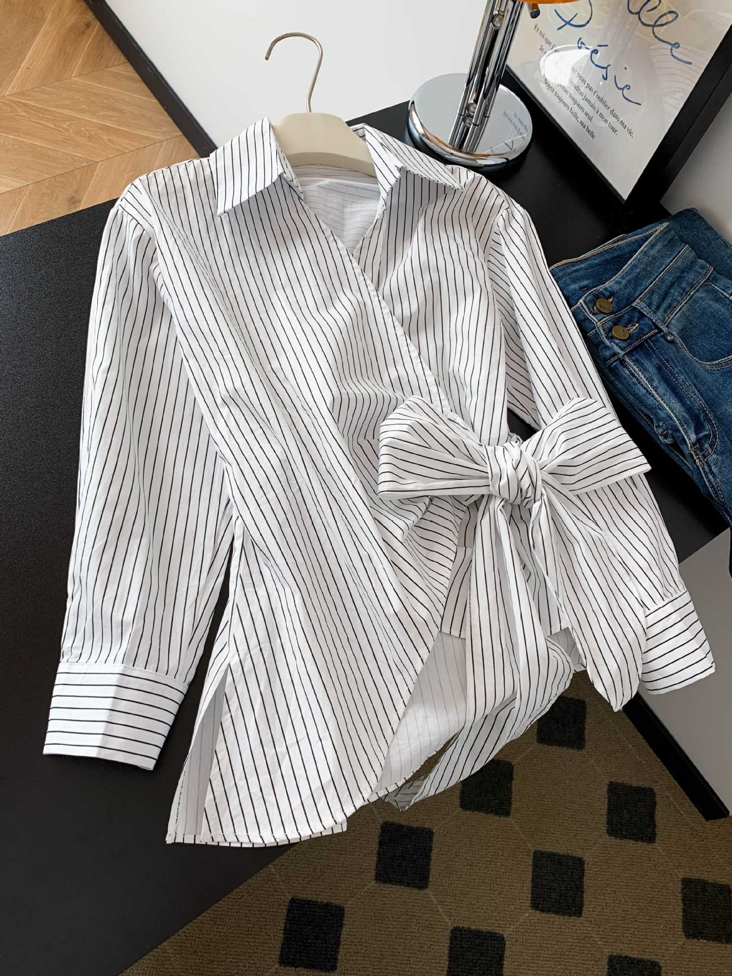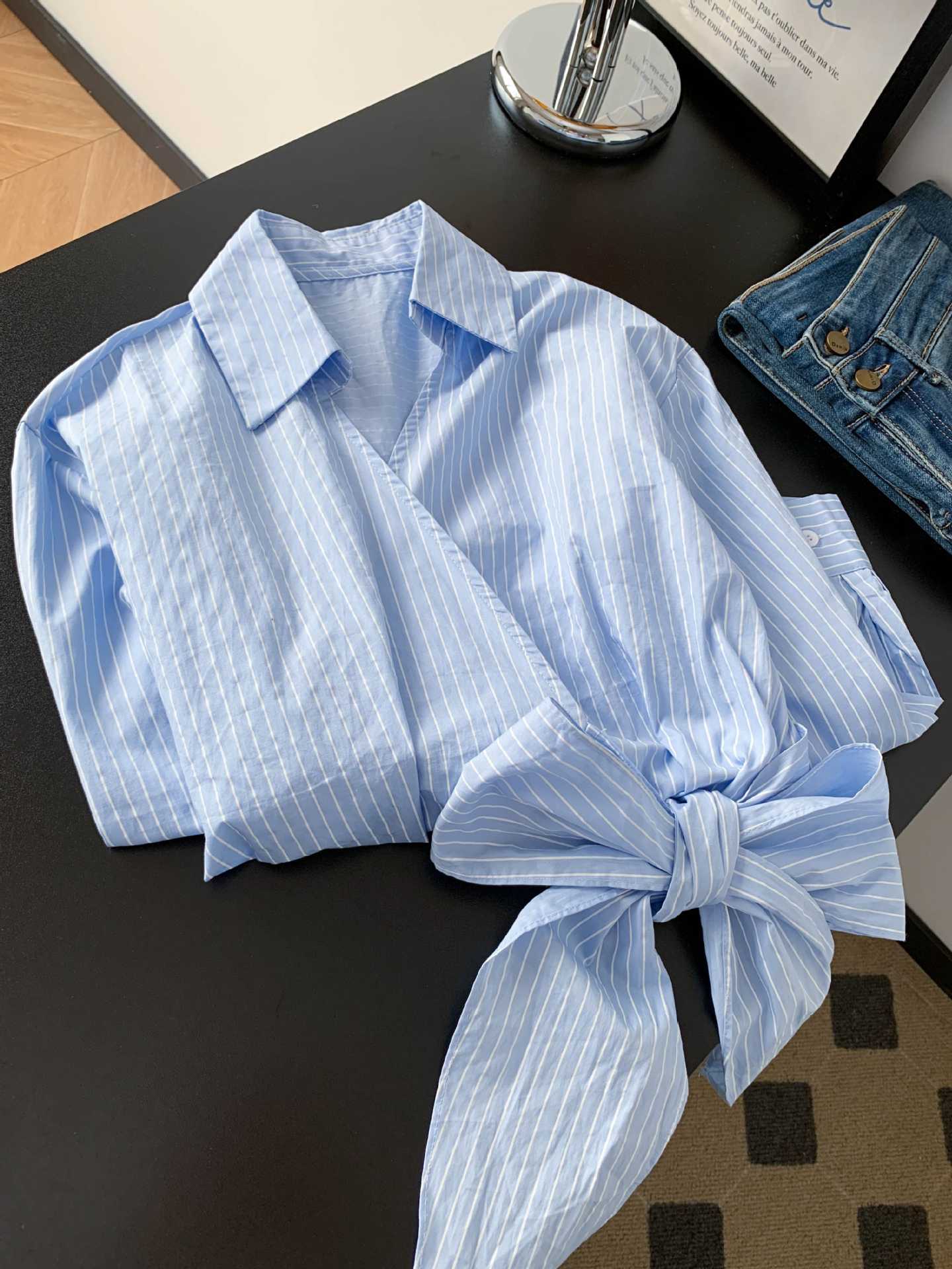 Foto real estilo coreano solapa irregular anudado cruzado camisa mujer otoño 2025 nueva camisa de damas a rayas ceñida a la cintura