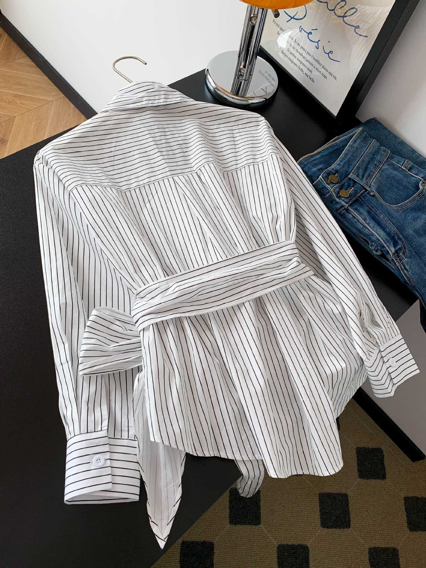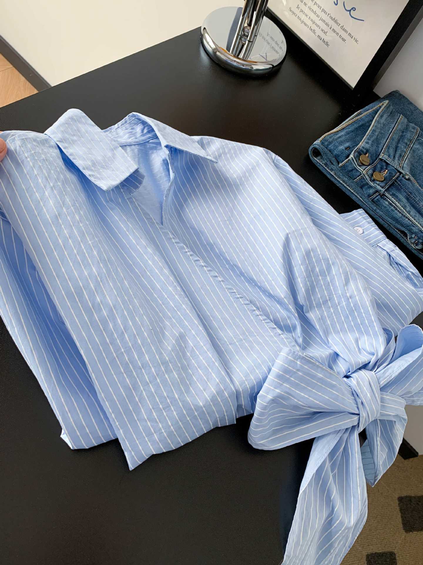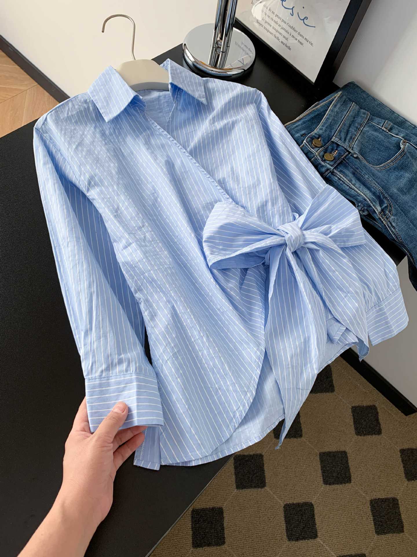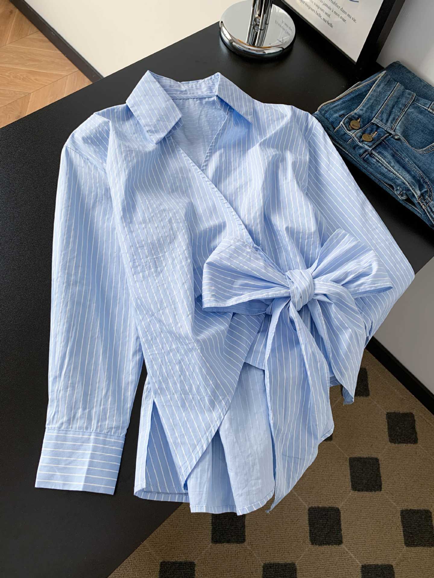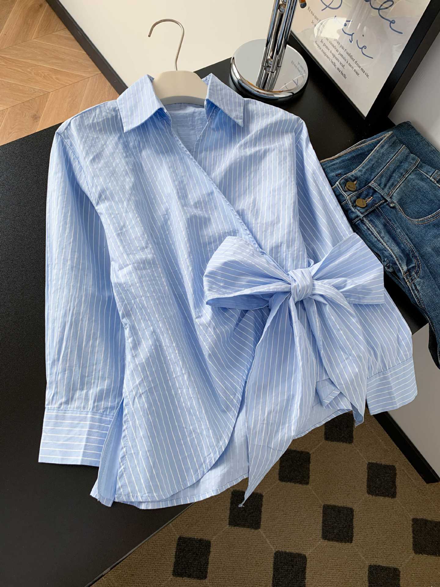 Foto real estilo coreano solapa irregular anudado cruzado camisa mujer otoño 2025 nueva camisa de damas a rayas ceñida a la cintura