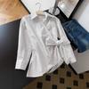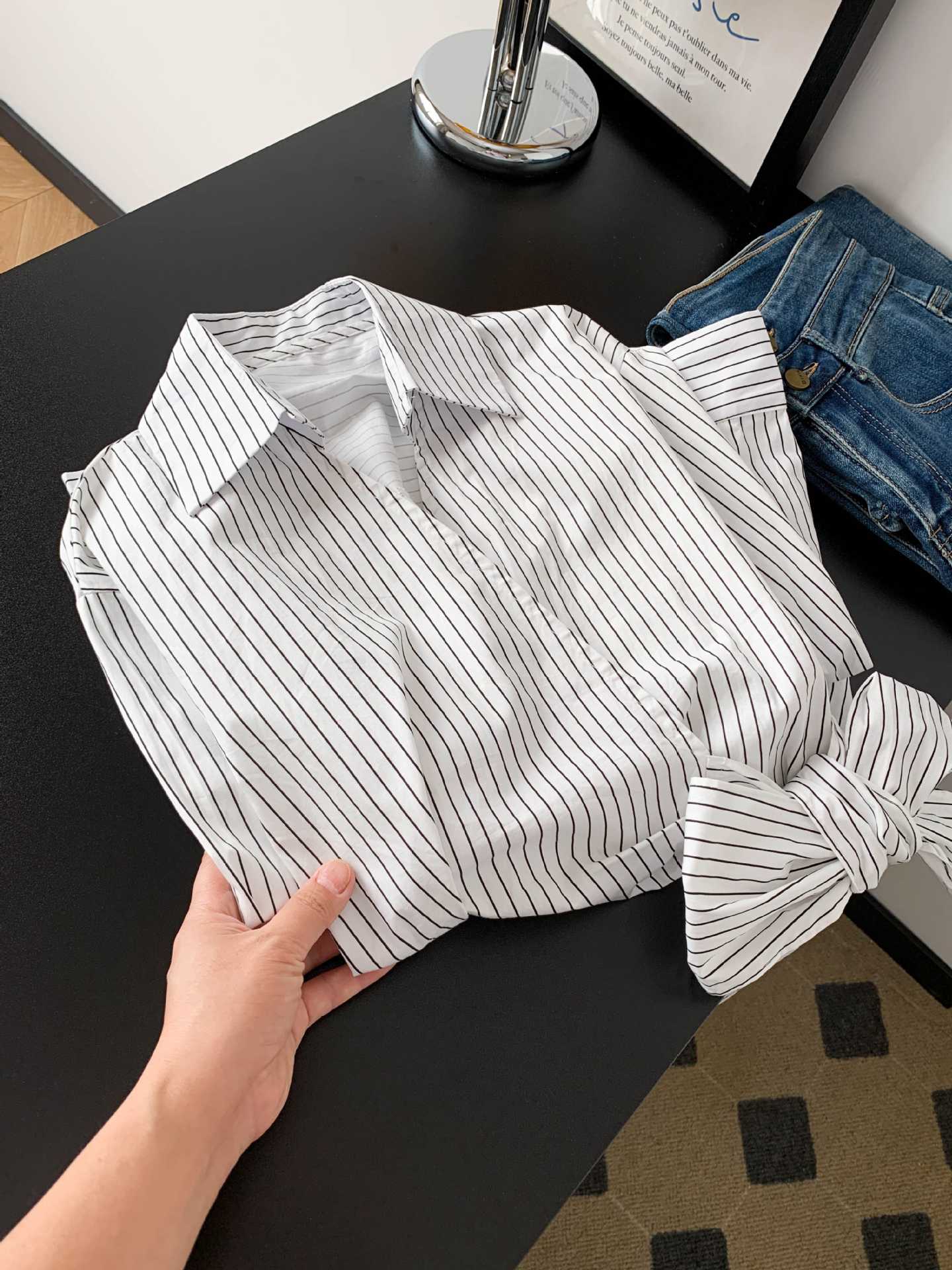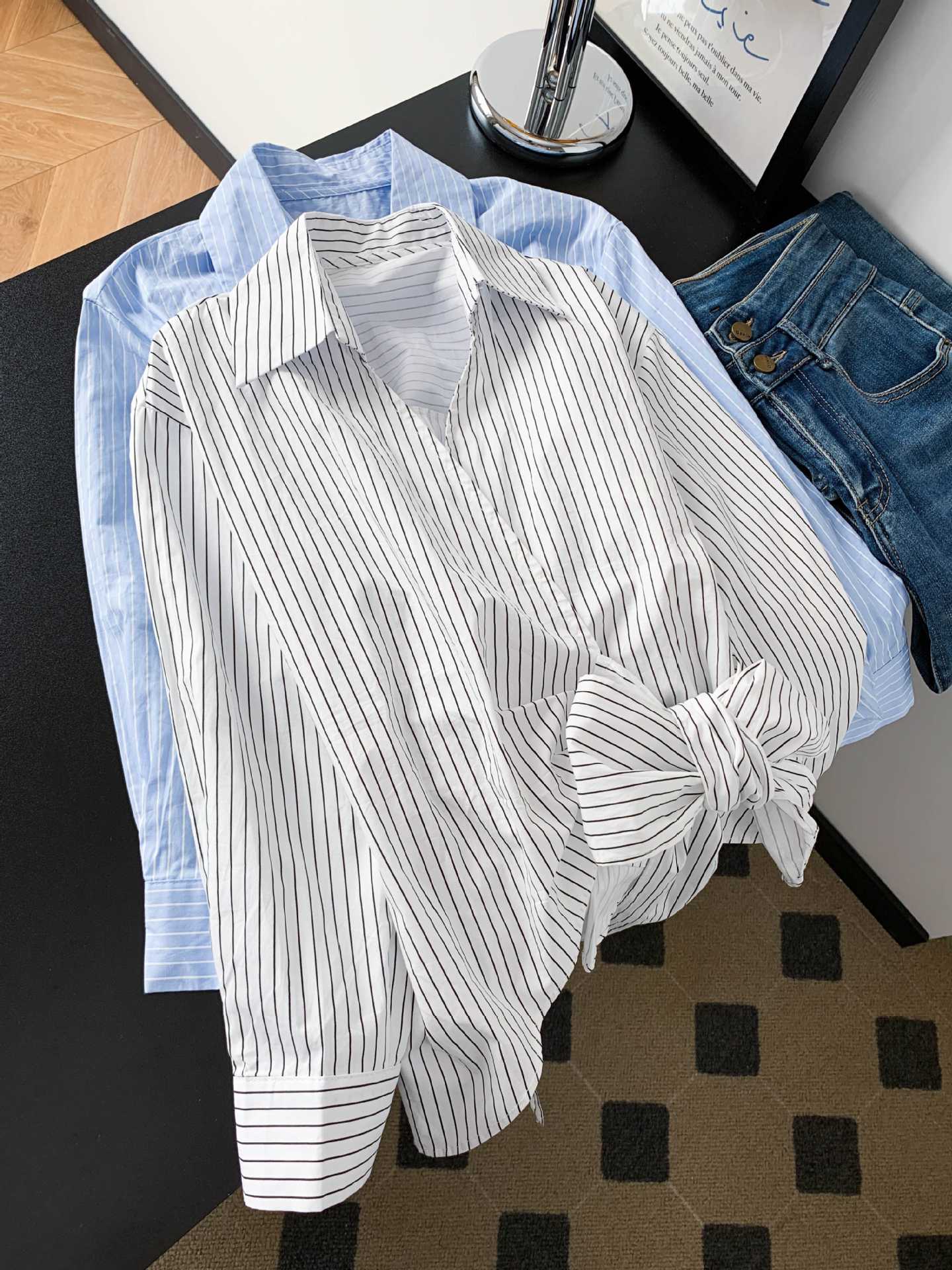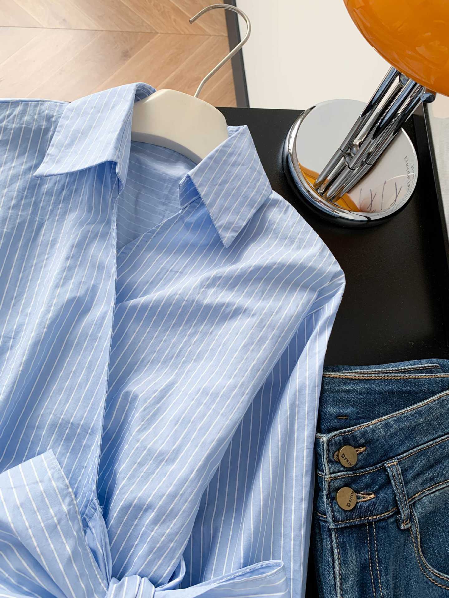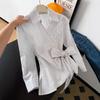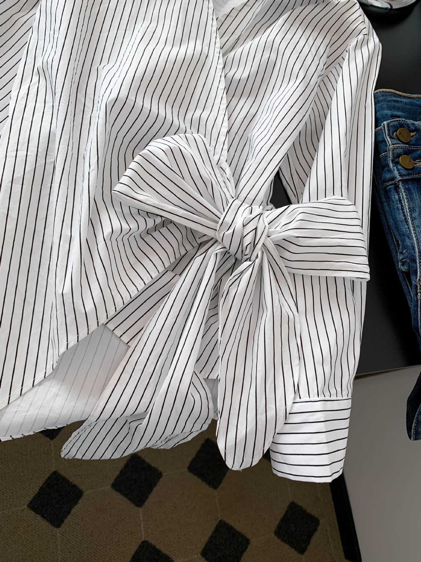 Foto real estilo coreano solapa irregular anudado cruzado camisa mujer otoño 2025 nueva camisa de damas a rayas ceñida a la cintura