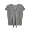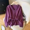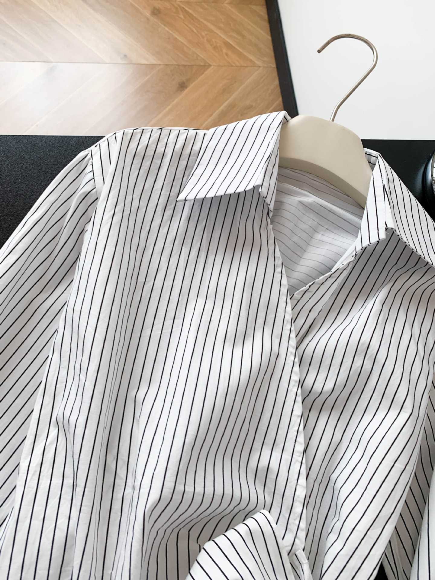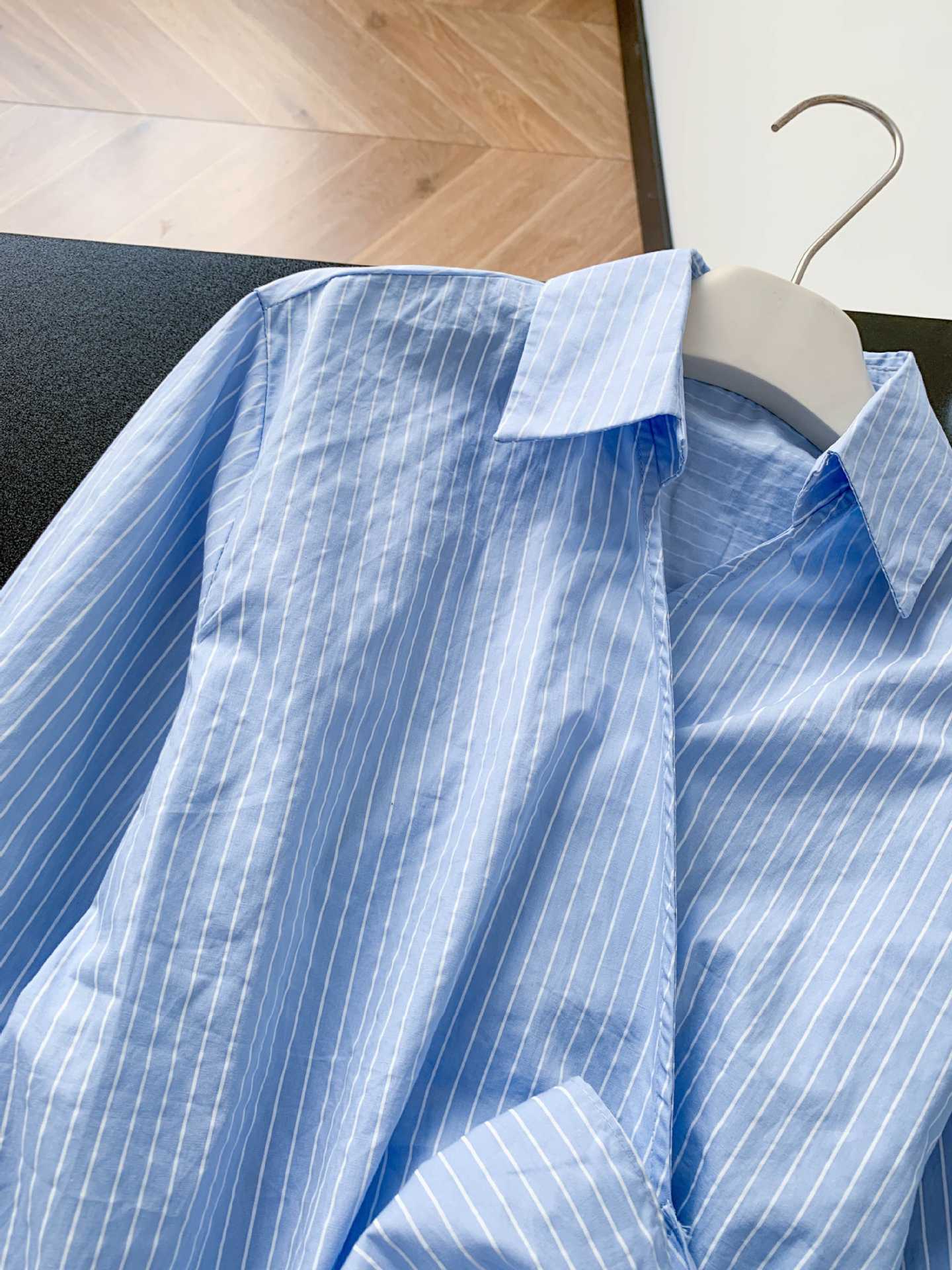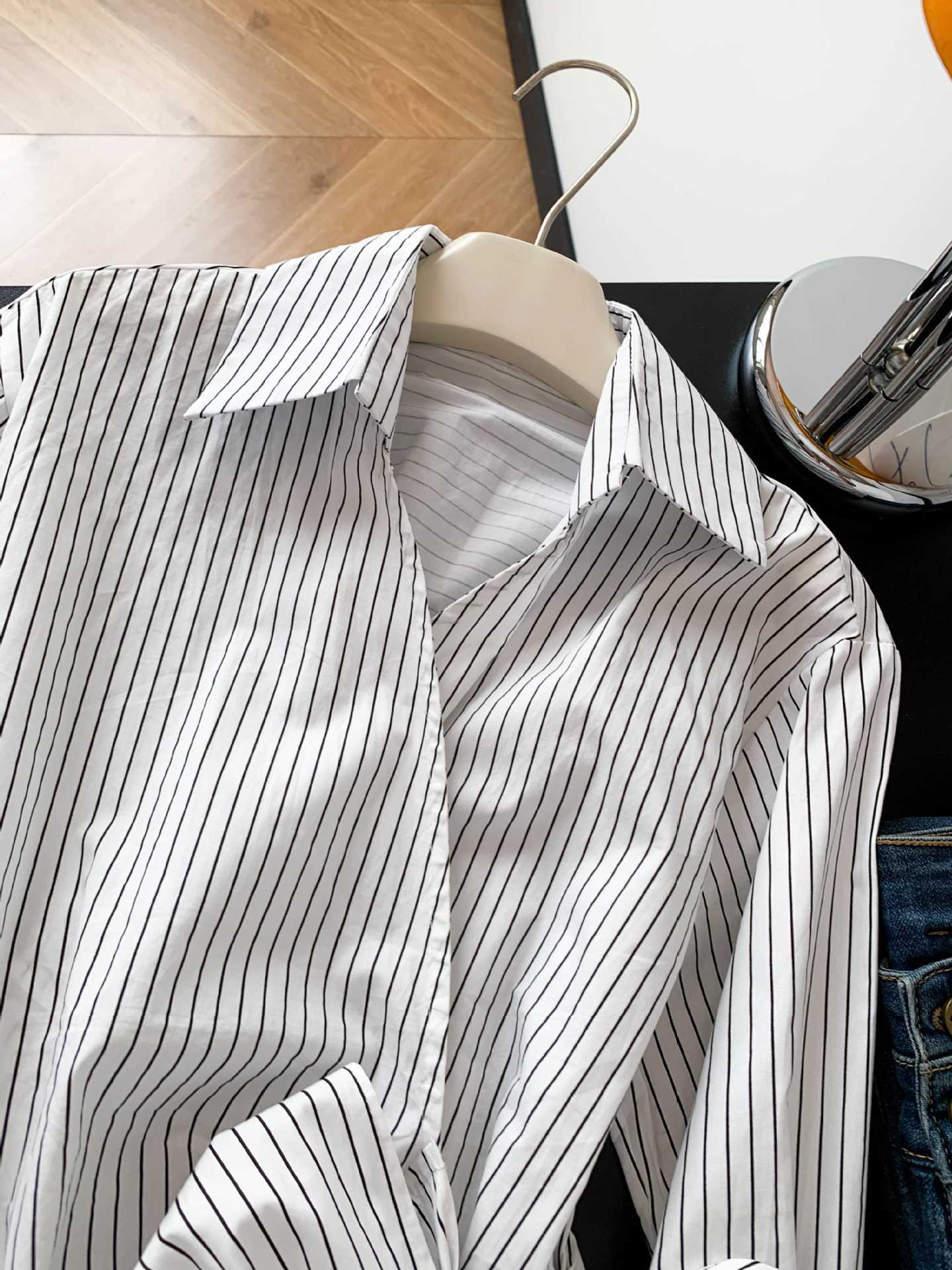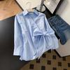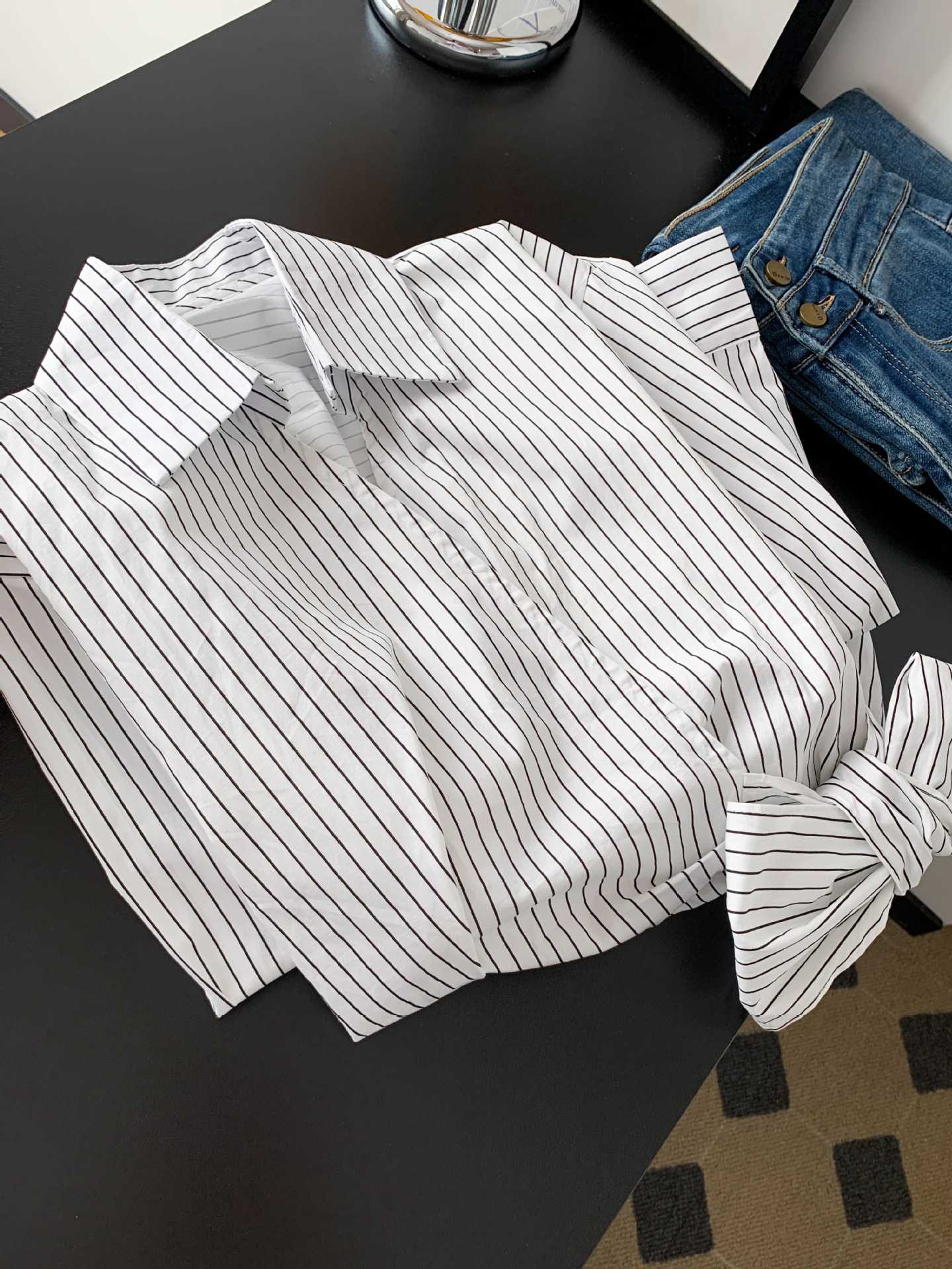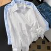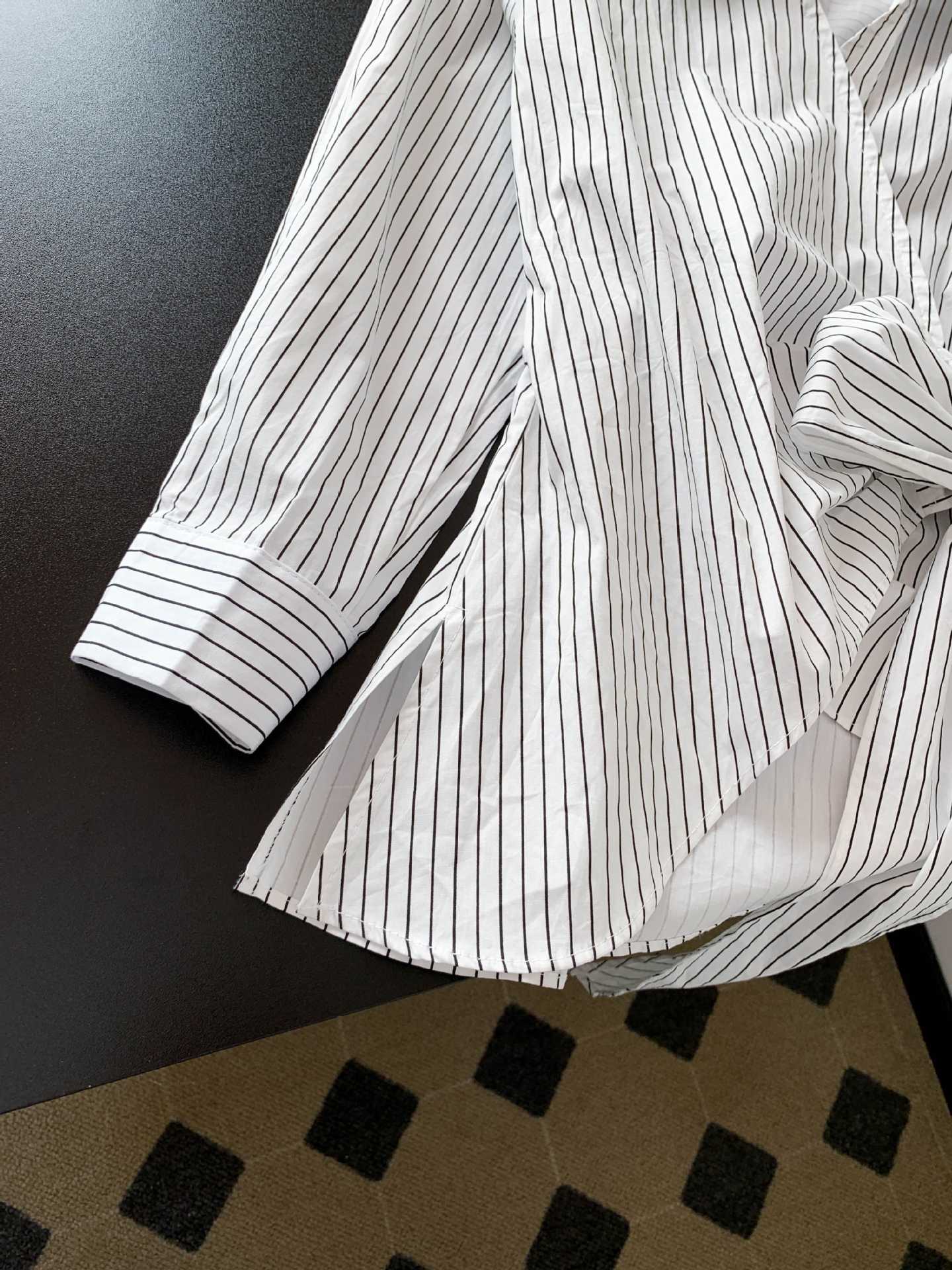 Foto real estilo coreano solapa irregular anudado cruzado camisa mujer otoño 2025 nueva camisa de damas a rayas ceñida a la cintura