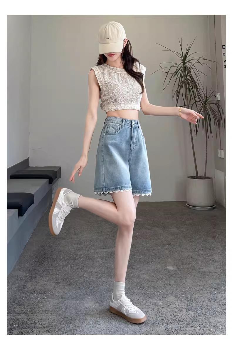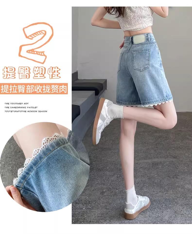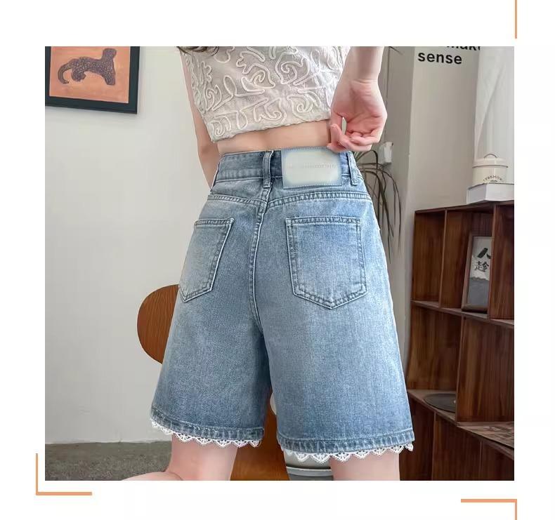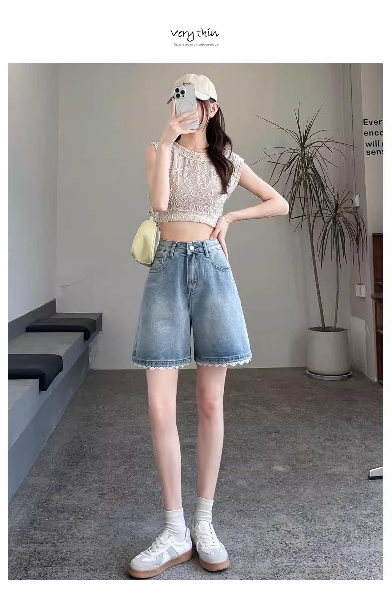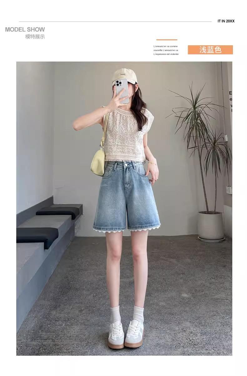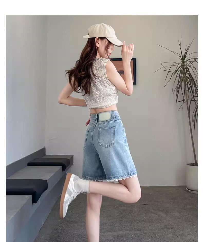 Jeans Retro de Talla Grande para Mujer 2025 Nuevo Verano Borde de Encaje Pantalones Cinco Puntos mm Gordita Aspecto Adelgazante Shorts de Pierna Ancha
