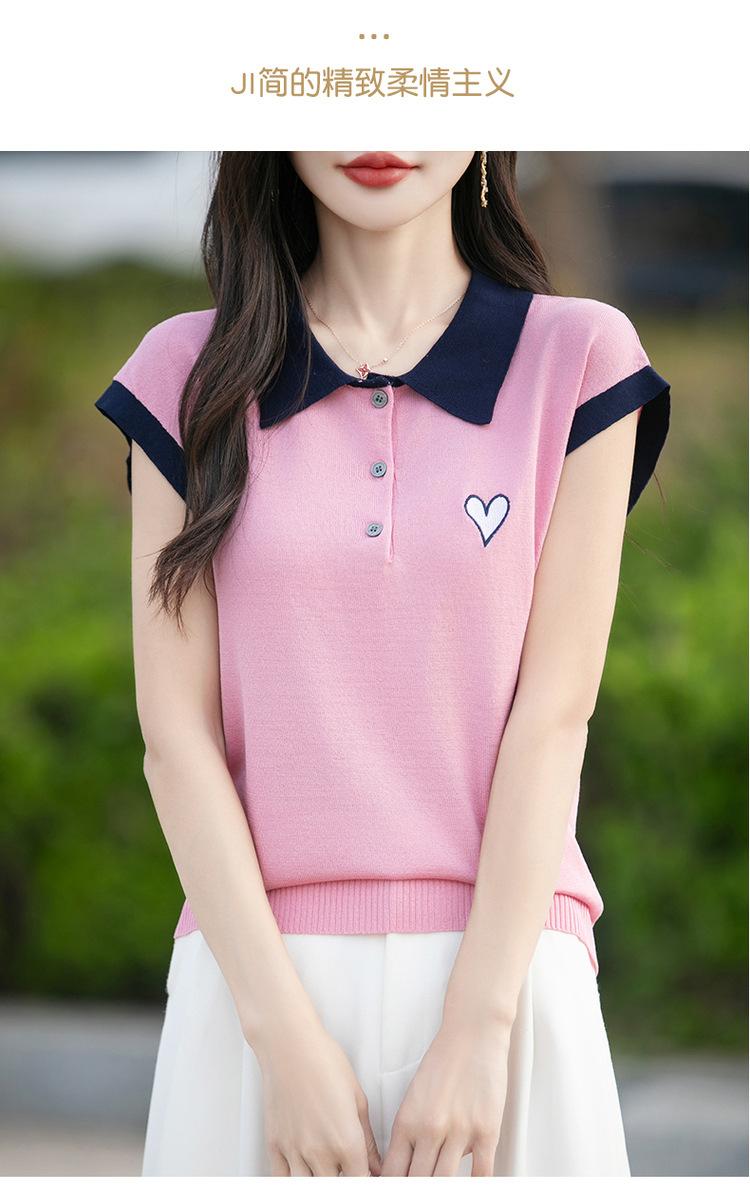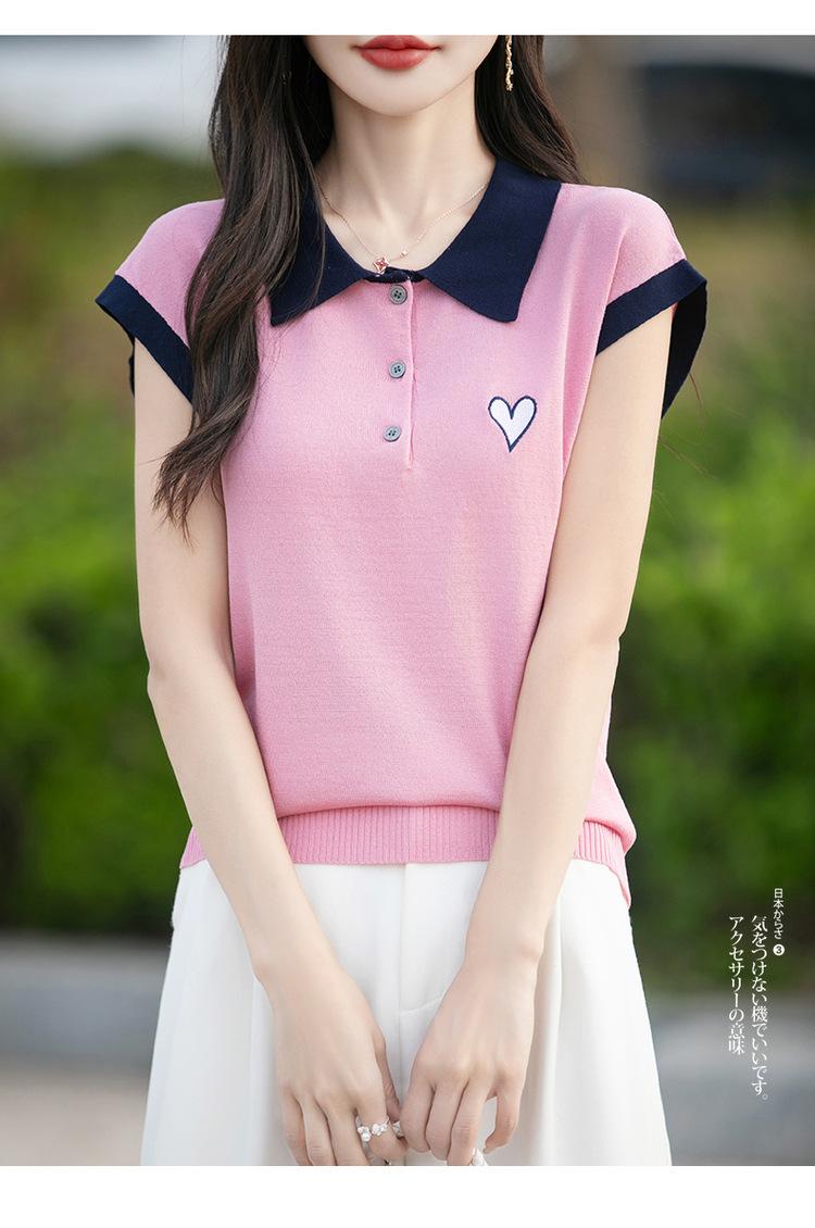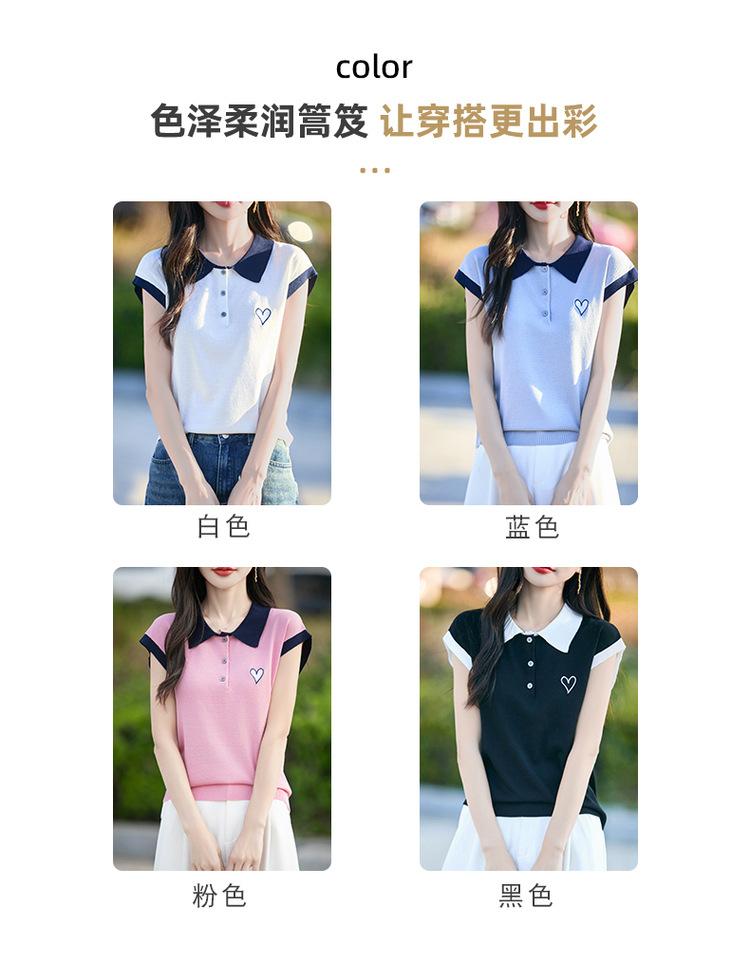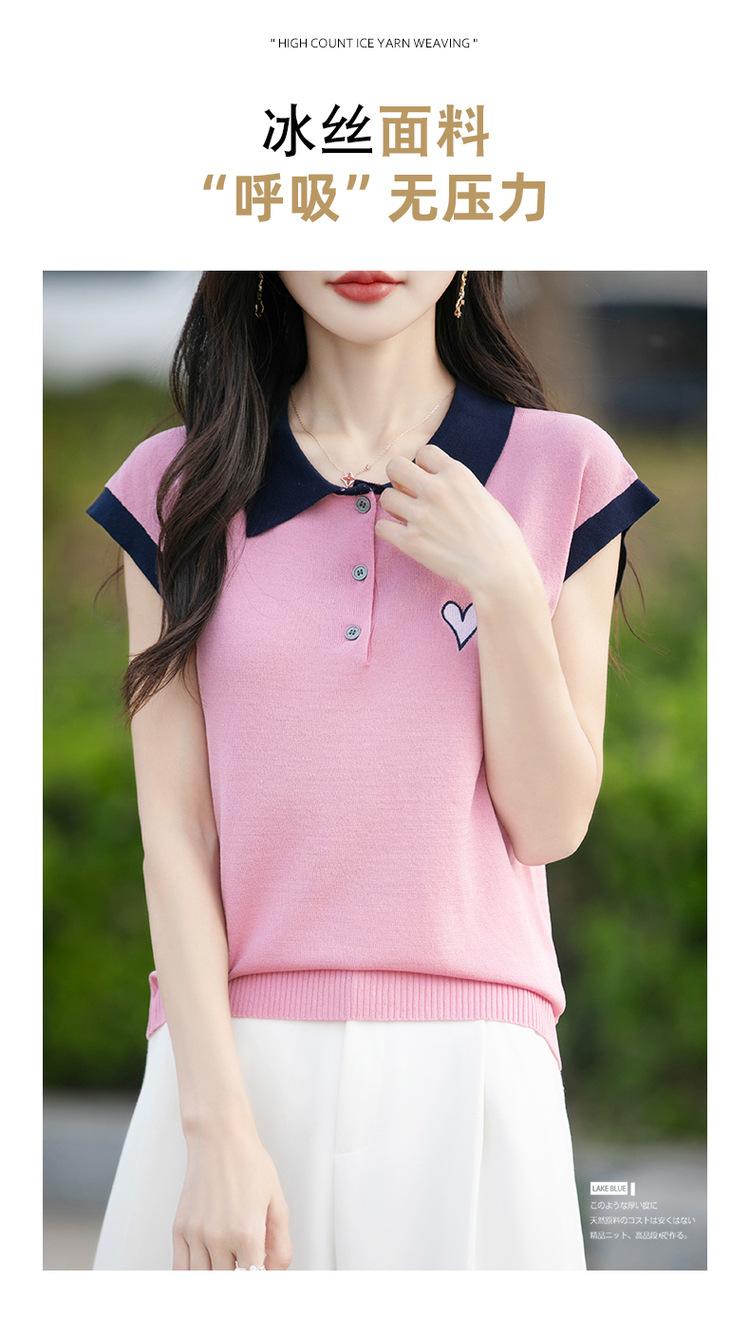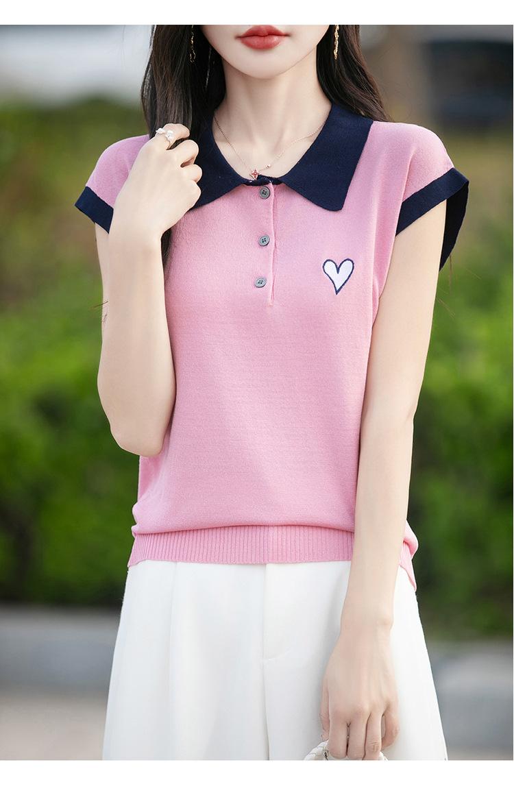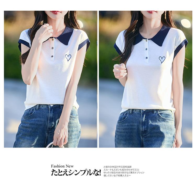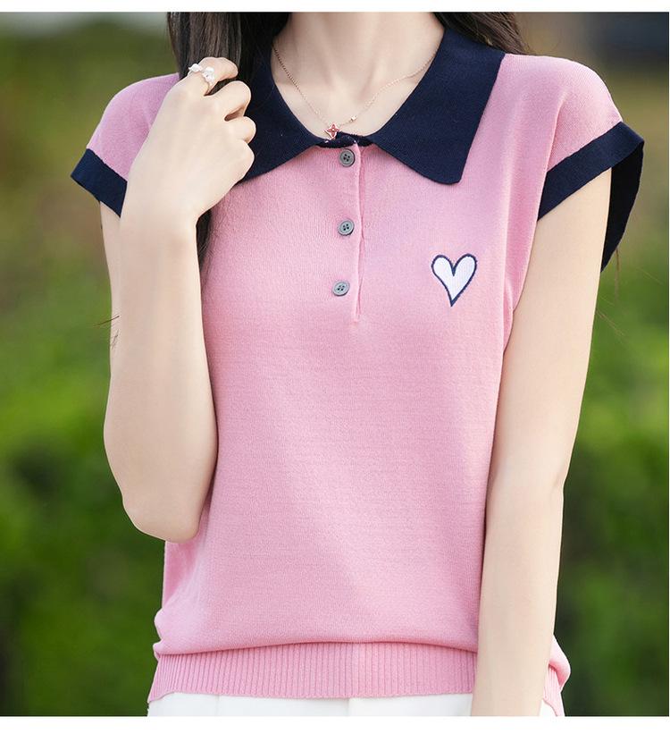 2025 Primavera y Verano Nuevo Tejido de Punto de Seda de Hielo con Cuello Polo Camiseta de Manga Corta para Mujer Combinación de Colores Corazón Holgada Top Jersey