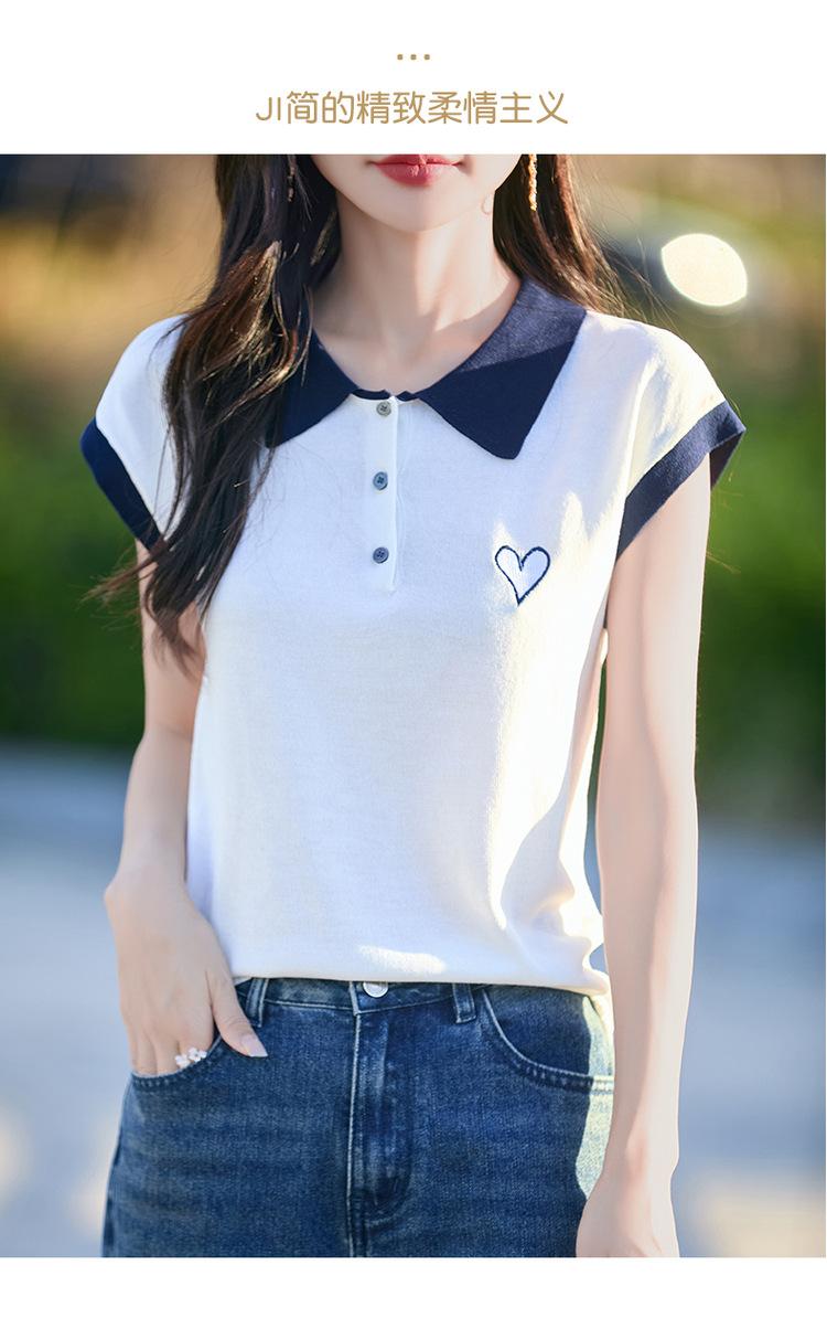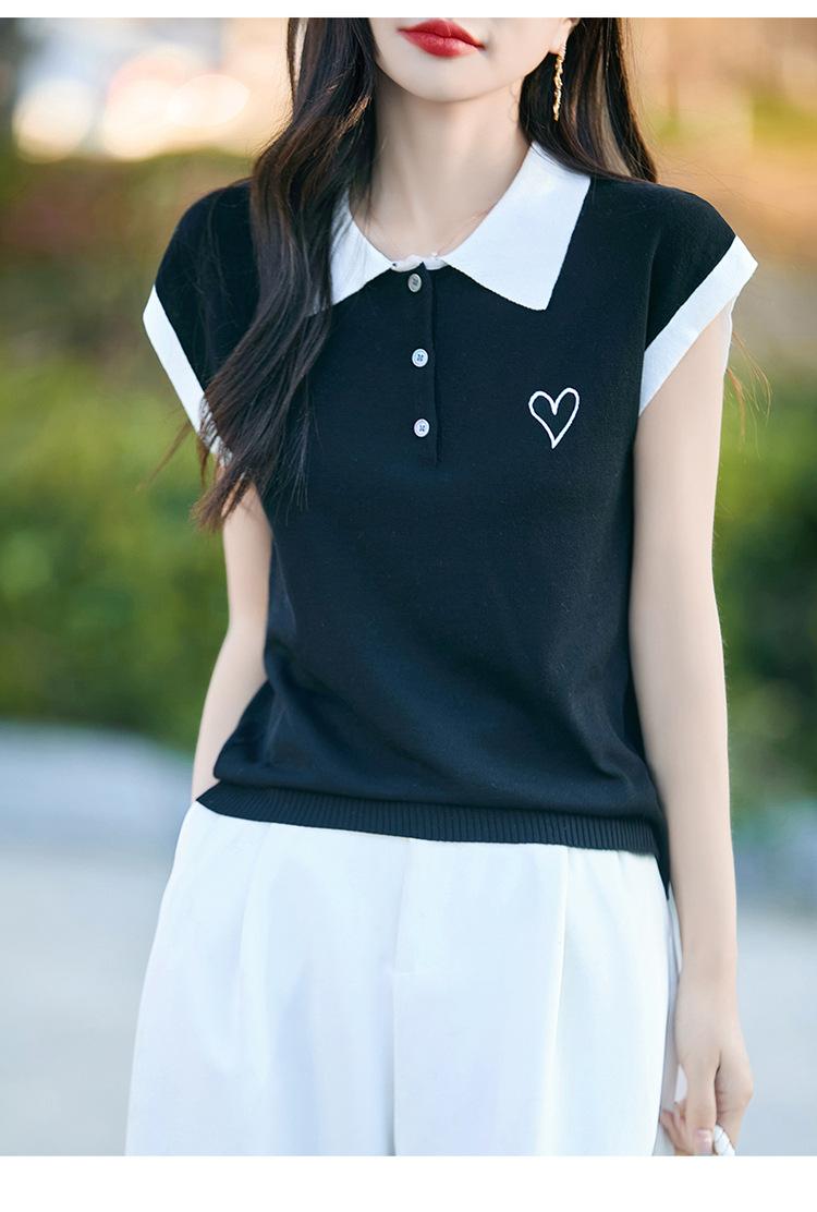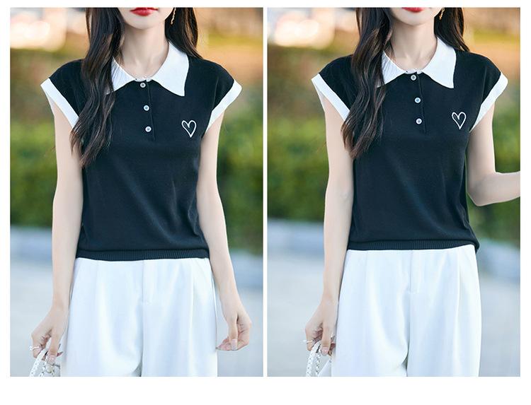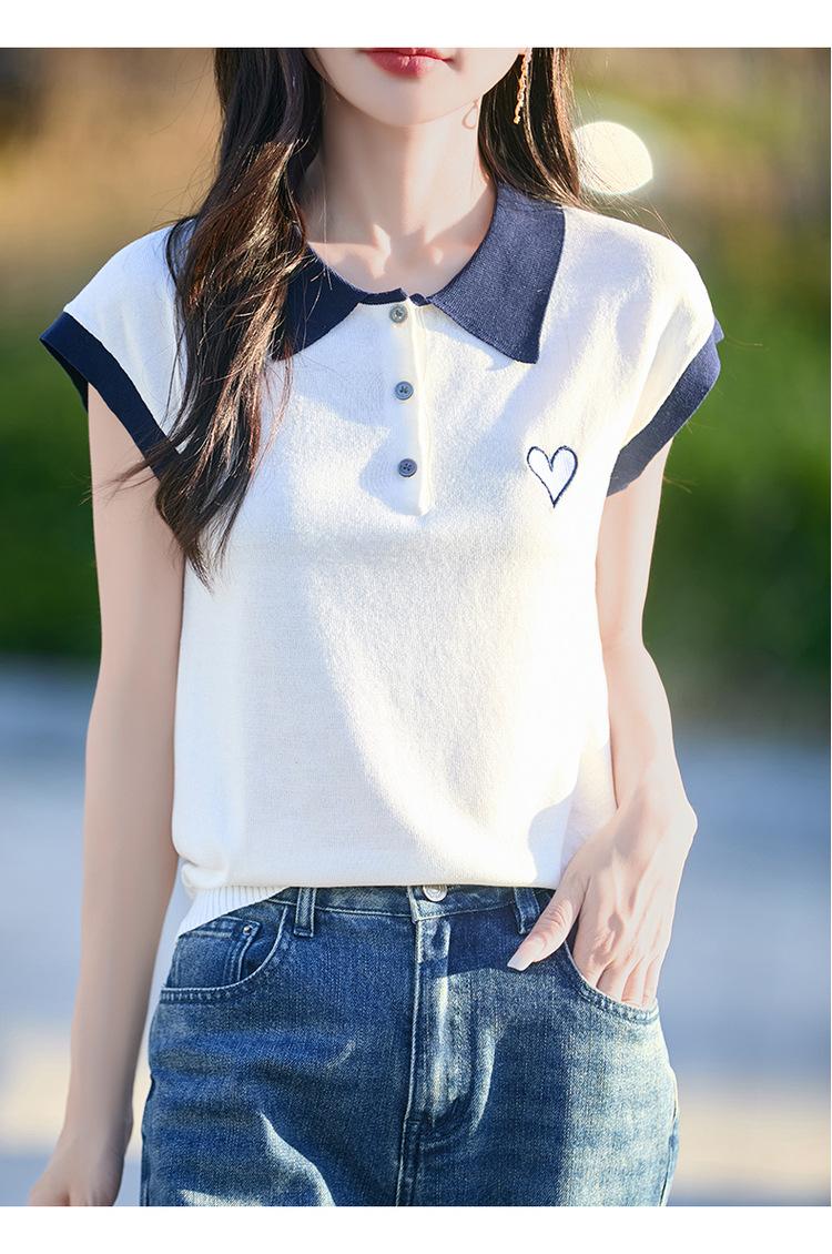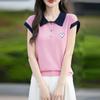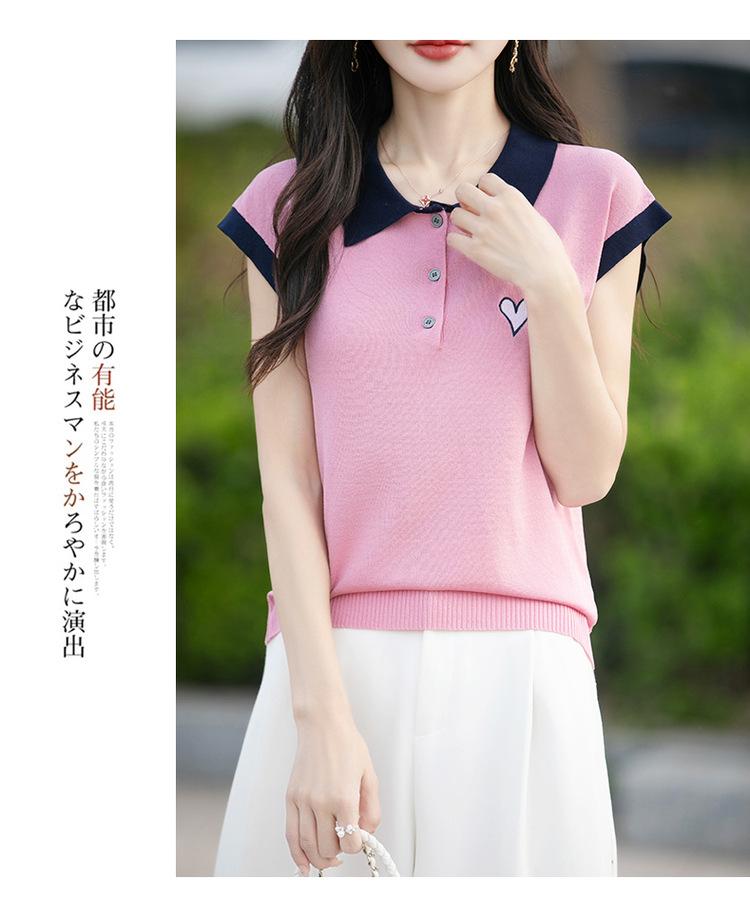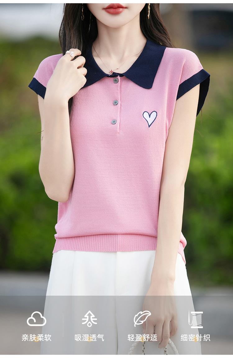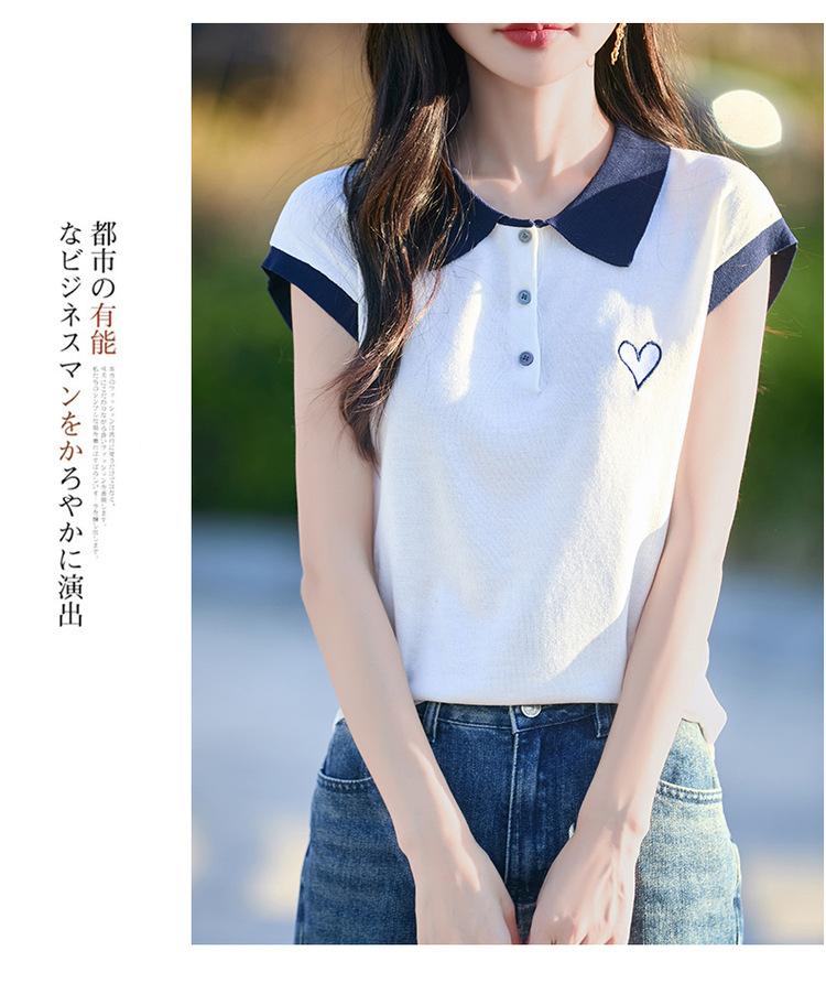 2025 Primavera y Verano Nuevo Tejido de Punto de Seda de Hielo con Cuello Polo Camiseta de Manga Corta para Mujer Combinación de Colores Corazón Holgada Top Jersey