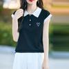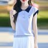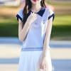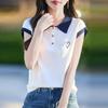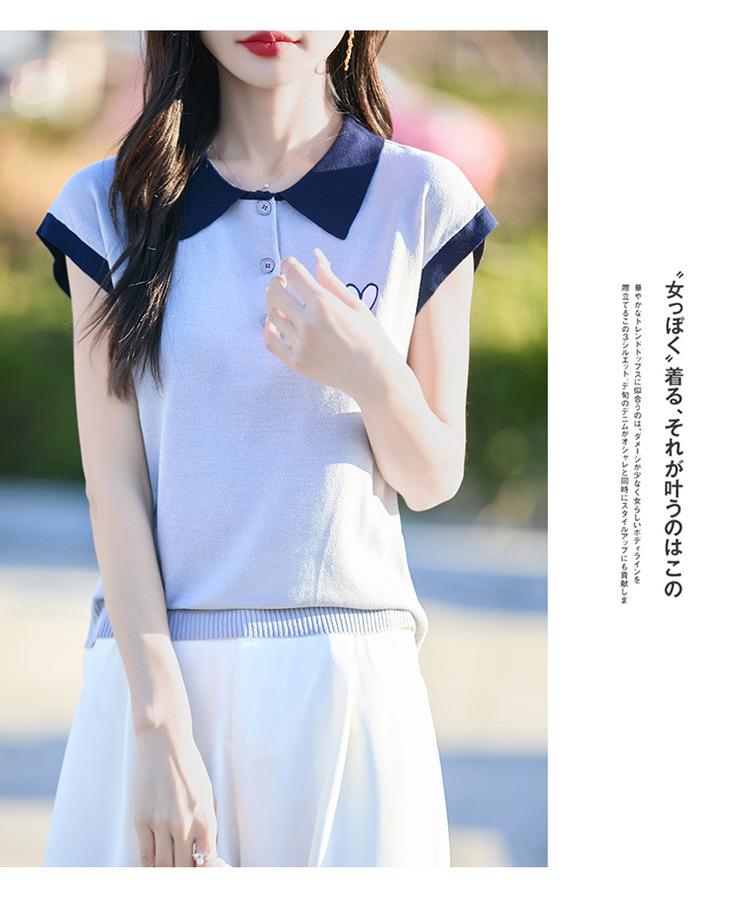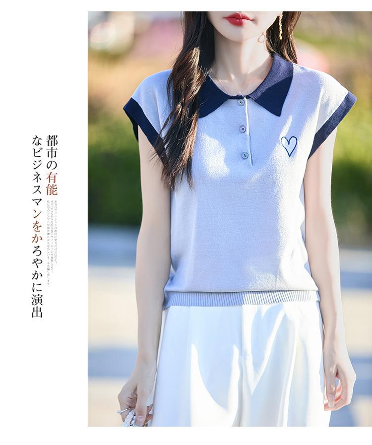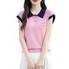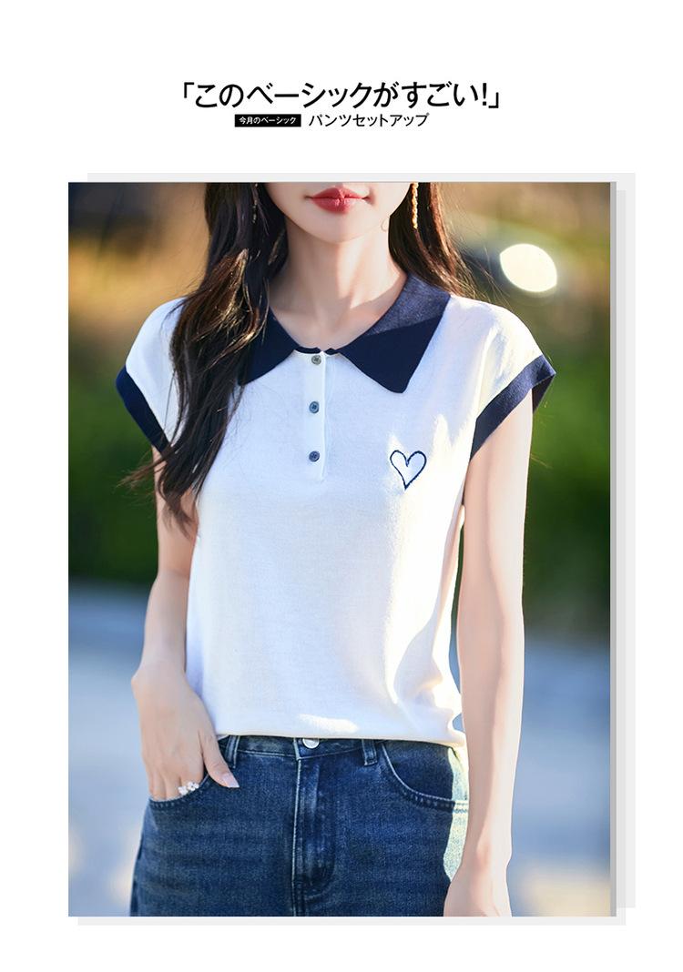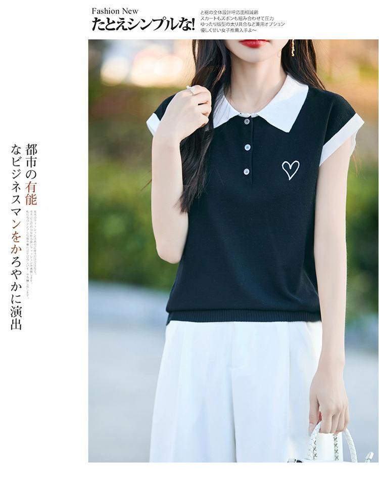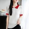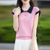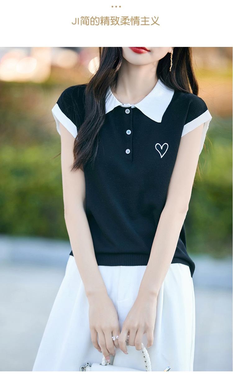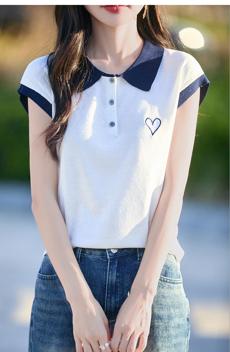 2025 Primavera y Verano Nuevo Tejido de Punto de Seda de Hielo con Cuello Polo Camiseta de Manga Corta para Mujer Combinación de Colores Corazón Holgada Top Jersey