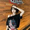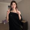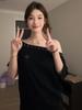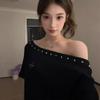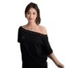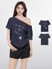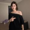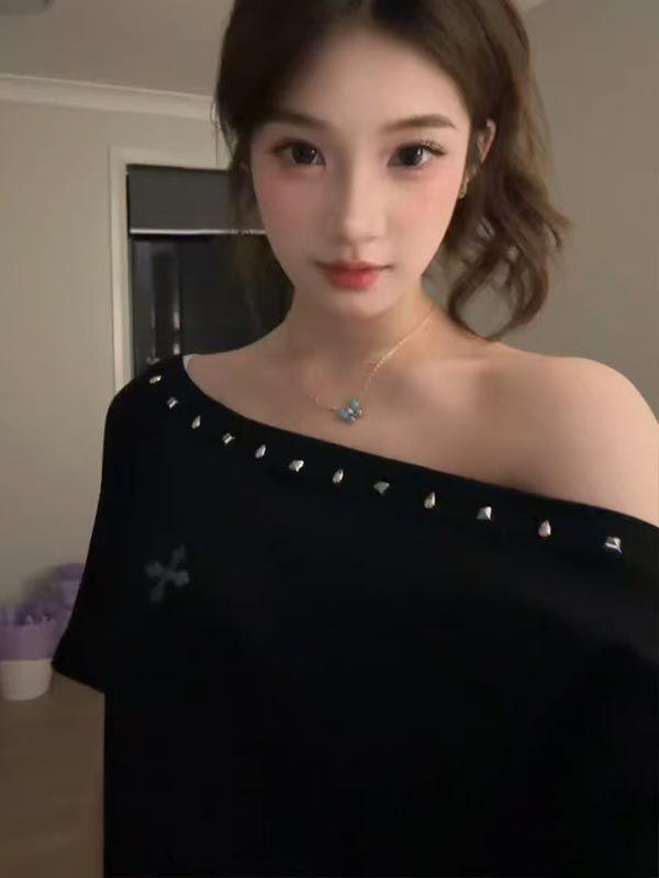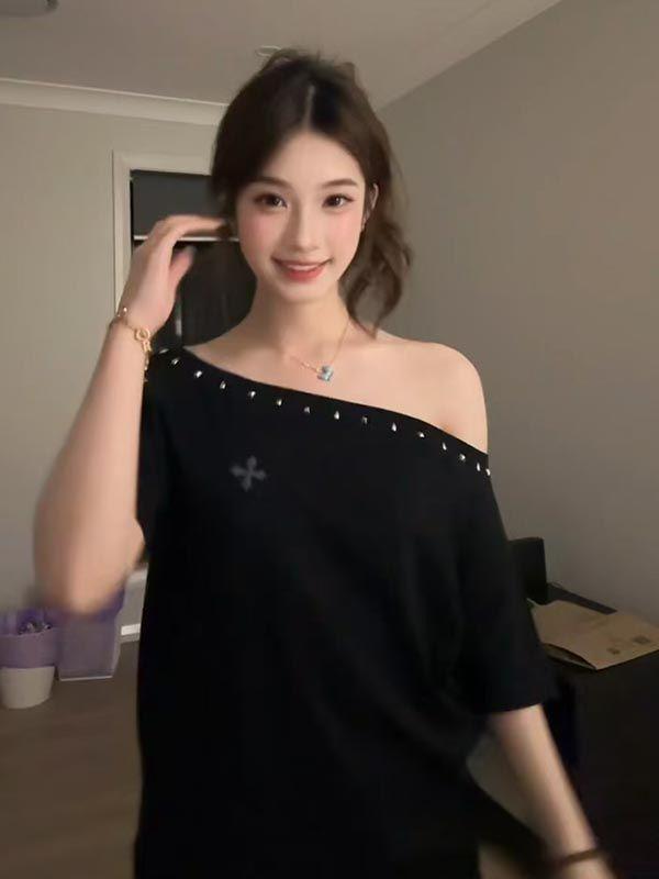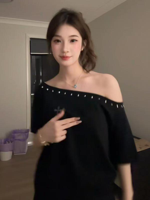 Playera Retro de Sauce Bordada con Diamantes Calientes de Hombro Inclinado y Manga Corta para Mujer Verano Casual Estilo Perezoso Americana Sexy Top Descubierto