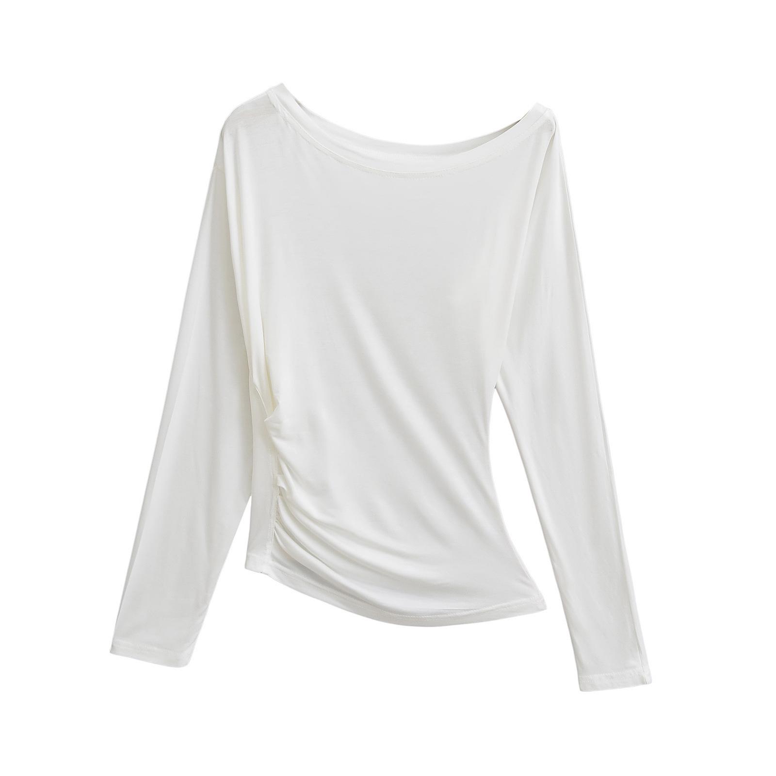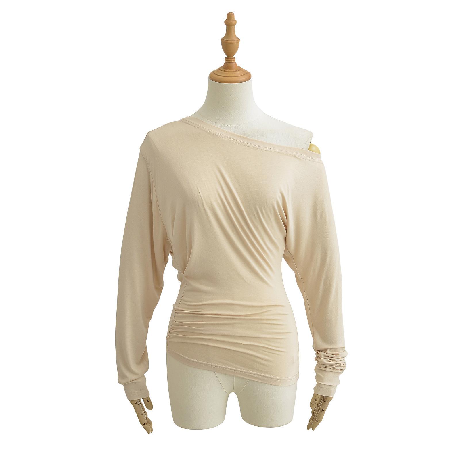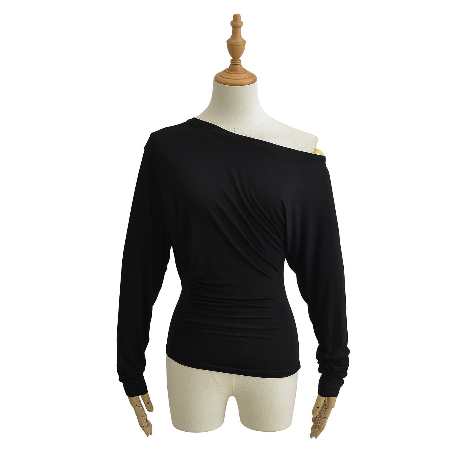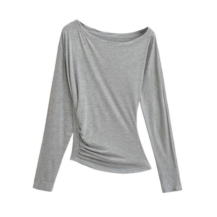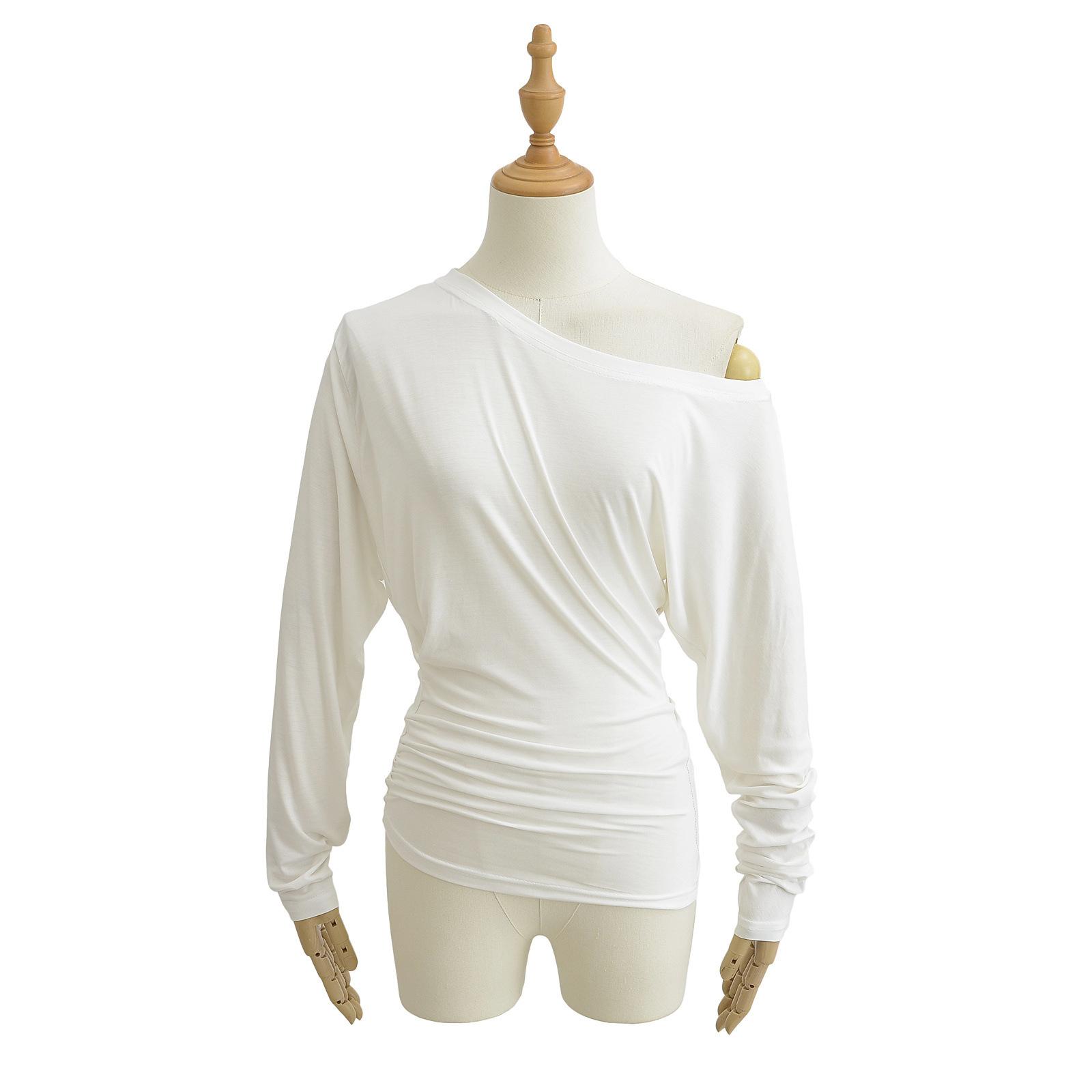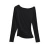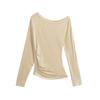 24 Primavera y Otoño Nuevo Camiseta de Manga Larga con Hombro Descubierto Sexy Estilo Spice Girls de Deseo Puro Estilo Lazy con Pliegues Ajustada Estilo Americano para Mujer