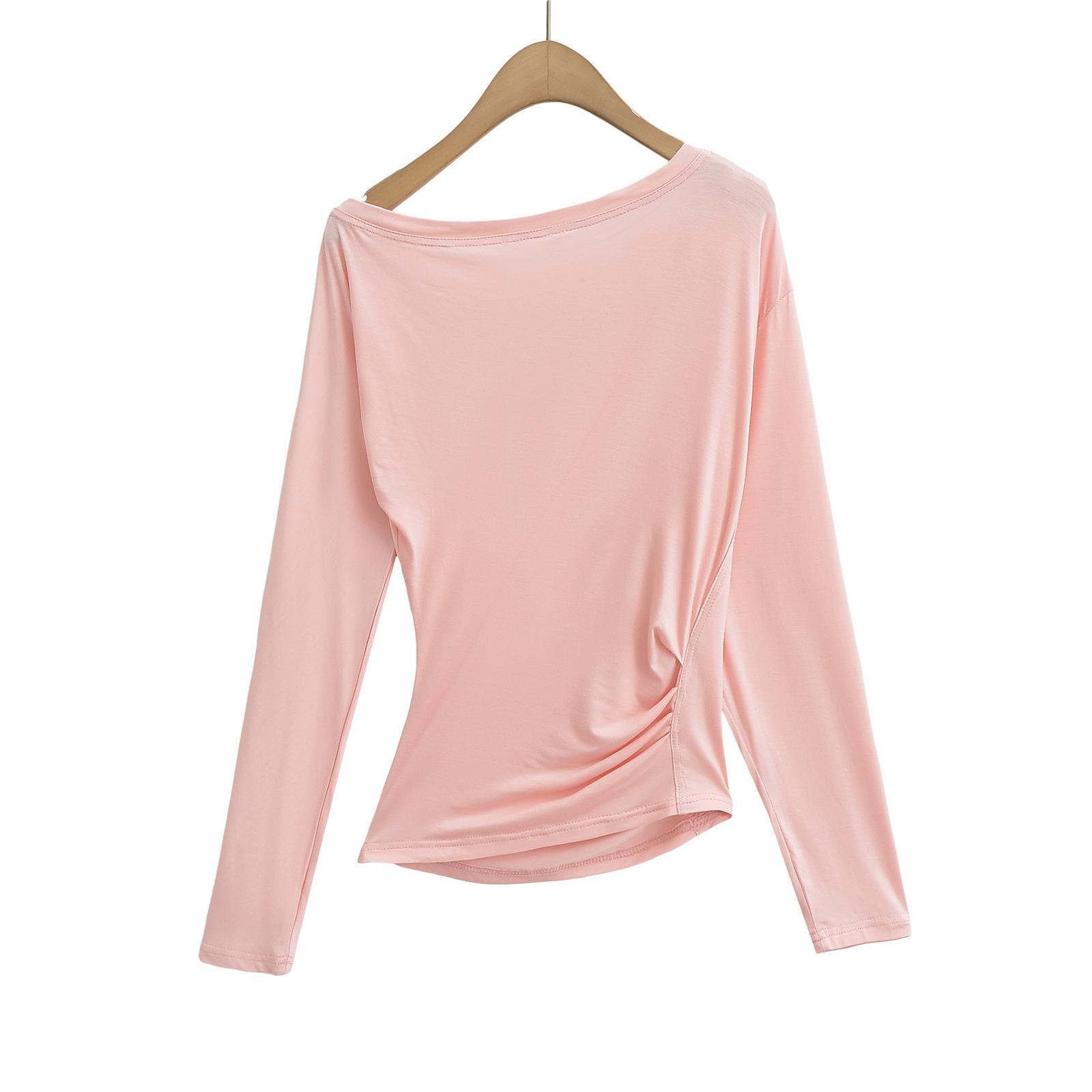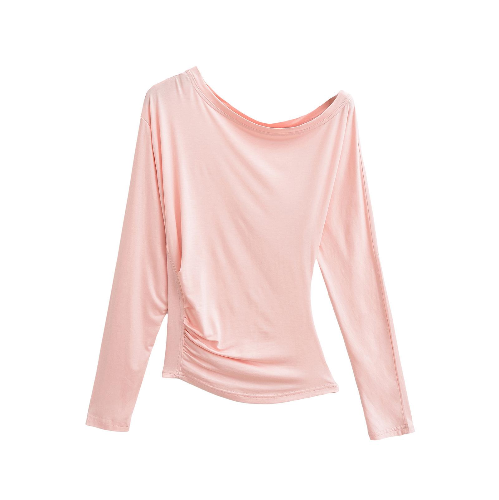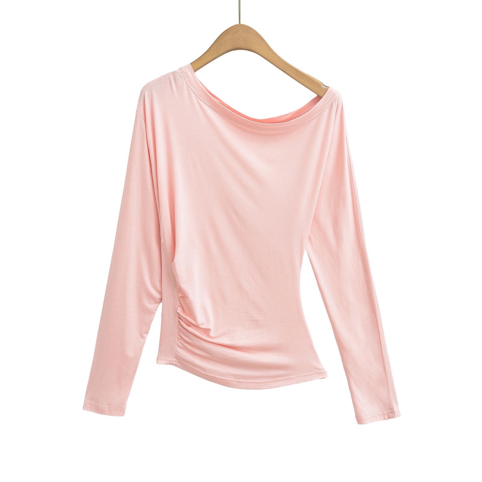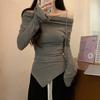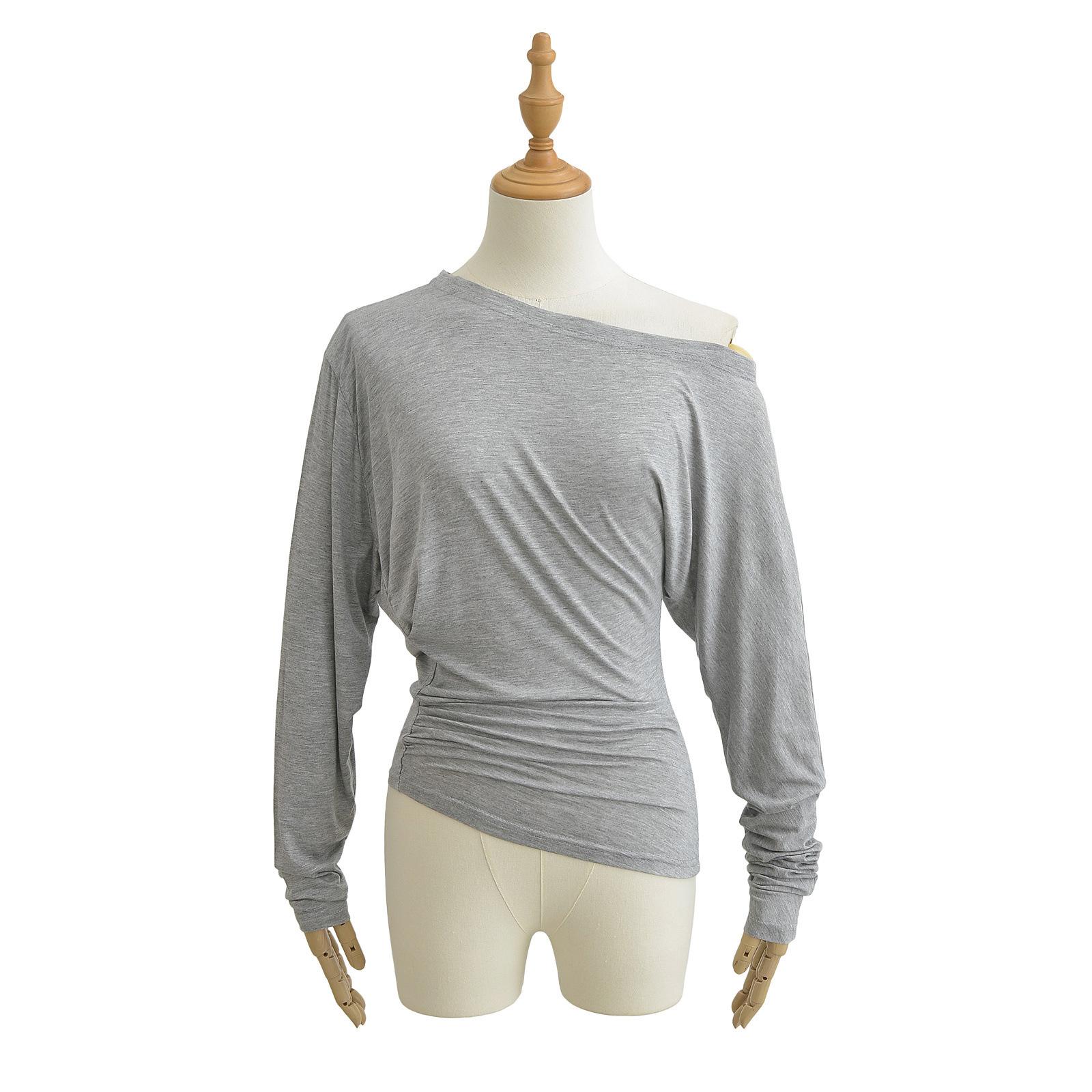 24 Primavera y Otoño Nuevo Camiseta de Manga Larga con Hombro Descubierto Sexy Estilo Spice Girls de Deseo Puro Estilo Lazy con Pliegues Ajustada Estilo Americano para Mujer