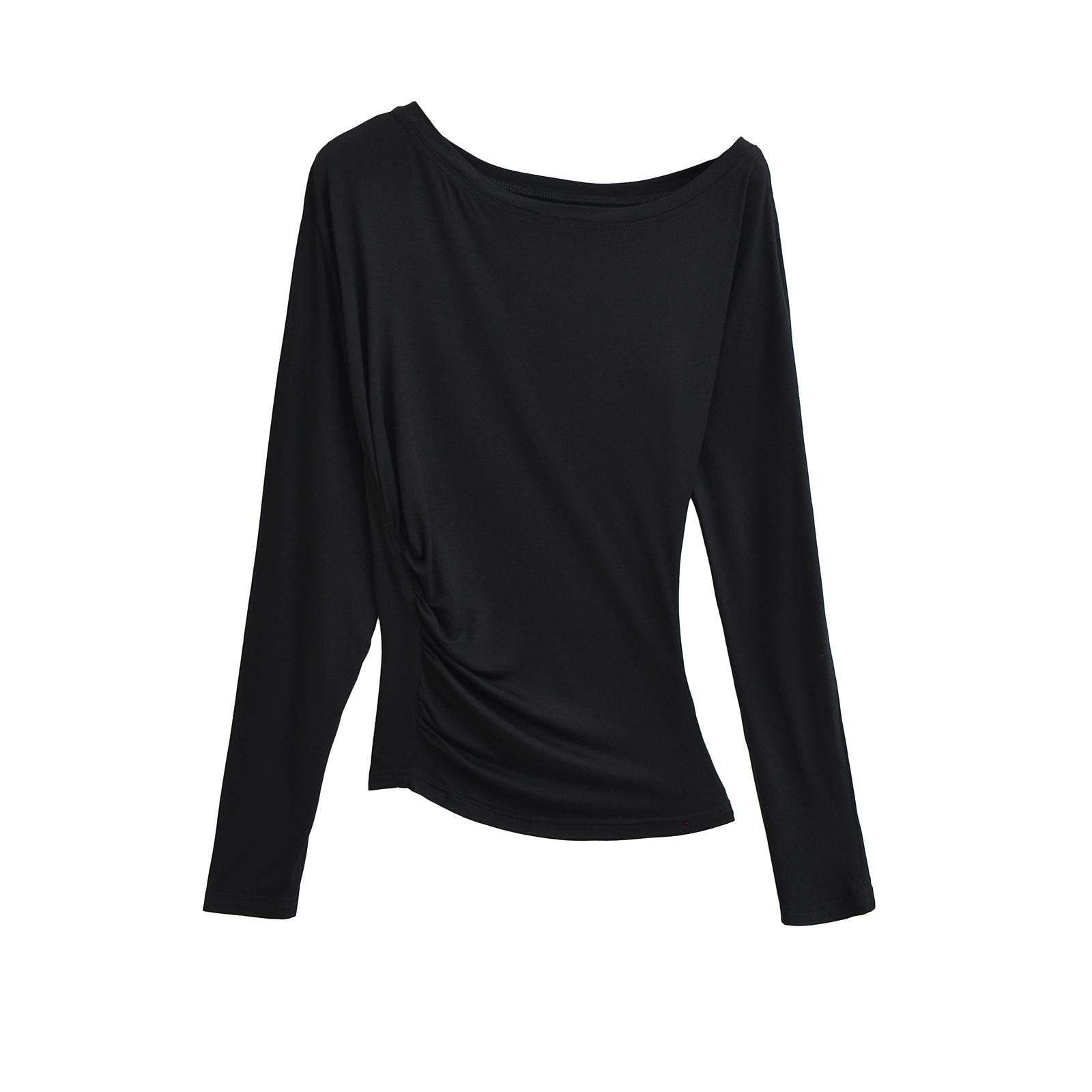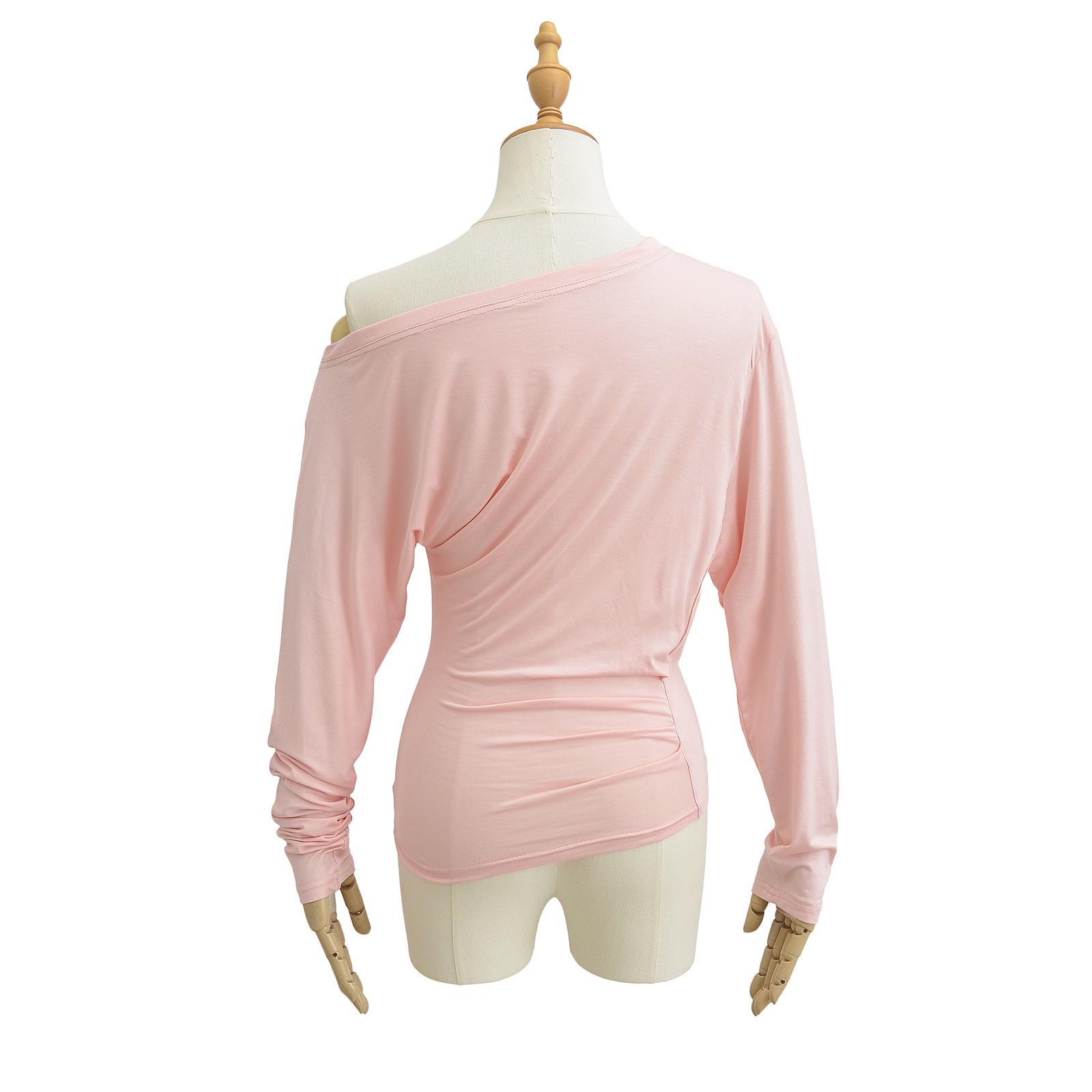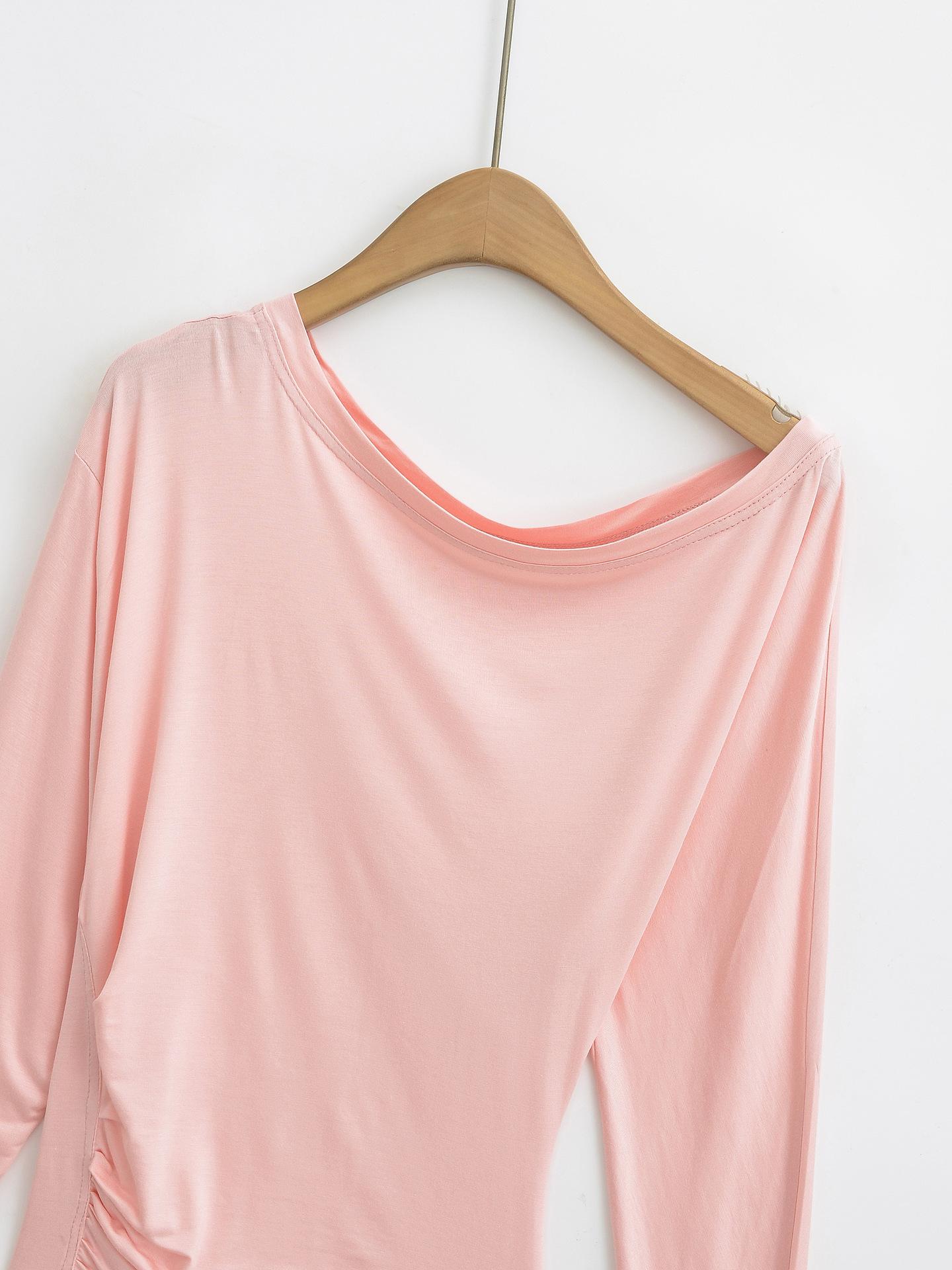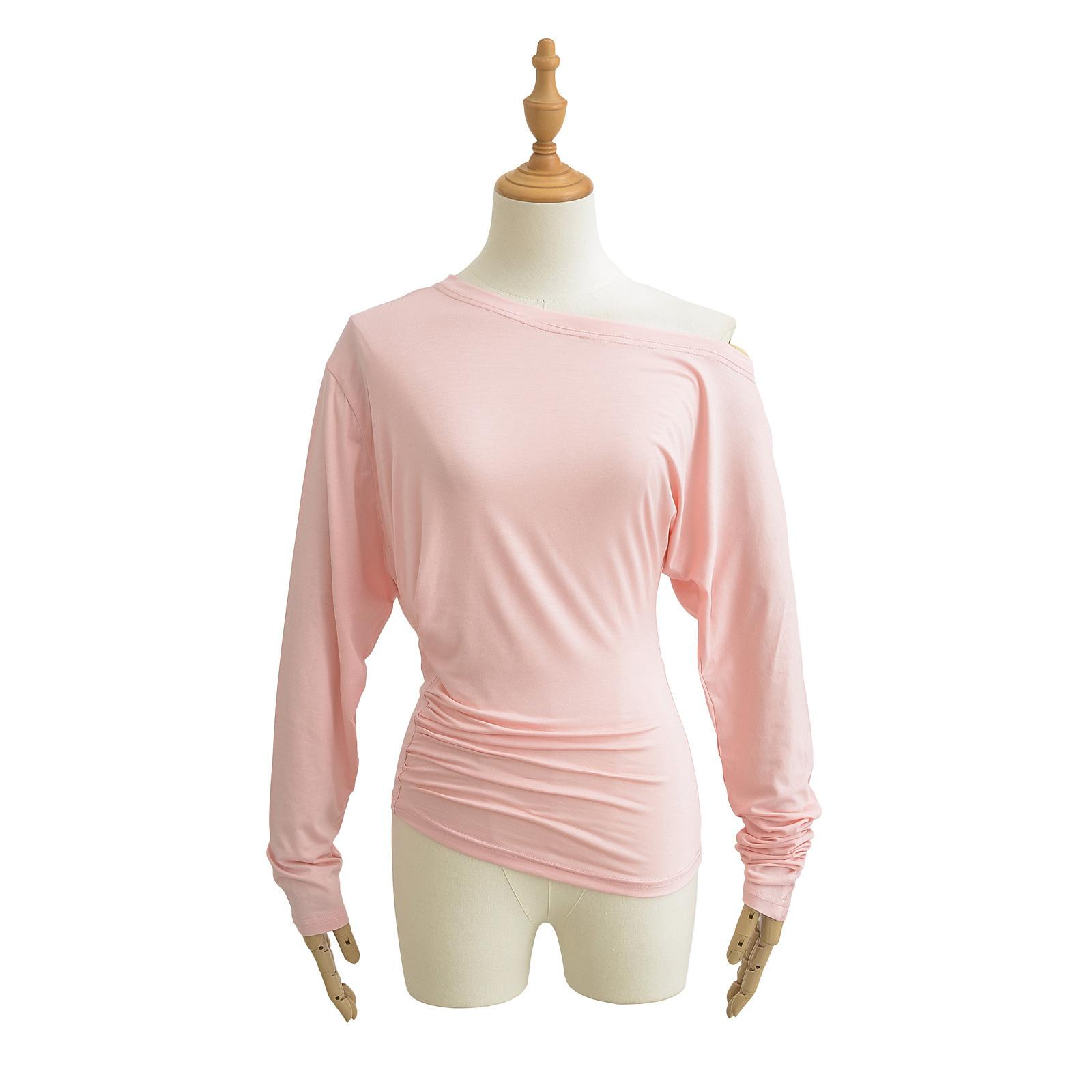 24 Primavera y Otoño Nuevo Camiseta de Manga Larga con Hombro Descubierto Sexy Estilo Spice Girls de Deseo Puro Estilo Lazy con Pliegues Ajustada Estilo Americano para Mujer