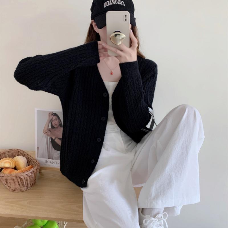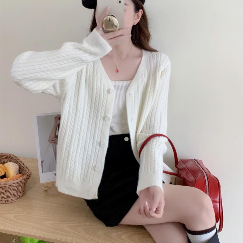 Cárdigan de Punto Trenzado con Temperamento Estilo Coreano Top Nuevo Otoño/Invierno Versátil Adelgazante Suéter Abrigo Ropa de Mujer