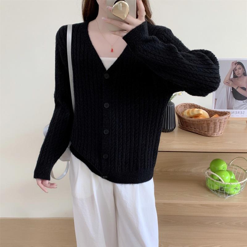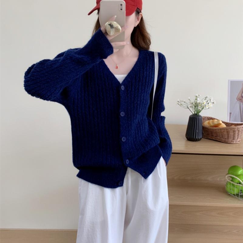 Suéter para mujer estilo coreano con botón de palanca tejido de cable retro cárdigan otoño e invierno nuevo suelto moderno chaqueta de punto para mujer