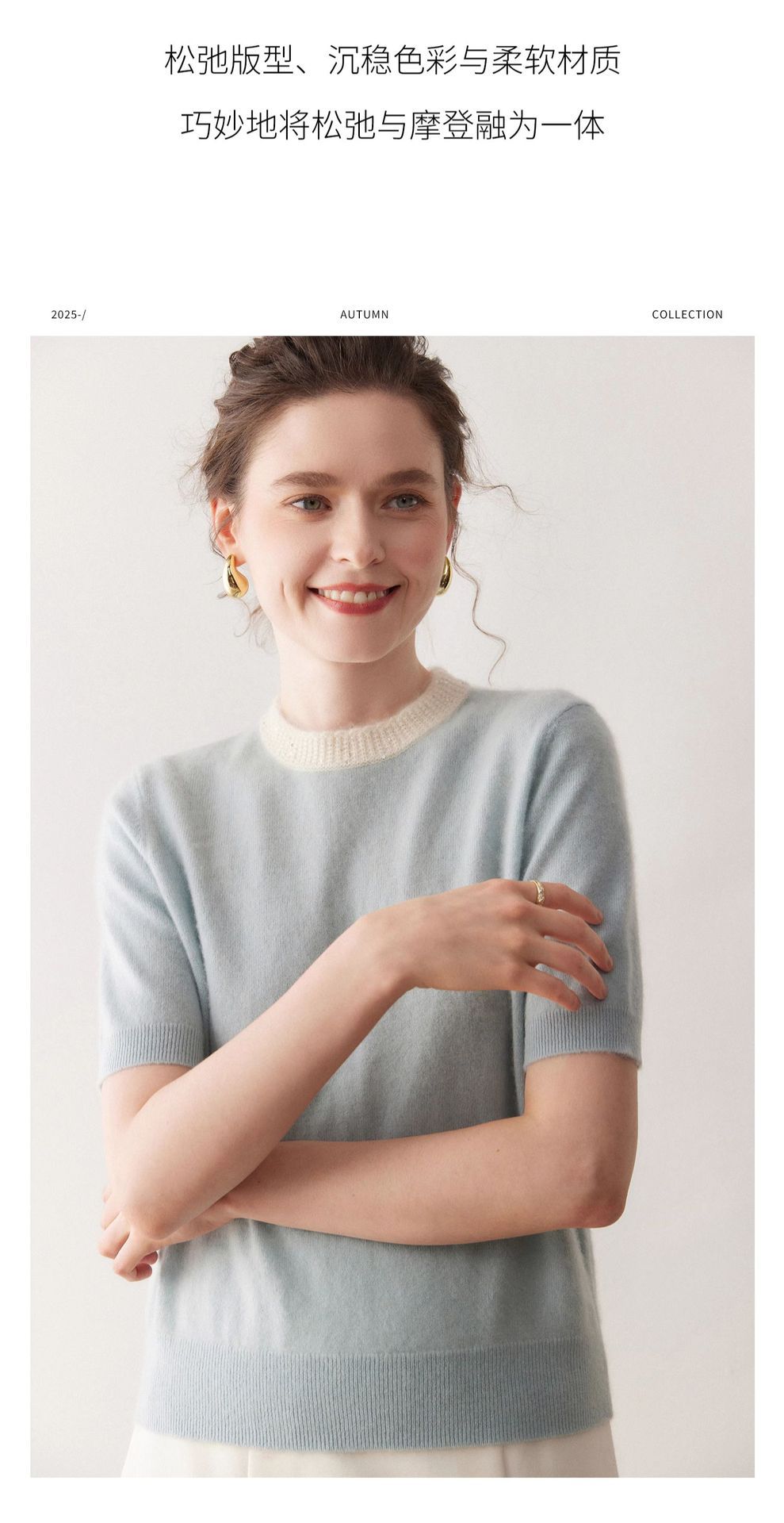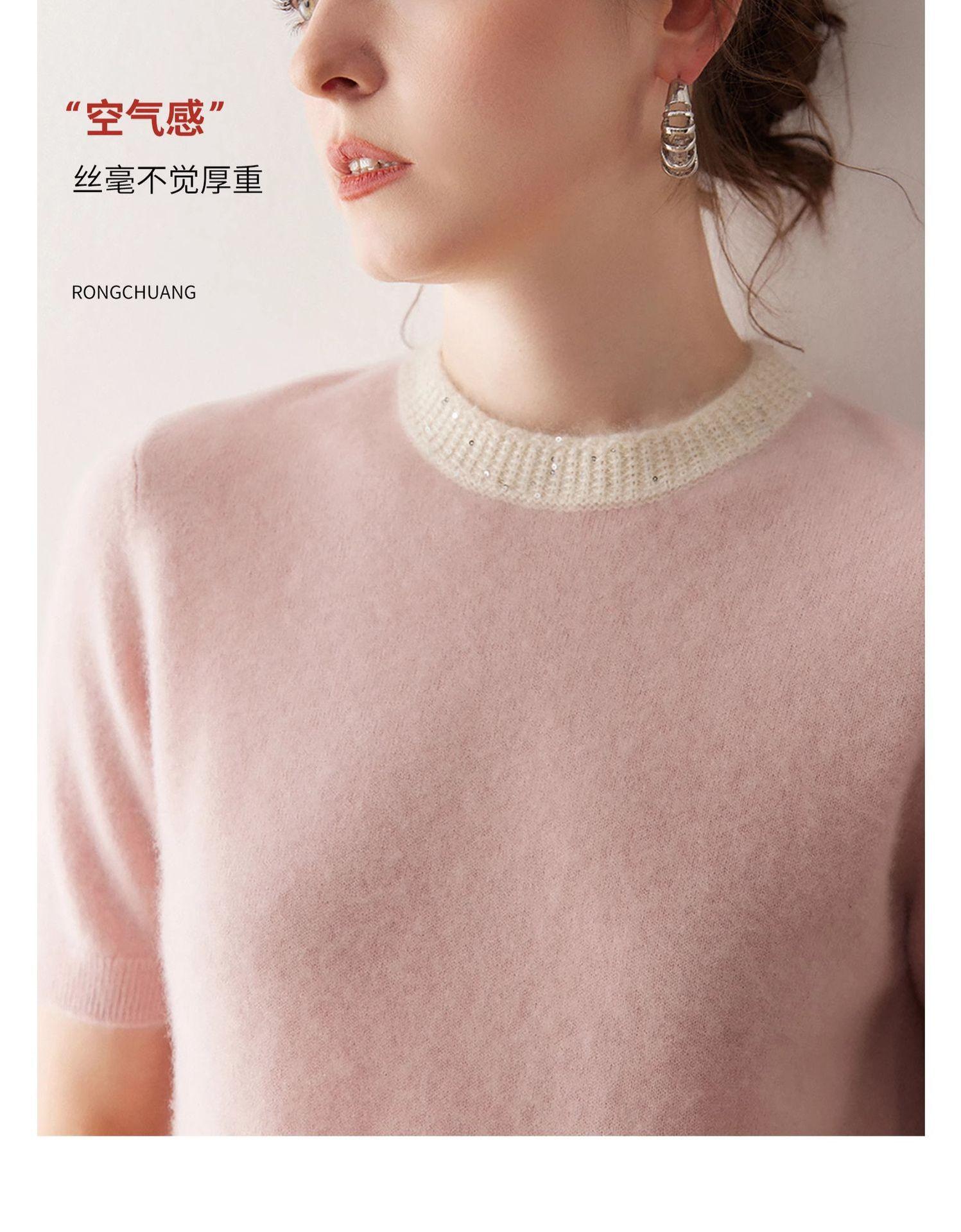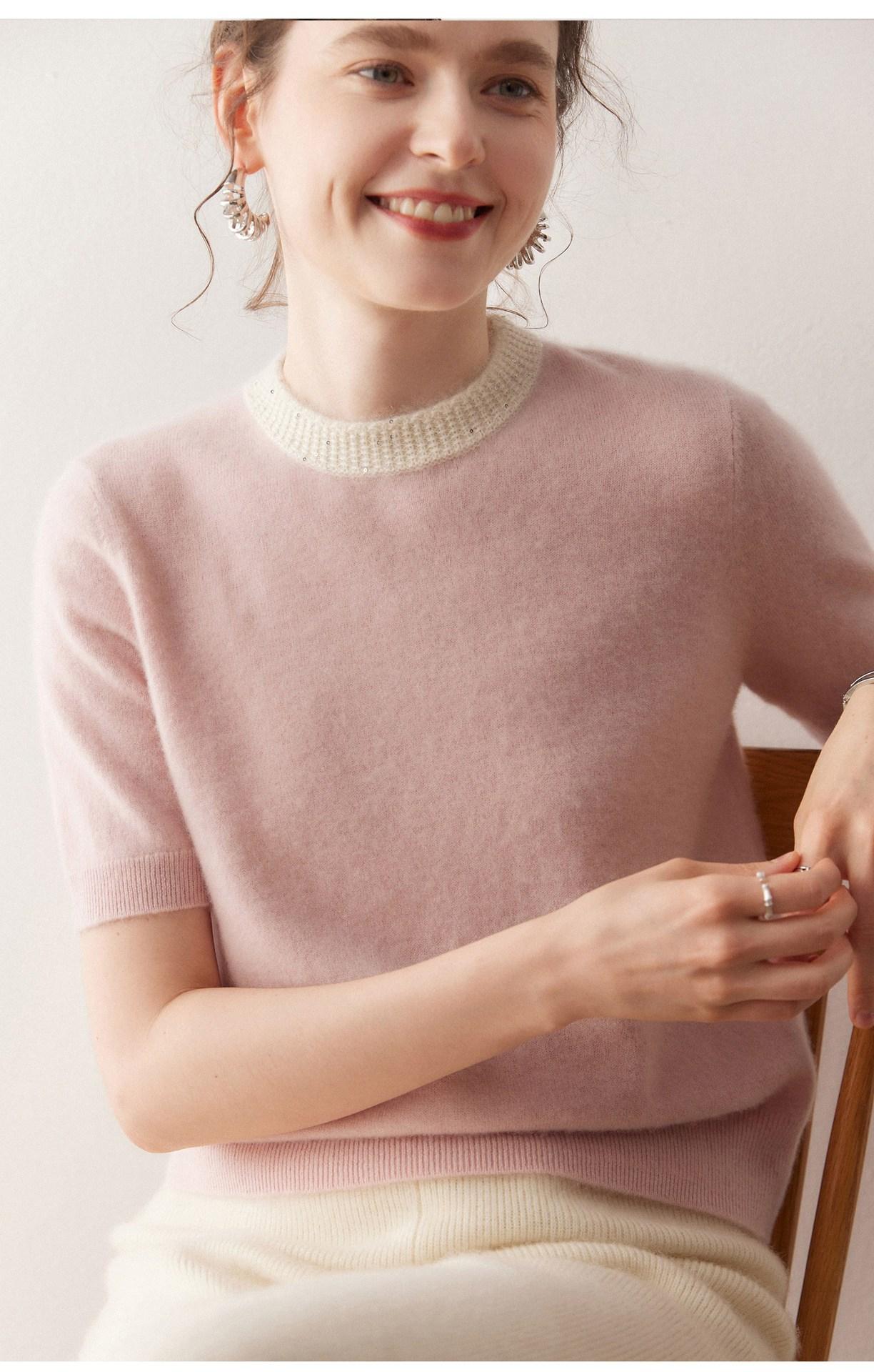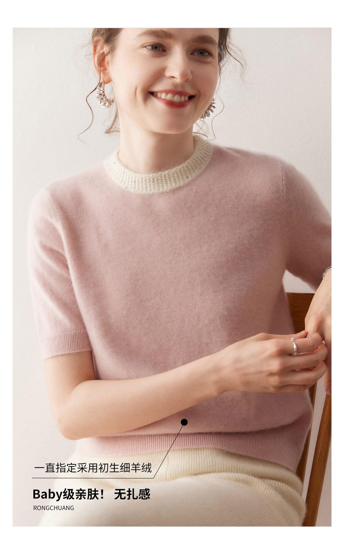 Suéter de Cachemira de Manga Corta con Cuello Redondo y Lentejuelas Color Block para Mujer, Tejido de Punto Suave al Tacto, Otoño/Invierno 2025, Capa Base de Punto de Media Manga